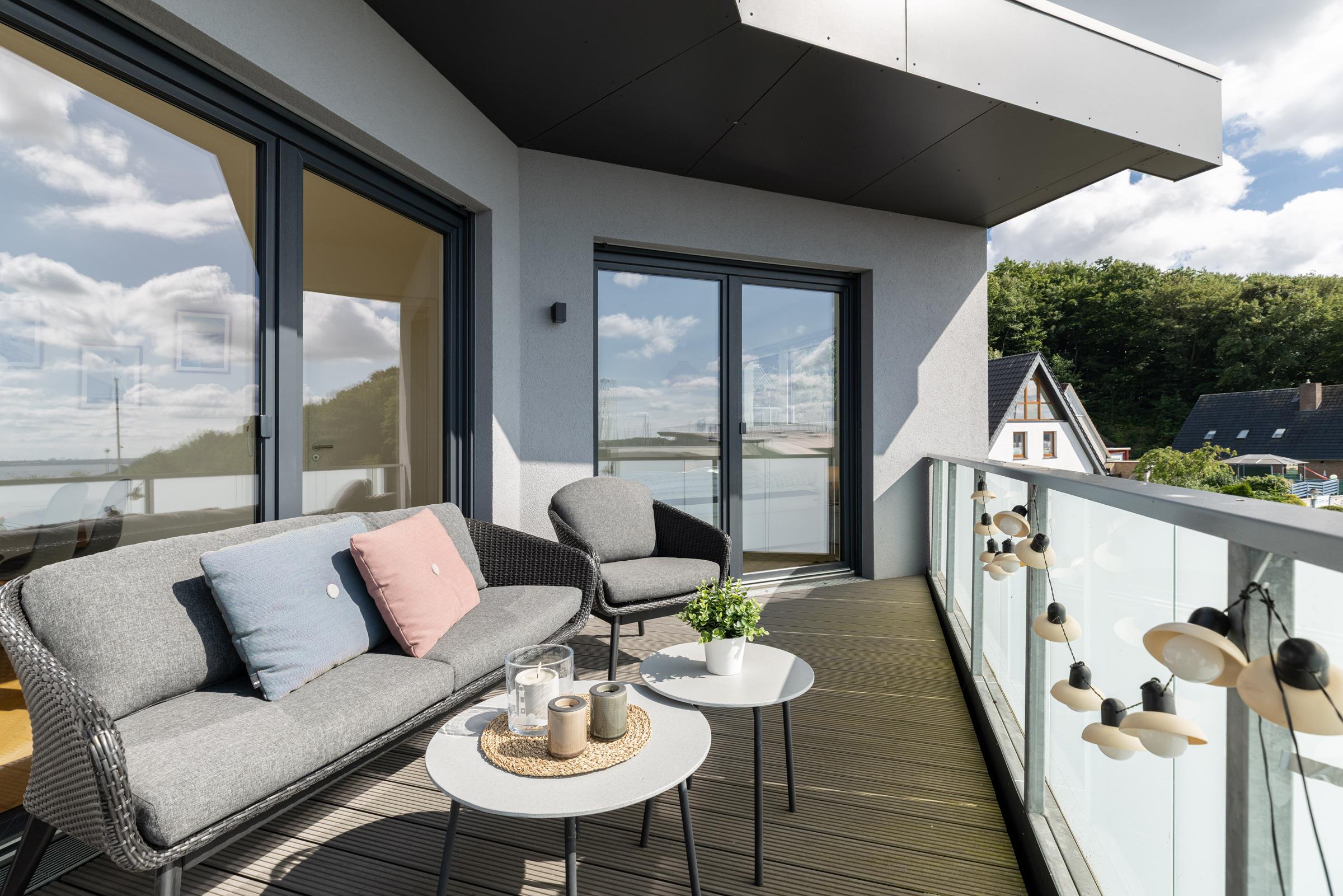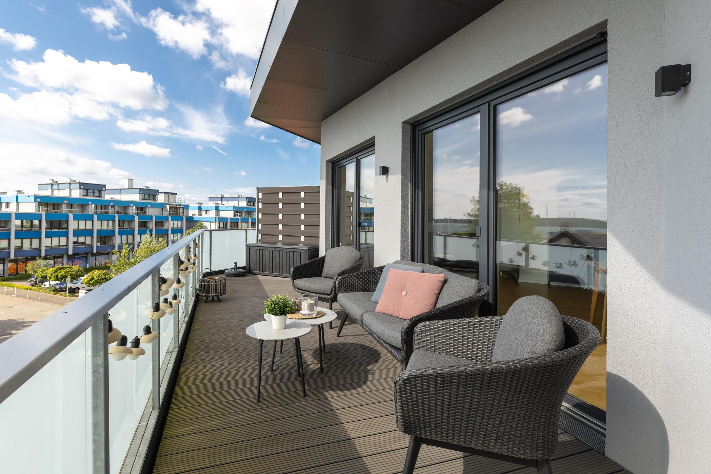 Schon beim Betreten des Seaside werden Sie dank der großen Balkonfensterfront mit einem weiten Fördeblick im großzügigen, kombinierten Wohn-Esszimmer mit offener Einbauküche in Ihrer Urlaubsunterkunft empfangen. Die Küche ist unter anderem mit einem Induktionsherd, Backofen, Kühlschrank mit TK-Fach, Espressomaschine und Kaffeebereiter für frischen Filterkaffee ausgestattet. Auf dem großen, teils überdachten, möblierten Balkon, können Sie entspannte Zeit im Freien verbringen, dabei den unvergleichlichen Blick auf die Kieler Förde sowie traumhafte Sonnenauf- und untergänge genießen.