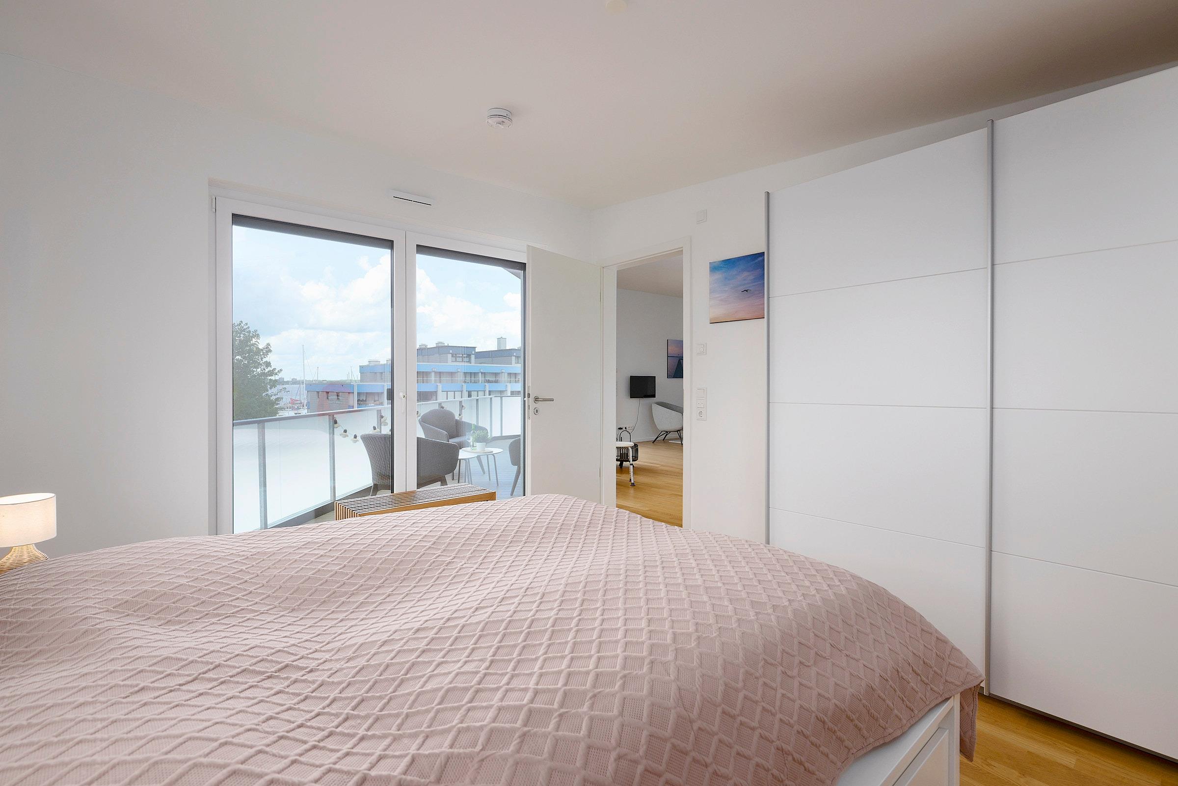 In dem separaten Schlafzimmer mit Balkonzugang befindet sich ein Doppelbett (ca 180 x 200cm) sowie ein Kleiderschrank für Ihre Garderobe. Von hier aus haben Sie neben dem Blick auf die Kieler Förde und die Marina auch einen schönen Blick auf den bewaldeten Fördewanderweg Richtung Heikendorf.