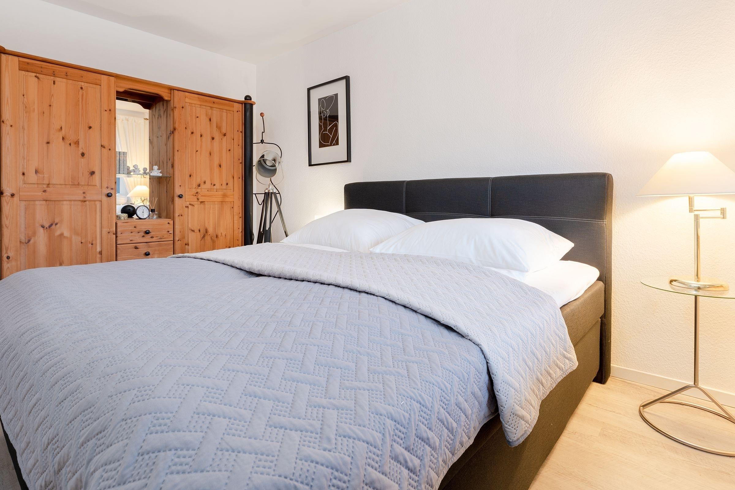 Schlafzimmer: Doppelbett (ca. 180x200 cm), Kleiderschrank, Verdunkelung: Innen-Jalousie, Platz für Kinderreisebett vorhanden