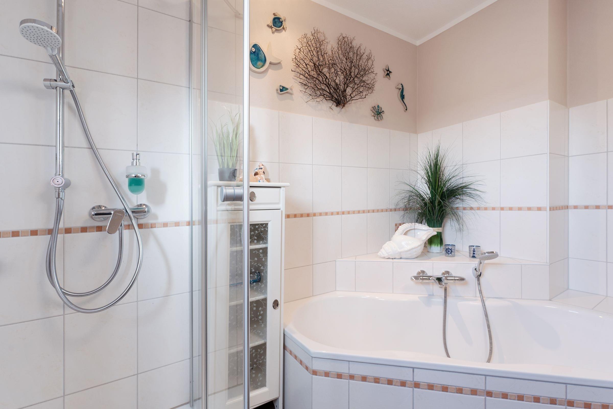 Die separate, sehr gut ausgestattete Küche mit Kochinsel und Induktionsherd lädt zum gemeinsamen Kochen ein. Von hier aus haben Sie ebenfalls Meerblick. Auf den Schlafkomfort wurde großer Wert gelegt: Ein Schlafzimmer ist mit einem hochwertigen Polsterbett (2x 90x190 cm, 7-Zonen-Taschenfederkern) ausgestattet, im zweiten erwartet Sie ein bequemes Boxspringbett (2x 90x190 cm). Von einem Schlafzimmer haben Sie direkten Zugang zum begehbaren Kleiderschrank. Das großzügige Badezimmer verfügt über eine flache Duschkabine, eine Regendusche sowie eine Badewanne. Ein Gäste-WC sowie ein Abstellraum mit Waschmaschine, Trockner und Bügelbrett ("Waschcenter") komplettieren den Komfort.