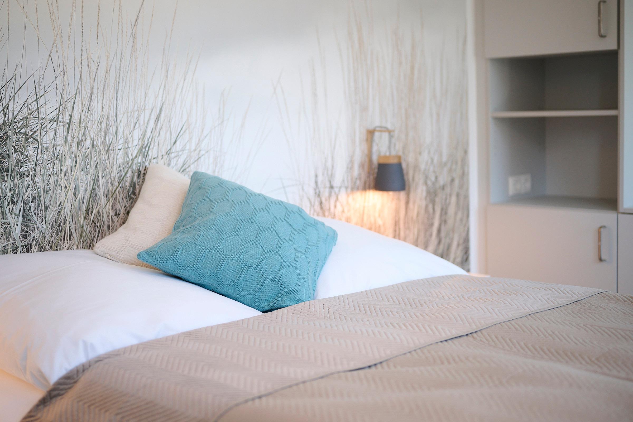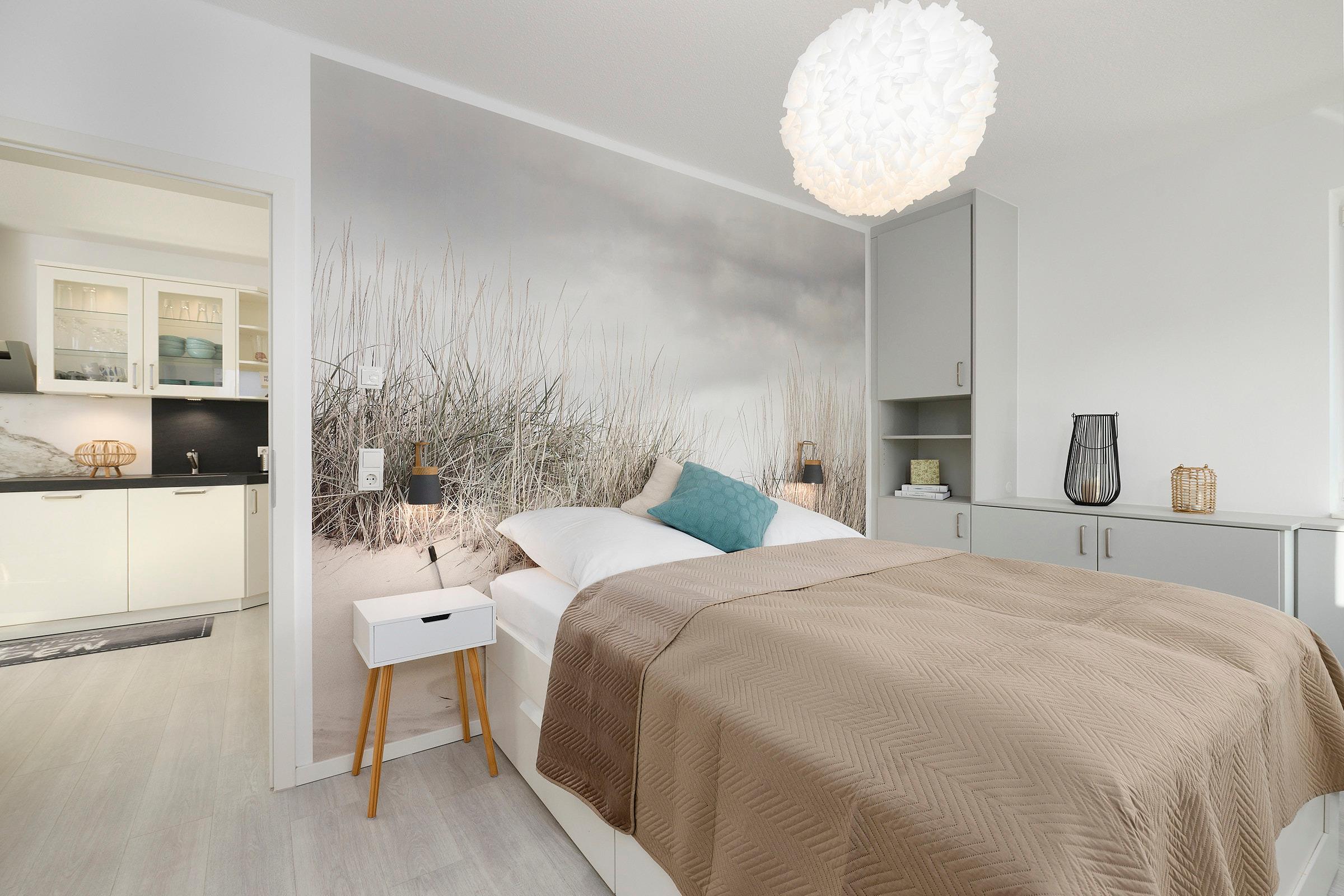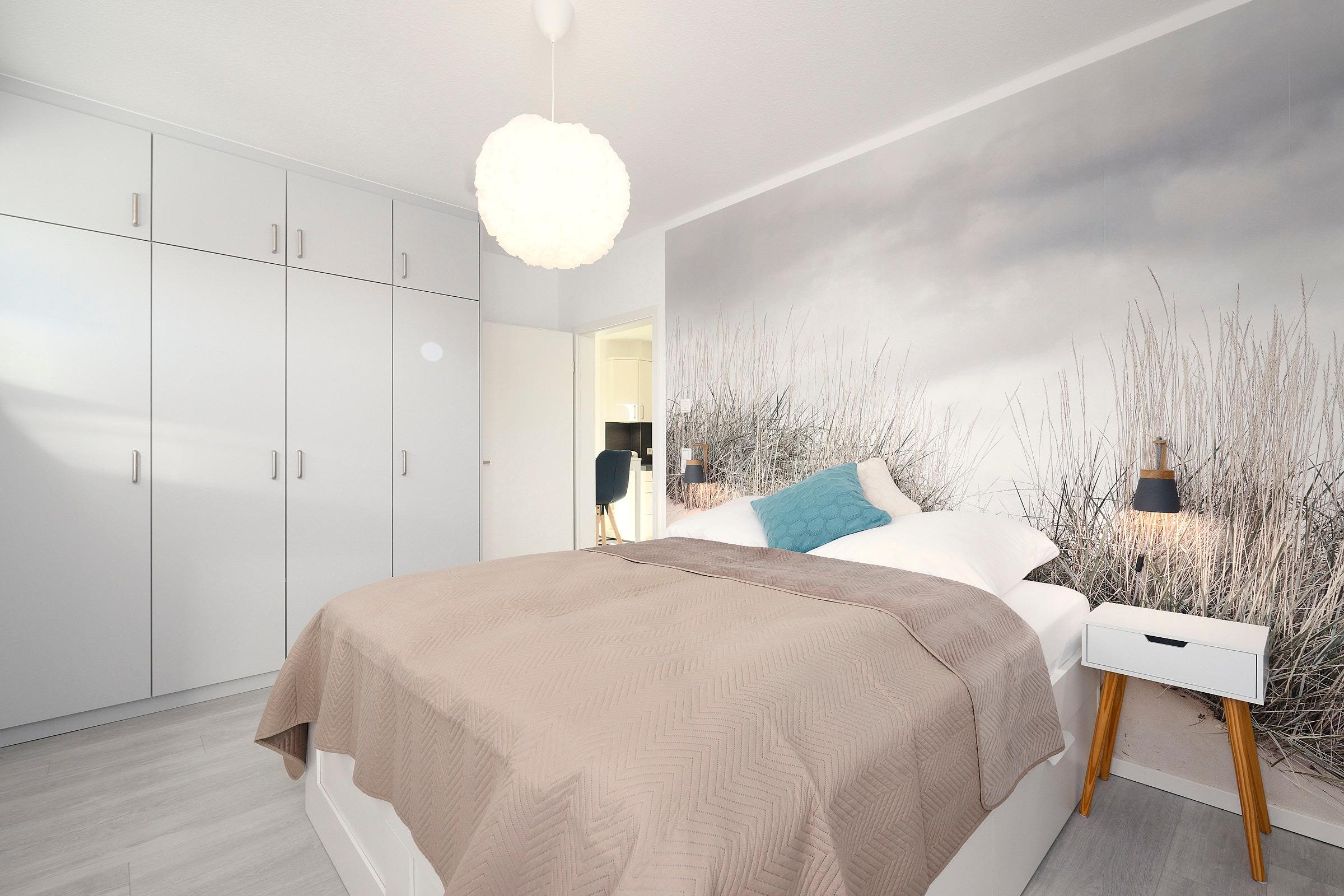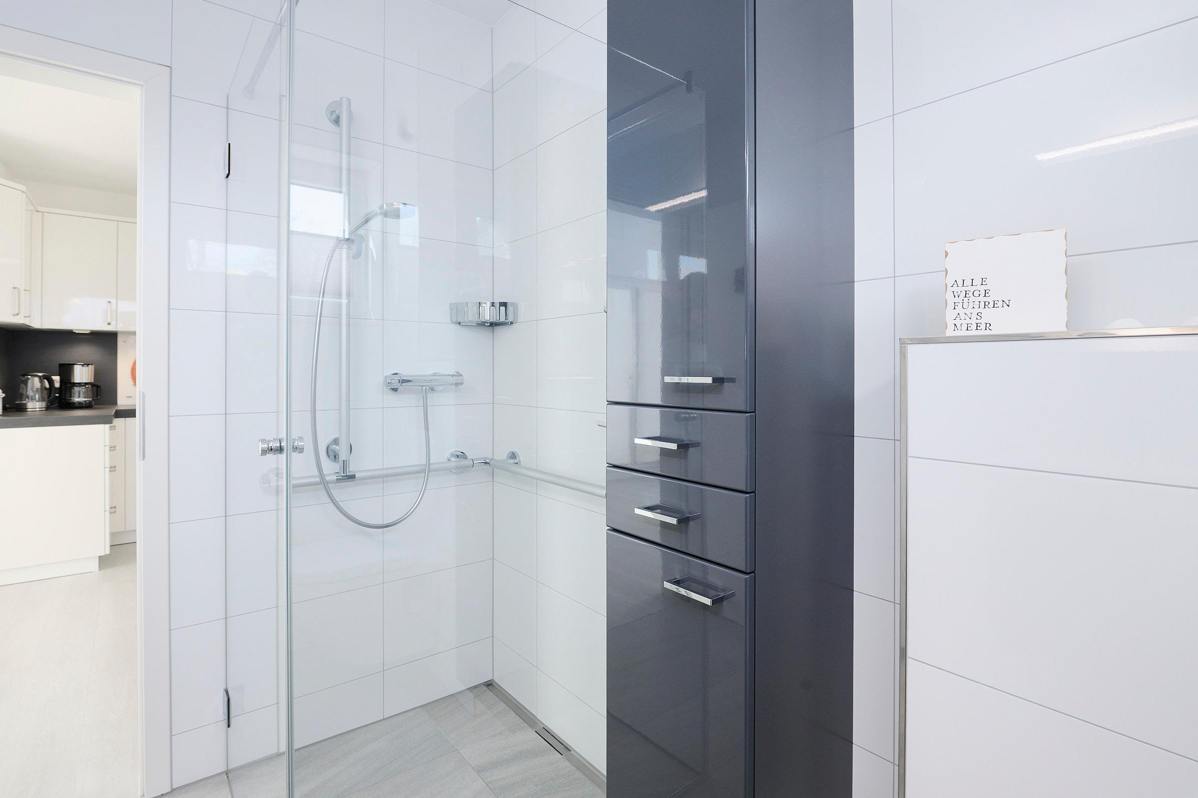 Das Schlafzimmer ist mit einem komfortablen Doppelbett eingerichtet und bietet erholsame Ruhe. Im Bad erwartet Sie eine bodengleiche Dusche mit Haltegriff, ein Handtuchheizkörper, WC und ein Waschbecken – alles modern gestaltet.