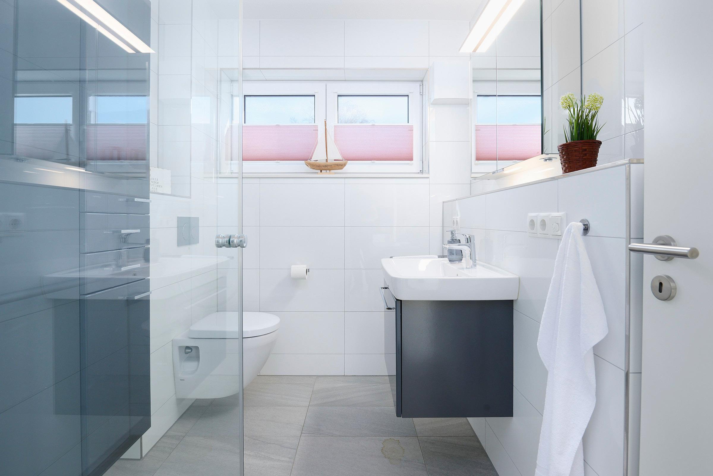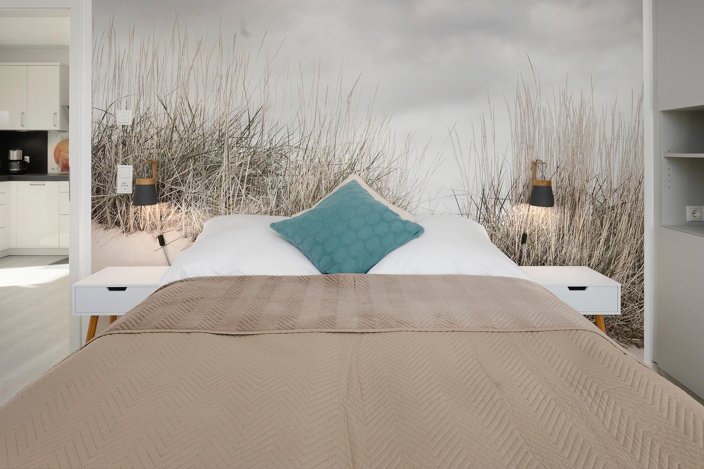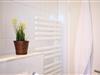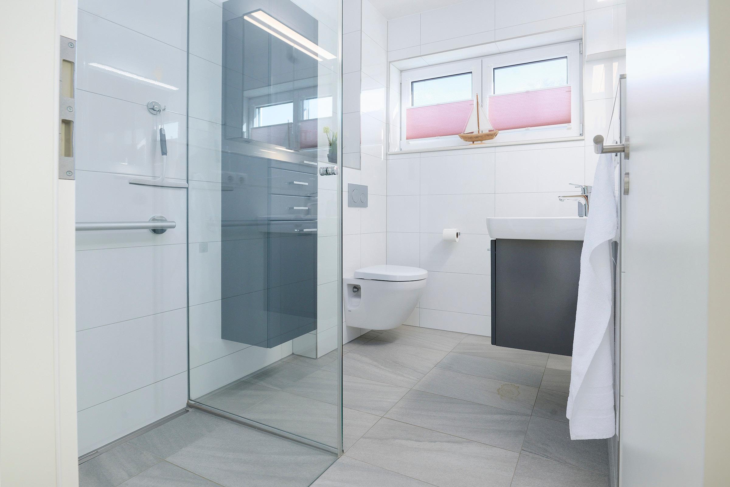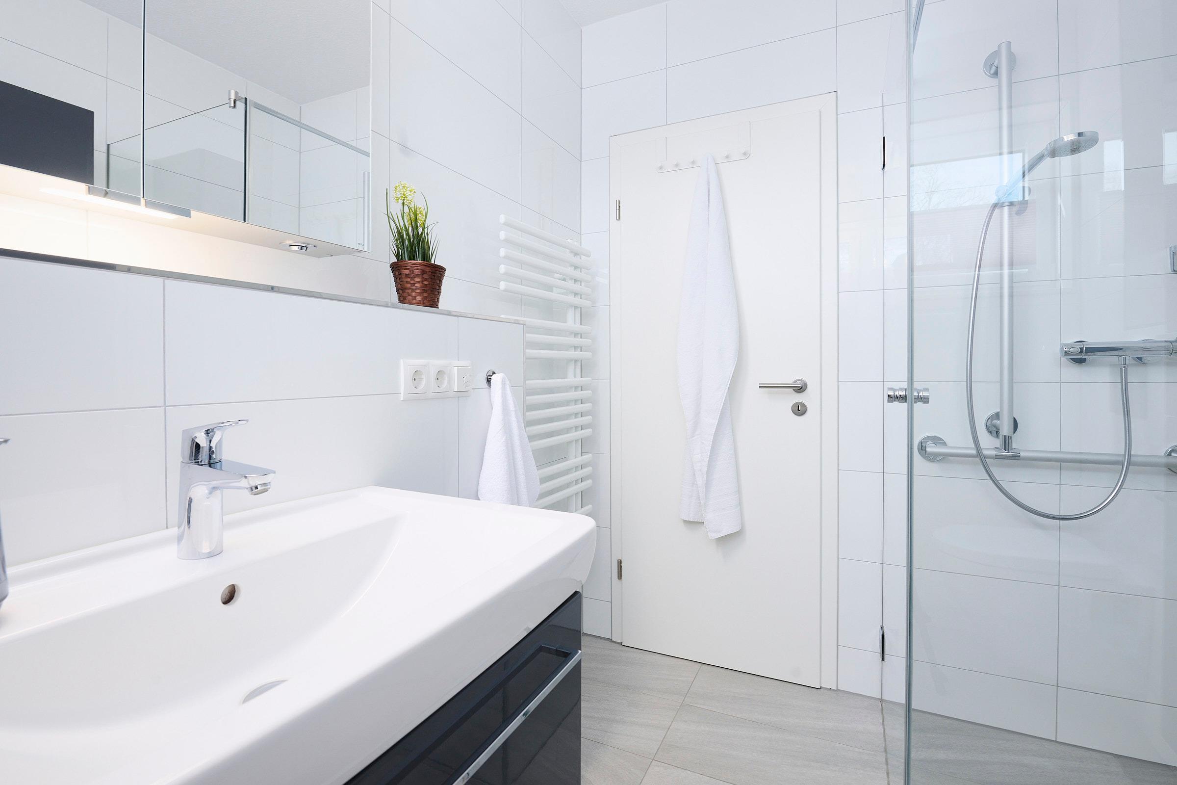 Das Schlafzimmer ist mit einem komfortablen Doppelbett eingerichtet und bietet erholsame Ruhe. Im Bad erwartet Sie eine bodengleiche Dusche mit Haltegriff, ein Handtuchheizkörper, WC und ein Waschbecken – alles modern gestaltet.