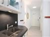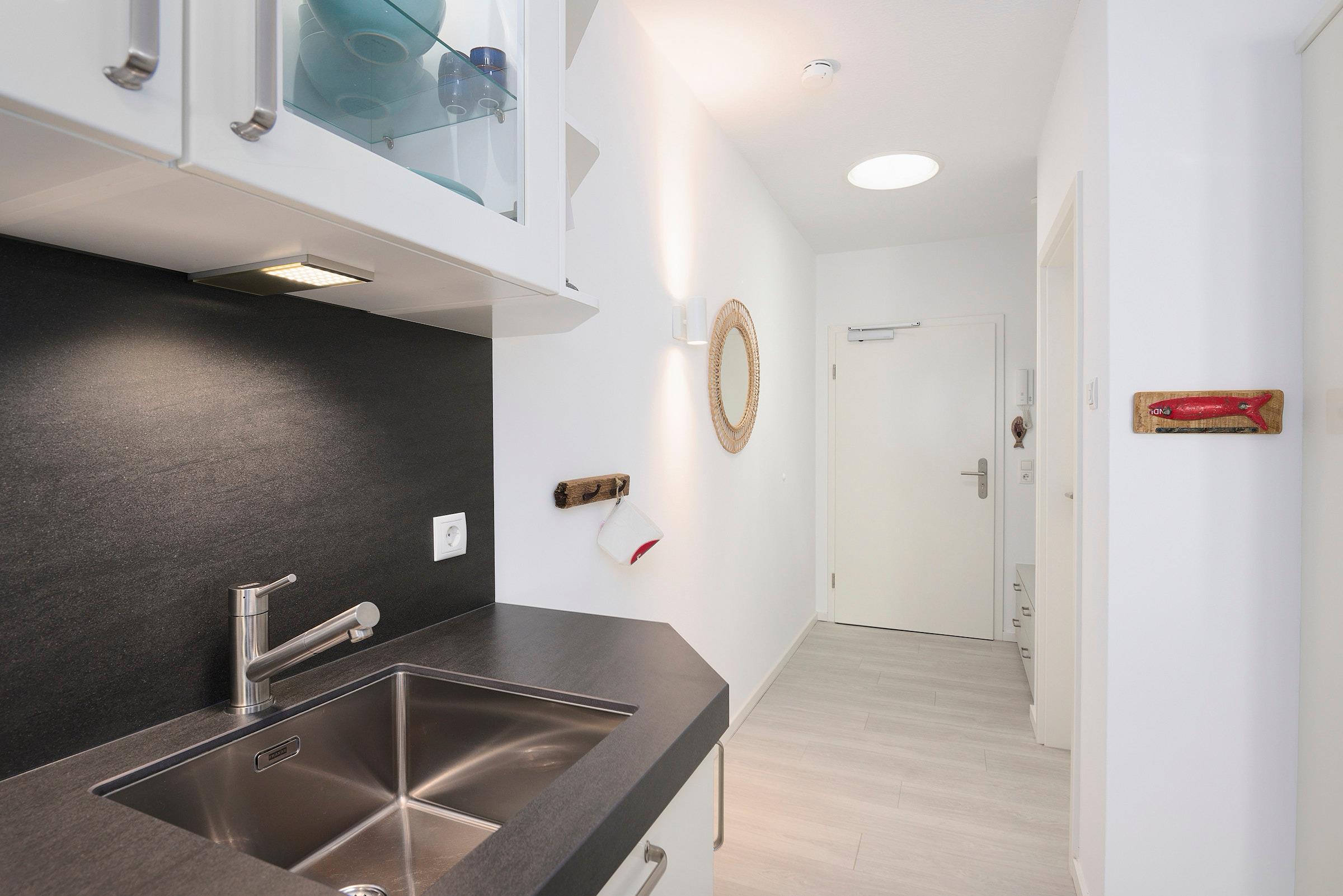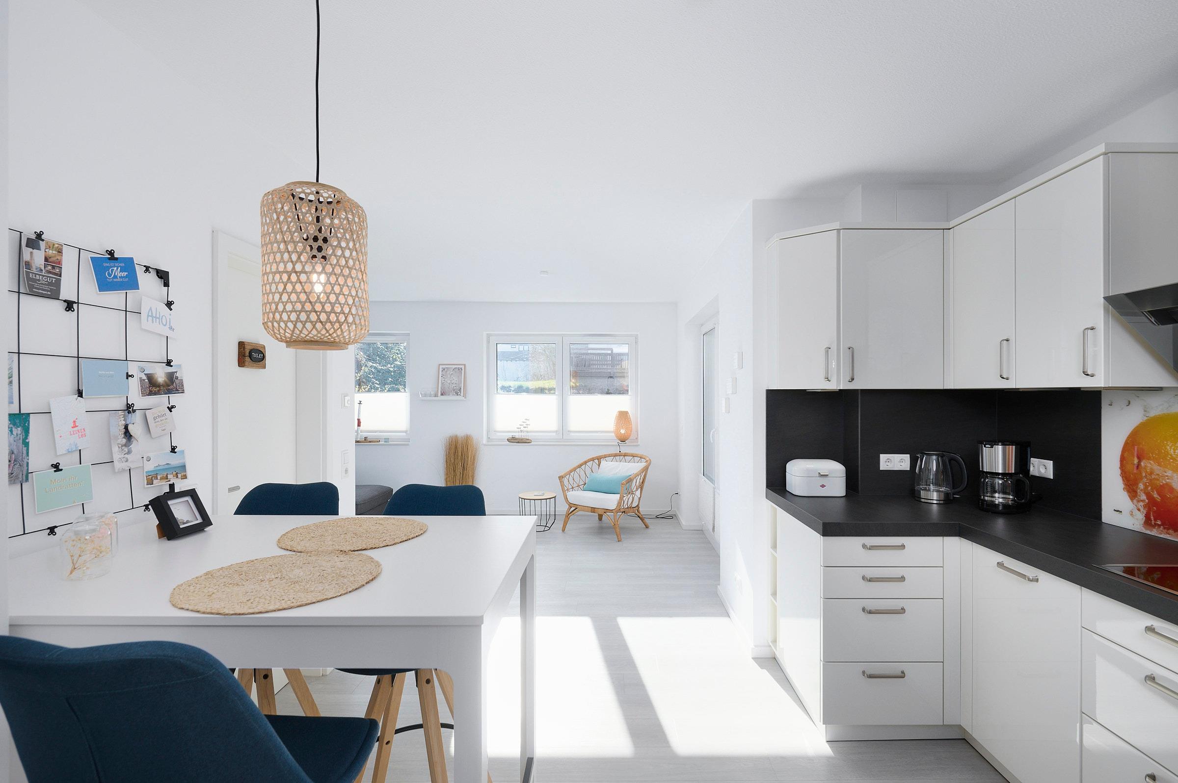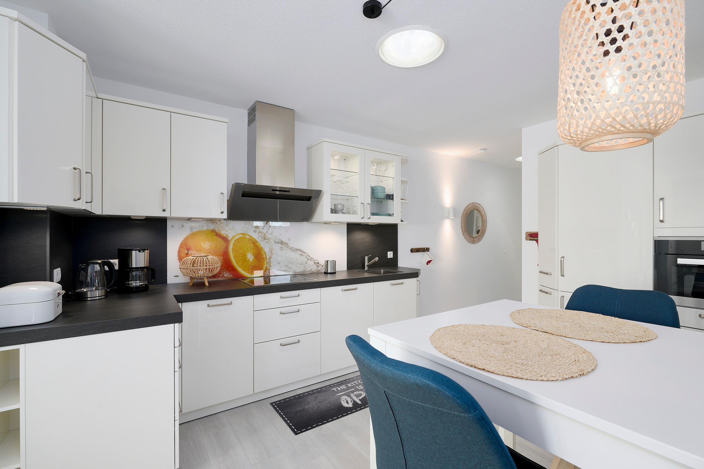 Die offene Küche ist umfassend ausgestattet mit Induktionskochfeld, Dampfgarer, extra Gefrierschrank, Kühlschrank, Spülmaschine, Kaffeemaschine, Toaster und Wasserkocher. Der angrenzende Essbereich lädt zu entspannten Mahlzeiten ein.
