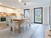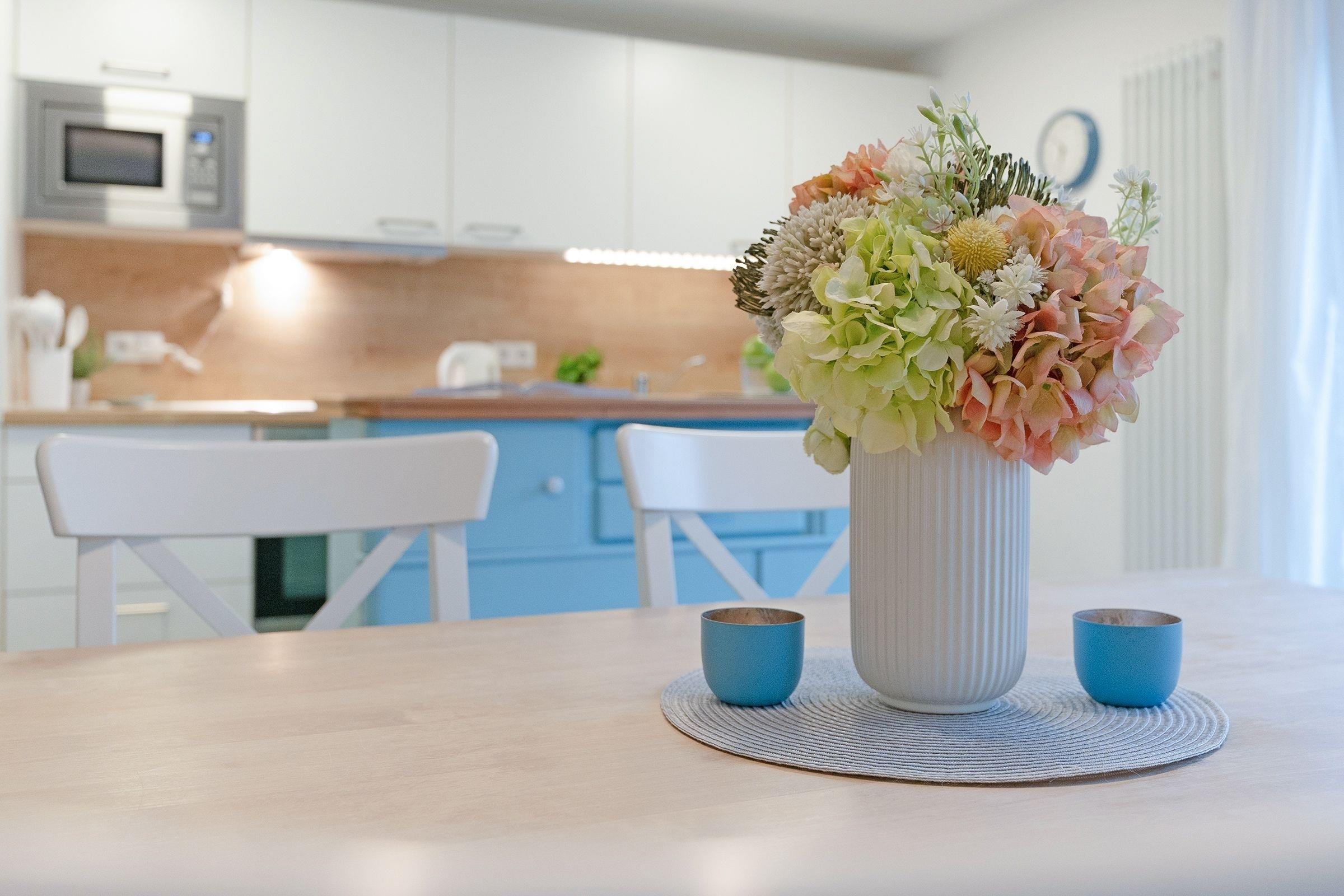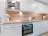 Die offene Küche ist voll ausgestattet mit Ceranherd, Backofen, Mikrowelle, Kühlschrank, Kaffeemaschine, Toaster und Spülmaschine. Der Essbereich bietet ausreichend Platz für gemeinsame Mahlzeiten.