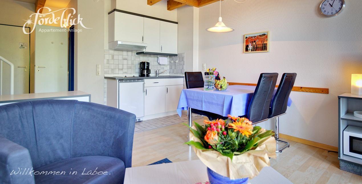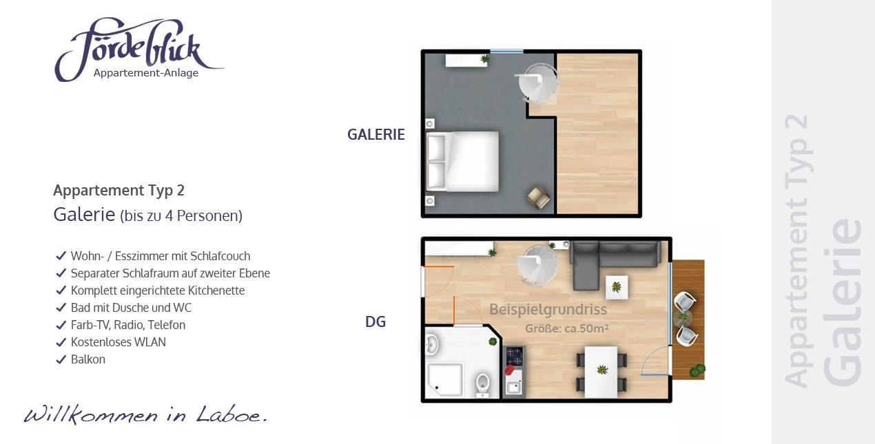 Dieses Galerie-Appartement ist ca. 50qm groß und im Maisonetten-Stil erbaut . Vom Wohn- Essraum erreicht man über eine Wendeltreppe den Schlafbereich auf der offenen Galerie. Ein Doppelbett je 90cm breit, unter dem holzverkleideten Dach bietet ein sehr gemütliches Ambiente. Im Wohn- Essraum bietet eine bequeme Schlafcouch Platz für zwei weitere Personen. Die gut eingerichtete Küchenzeile mit einem Ceranfeld und Kühlschrank sowie Kaffeemaschine und Wasserkocher gehört mit dazu. Eine große 3m breite und raumhohe Fensterfront lässt die Wohnung hell und freundlich erscheinen. Schon von dieser Fensterfront aus können Sie auf die Kieler Förde schauen. Vom gemütlichen Dachbalkon genießen Sie eine herrliche Aussicht auf die See mit den vorbeifahrenden großen "Pötten" Hier werden Sie Ihren Urlaub in Laboe sehr genießen. Weitere Ausstattungsmerkmale sind: Kabel-TV, Radio und Mikrowelle. Ein kleines Bad mit Dusche und WC neben der geräumigen Diele steht zu Ihrer Verfügung, ebenso ein kostenfreies leistungsfähiges WLAN mit sehr einfachem Zugang.