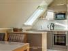 Im unteren Bereich der Wohnung erwartet dich ein heller Wohnraum mit direktem Zugang zum ersten Balkon. Die offene Küchenzeile mit Essplatz fügt sich harmonisch ein und lädt zum Kochen, Plaudern und Genießen ein. Ein kleines Duschbad liegt direkt neben dem Flur. Der Wohnbereich ist zugleich Schlafraum. Hier steht ein komfortables Schrankbett bereit, das sich abends mit wenigen Handgriffen öffnen lässt und dir eine erholsame Nacht verspricht.