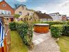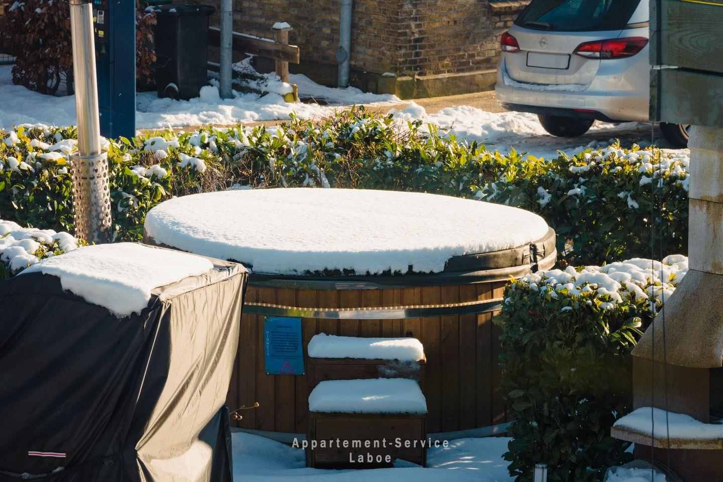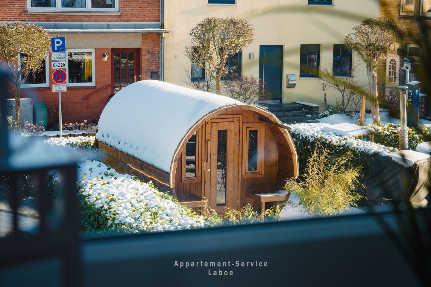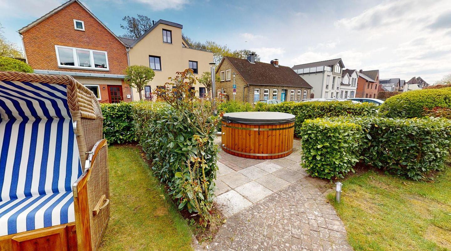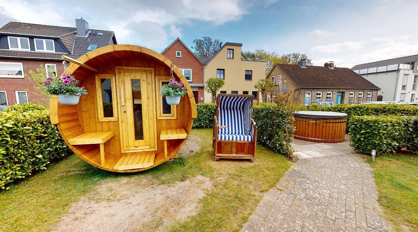 Im gemeinschaftlichen Gartenbereich findest du weitere Highlights: Eine Fass-Sauna, ein Hot-Tub sowie eine Grillecke mit Sitzplätzen stehen allen Gästen im Haus offen – ideal für entspannte Stunden nach einem Strandtag oder gemütliche Abende mit Freunden und Familie.
