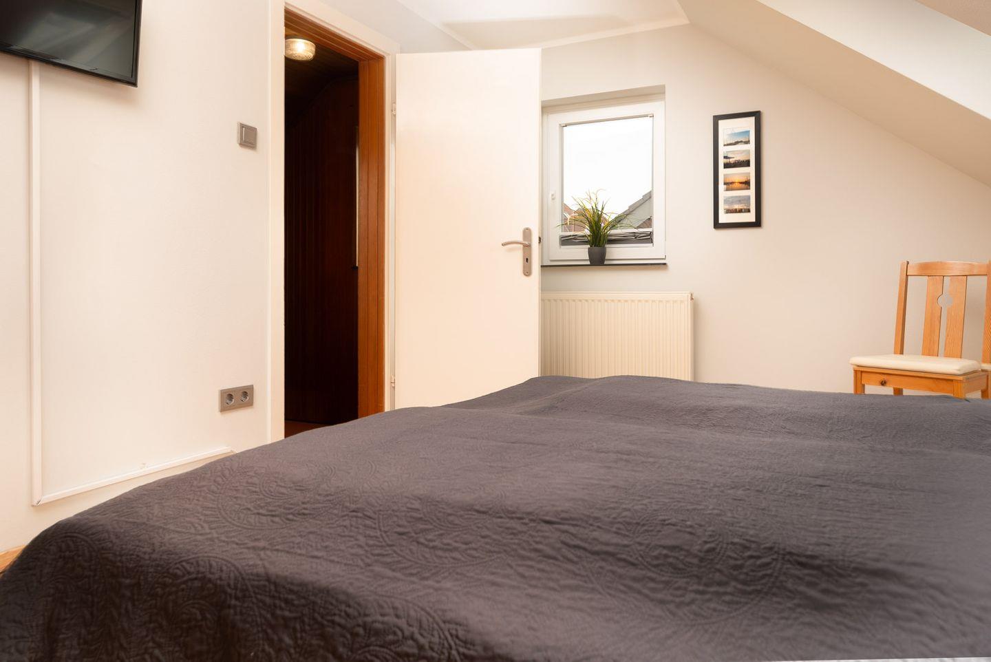 Die dritte Etage bietet ein weiteres Schlafzimmer mit Doppelbett, ideal für etwas mehr Privatsphäre. Direkt gegenüber liegt das zweite Badezimmer mit Dusche und WC – ideal für Familien oder kleine Gruppen, die sich auch im Urlaub den Komfort von zwei Bädern wünschen.