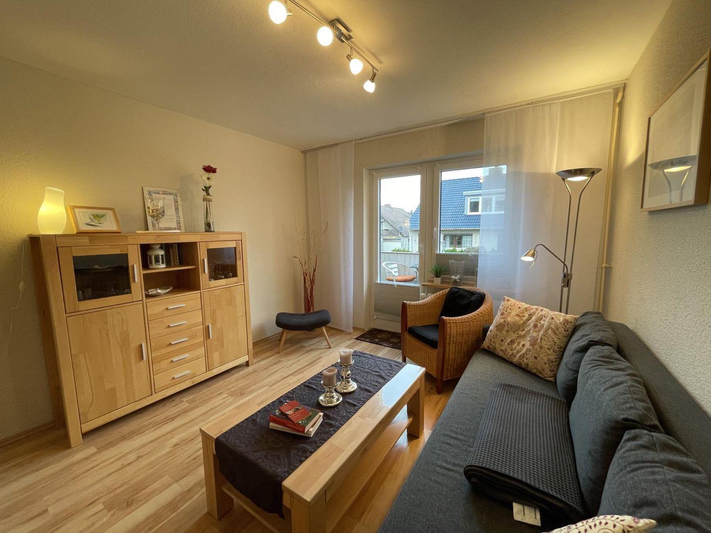 Die Wohnung im ersten Obergeschoss bietet dir auf zwei Zimmern und 50?m² alles, was du für deine Auszeit brauchst. Im Wohnzimmer wartet eine bequeme Sitzgruppe mit Schlaffunktion auf dich – gut geeignet für ein oder zwei weitere Gäste. Fernseher, WLAN, Stereoanlage und ein DVD-Player sind natürlich vorhanden.