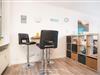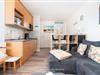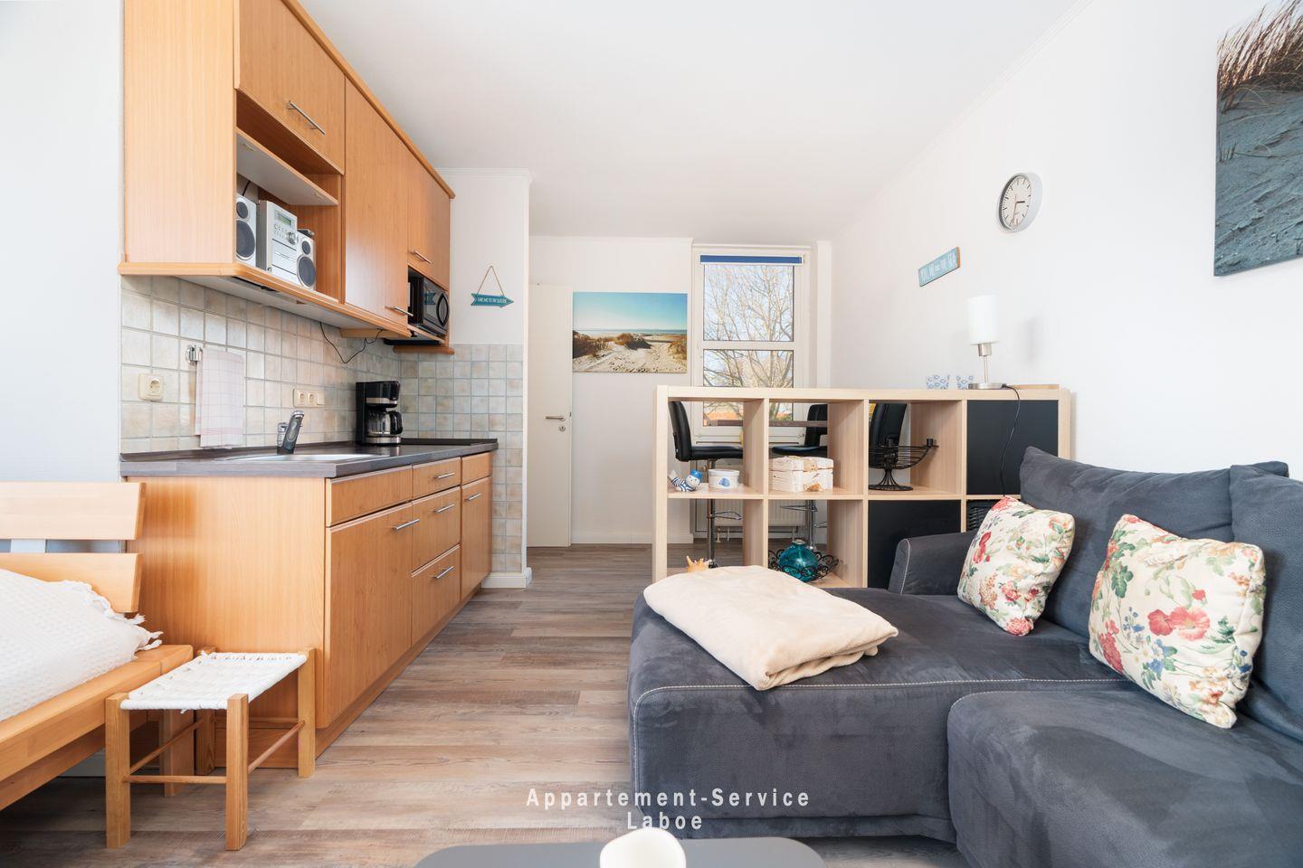 Das lichtdurchflutete Wohnzimmer ist offen gestaltet und lädt mit einer bequemen Sitzecke zum Entspannen ein. Das Klappsofa lässt sich bei Bedarf zu einem zusätzlichen Schlafplatz verwandeln. Im Schlafbereich erwartet dich ein großes Doppelbett für erholsame Nächte nach einem Tag am Strand oder einem Bummel entlang der Promenade.