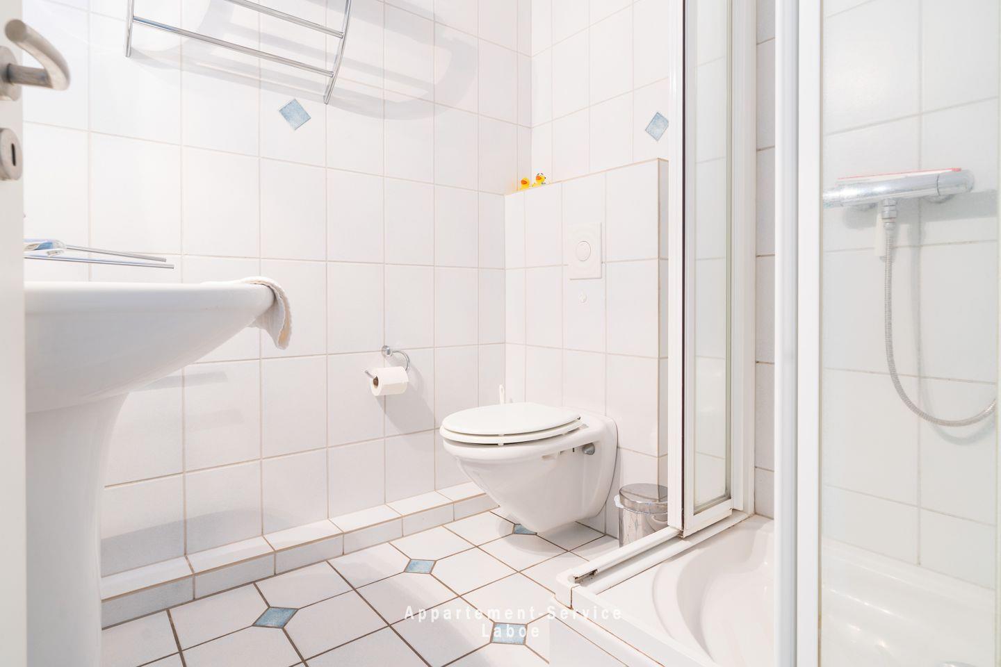 Zur Ausstattung gehören WLAN, SAT-TV und eine kleine Musikanlage. Das moderne Bad mit Dusche und WC ist hell und freundlich, im Flur sorgt ein praktischer Einbauschrank für Stauraum.
