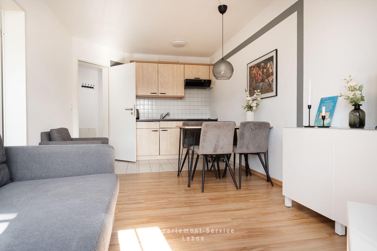 FeWo W13 im Haus Nautic: 40?m² große 2-Zimmer-Wohnung im 1. OG für bis zu 4 Personen. Wohnbereich mit Sitzgruppe und Doppelbettcouch, separates Schlafzimmer mit Doppelbett. Offene, voll ausgestattete Küche mit Essplatz, modernes Bad mit Dusche/WC, Flur mit Garderobe. Möblierter Balkon. WLAN und TV vorhanden. Eigener Außenstellplatz. Nichtraucher, Haustiere willkommen. Ca. 500?m zum Strand.