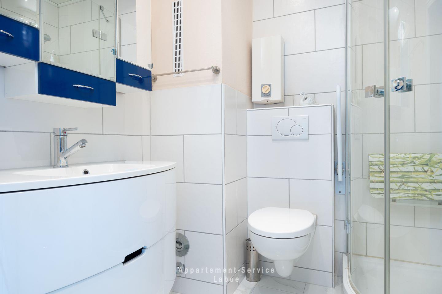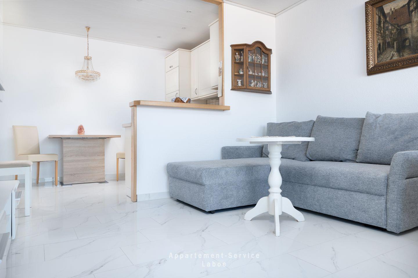 2-Zimmer-Wohnung über ca. 50 m² im 3. OG mit Meerblick, Wohnzimmer mit gemütlicher Sitzgruppe (Doppel-Schlafcouch) und TV, möblierter Balkon, offene Küchenzeile mit Gefrierkombination und Geschirrspüler, Schlafzimmer mit Doppelbett (180 x 200) und Einzelbett (90 x 200), Wohn-Schlafzimmer mit Doppelschlafcouch (140 x 190 cm), Badezimmer mit Dusche und WC, kleiner Flur mit Garderobe, Pkw-Garagenstellplatz.