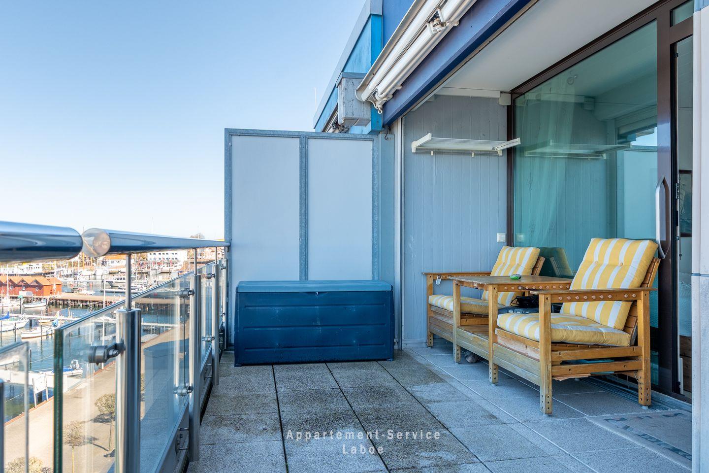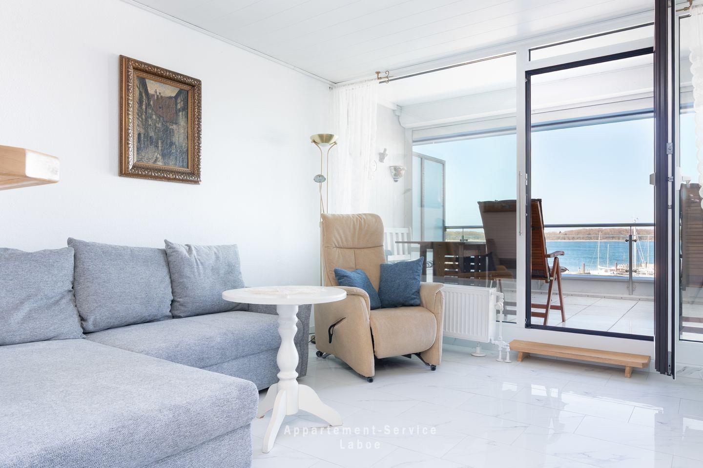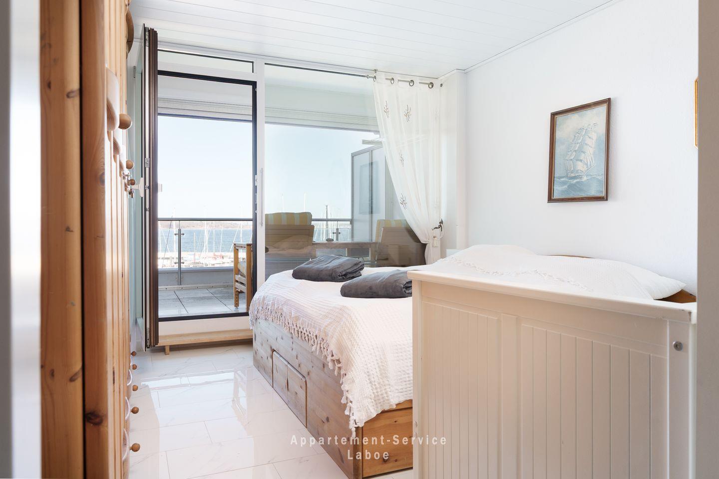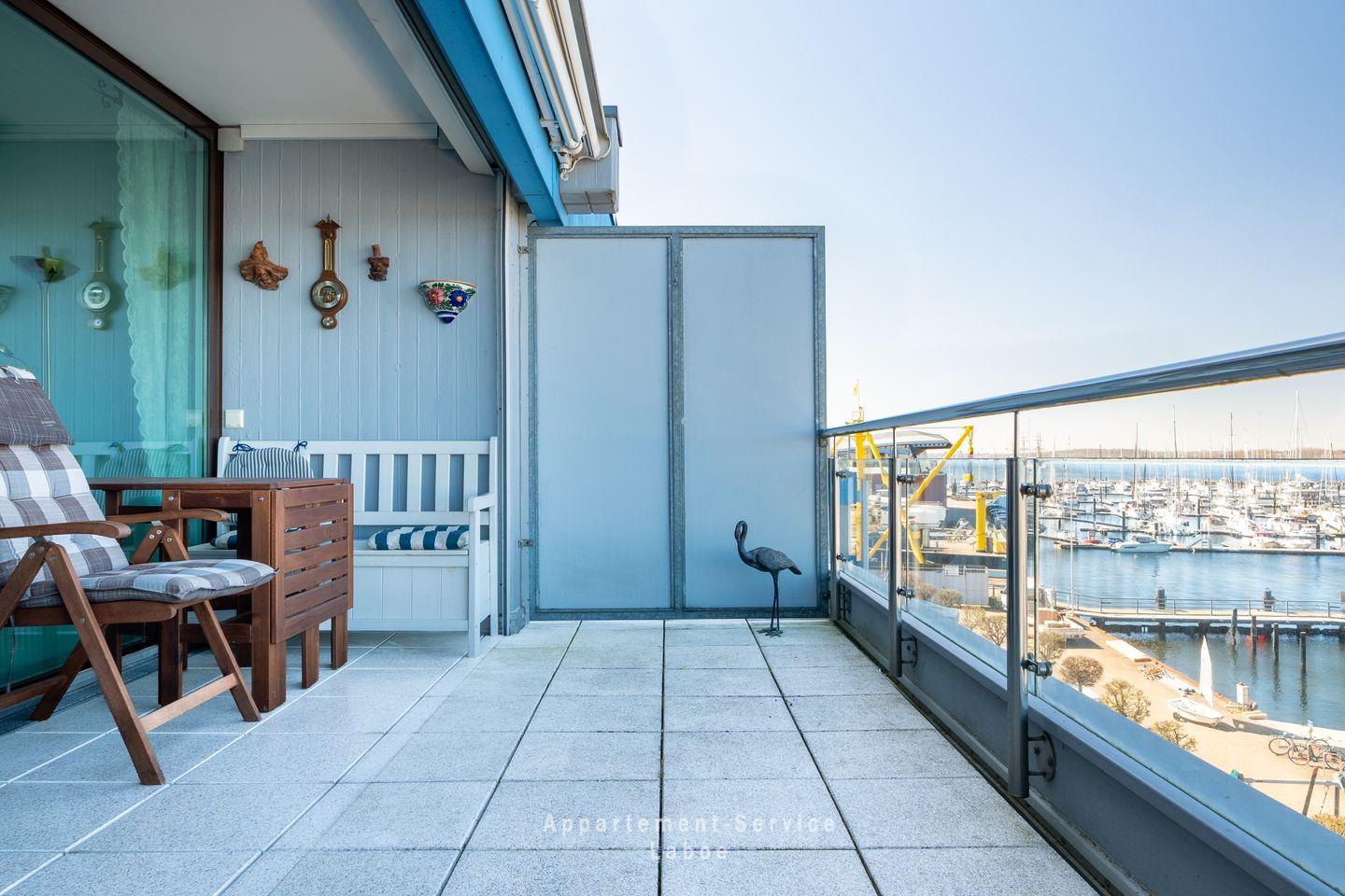 Der überdachte Balkon ist ein besonderer Ort dieser Wohnung. Hier sitzt du geschützt an der frischen Luft und kannst zu jeder Tageszeit den Blick über die Förde schweifen lassen. Ob am Morgen mit einer Tasse Kaffee oder am Abend, wenn langsam Ruhe einkehrt – dieser Platz bleibt dir in Erinnerung.
