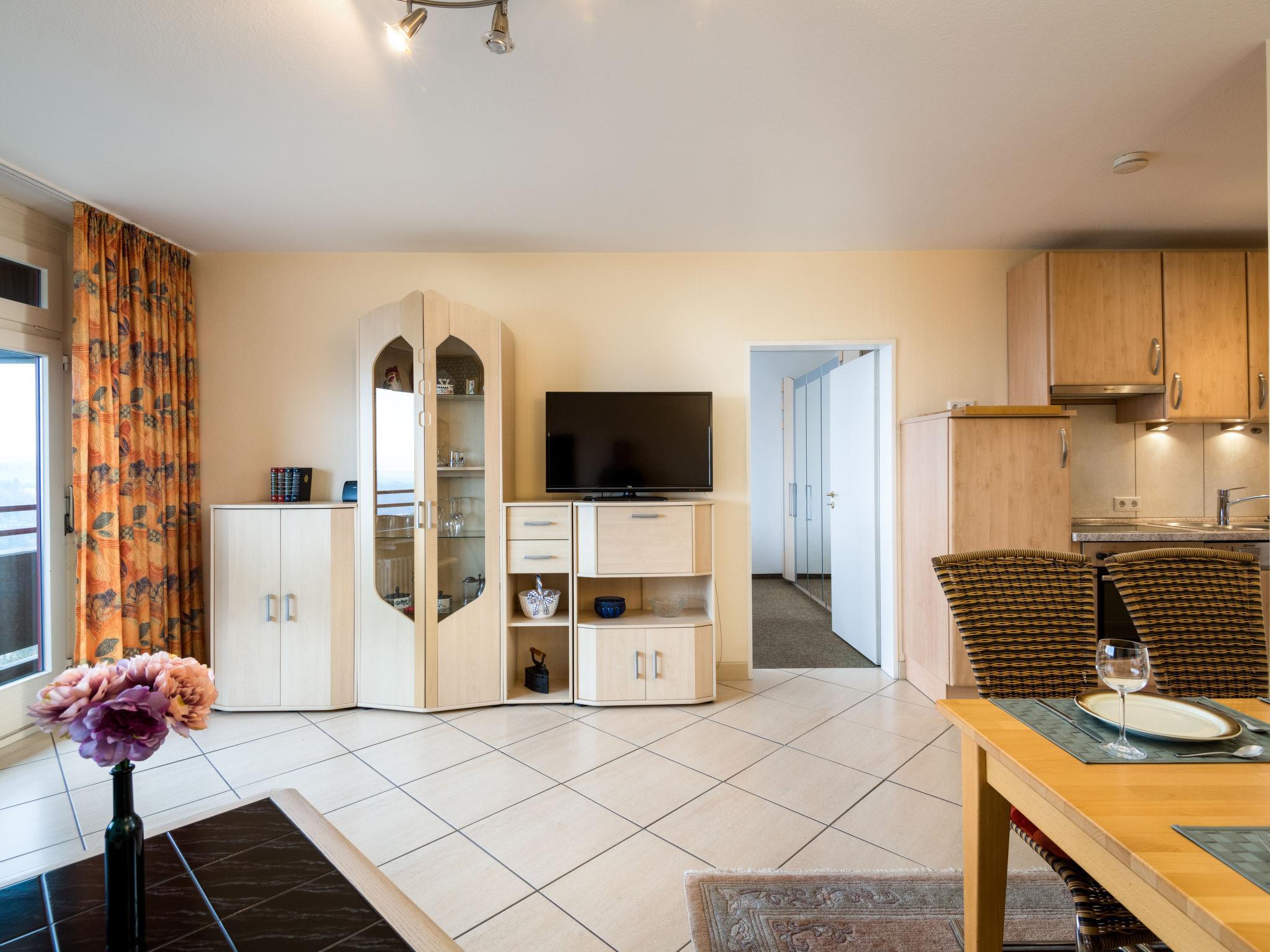 "Talblick (B1101)", 2-room apartment 52 m2 on 11st floor, east facing position. Living/dining room with 1 double sofabed (140 cm, length 200 cm), satellite TV (flat screen). Exit to the balcony. 1 room with 1 double bed (2 x 100 cm, length 200 cm). Open kitchen in the entrance (oven, dishwasher, 4 ceramic glass hob hotplates, toaster, kettle, electric coffee machine). Shower/WC. Balcony furniture. Marvellous view of the countryside. Facilities: Internet (WiFi, free). Please note: non-smokers only. Smoke alarm.