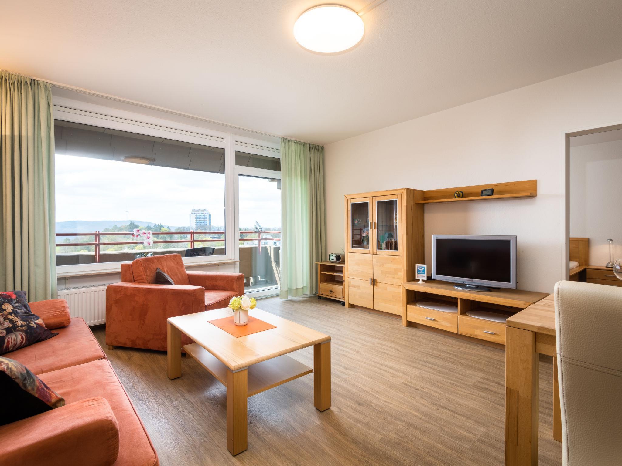 "Rheinblick (A1208)", 2-room apartment 56 m2 on 12nd floor, west facing position. Living/dining room with 1 double sofabed (160 cm, length 200 cm), satellite TV (flat screen), CD-player. Exit to the balcony. 1 double bedroom with 1 double bed (2 x 90 cm, length 200 cm). Kitchenette (4 hot plates, oven, toaster, kettle, electric coffee machine). Bath/shower/WC. Balcony furniture. Marvellous view of the countryside and the river. Facilities: Internet (WiFi, free). Please note: non-smokers only. Smoke alarm.