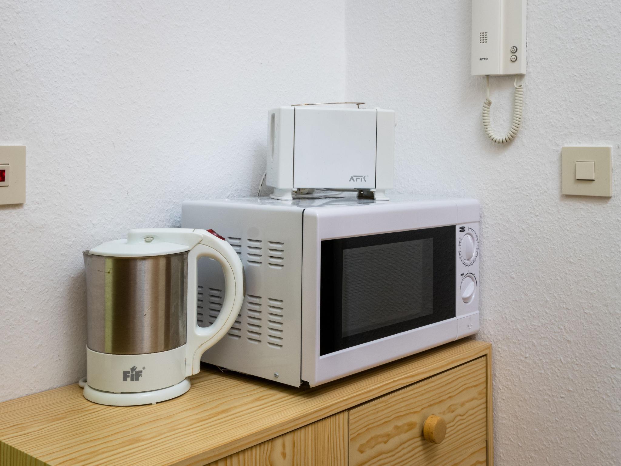 "Gartenblick (B111)", 1-room apartment 33 m2 on 1st floor, west facing position. Living/sleeping room with 2 beds (90 cm, length 200 cm), satellite TV. Exit to the balcony. Kitchenette in the entrance (2 hot plates, toaster, kettle, electric coffee machine). Bath/shower/WC. Balcony furniture. Facilities: Internet (WiFi, free). Please note: non-smokers only. Maximum 1 pet/ dog allowed. Smoke alarm.
