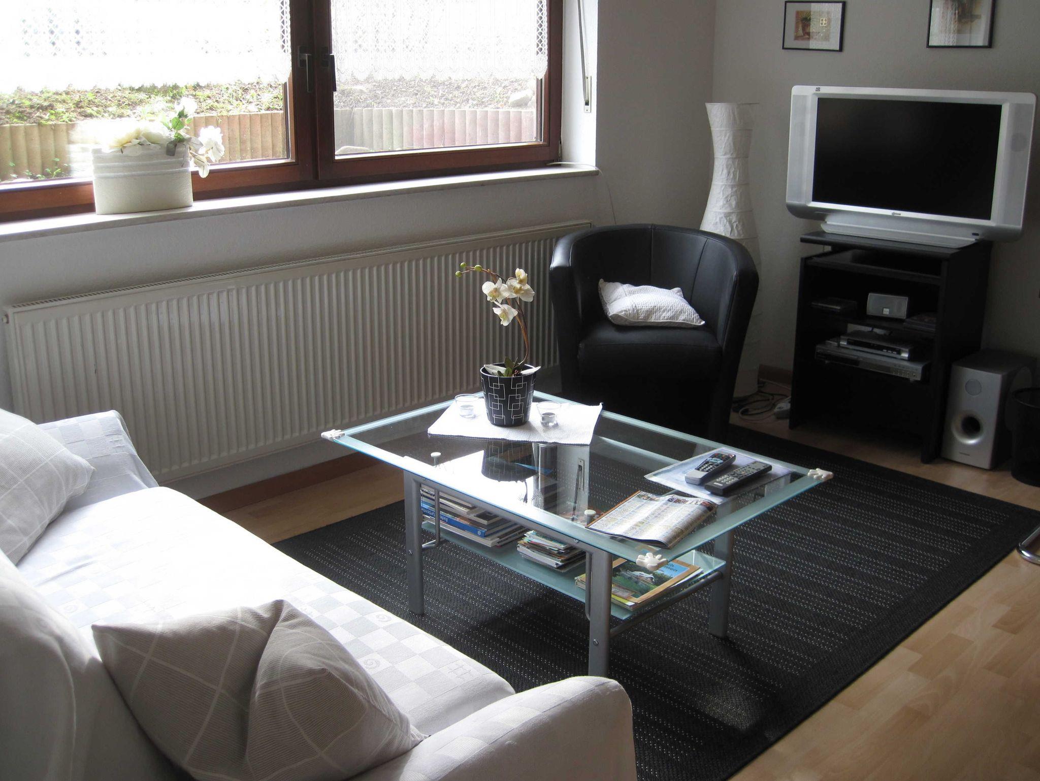 Sie bietet: Separaten Eingang, Carport - Autoabstellplatz, Wohn-/Schlafzimmer mit SAT - TV und kostenloses Wlan . .Außerdem verfügt die Wohnung über eine Waschmaschine mit Trockenmöglichkeit und eine voll ausgestattete Küche. Bügelbrett und Bügeleisen sind vorhanden. Vor dem Haus befindet sich ein kleiner Freisitz mit Gartenmöbeln und Sonnenschirm.