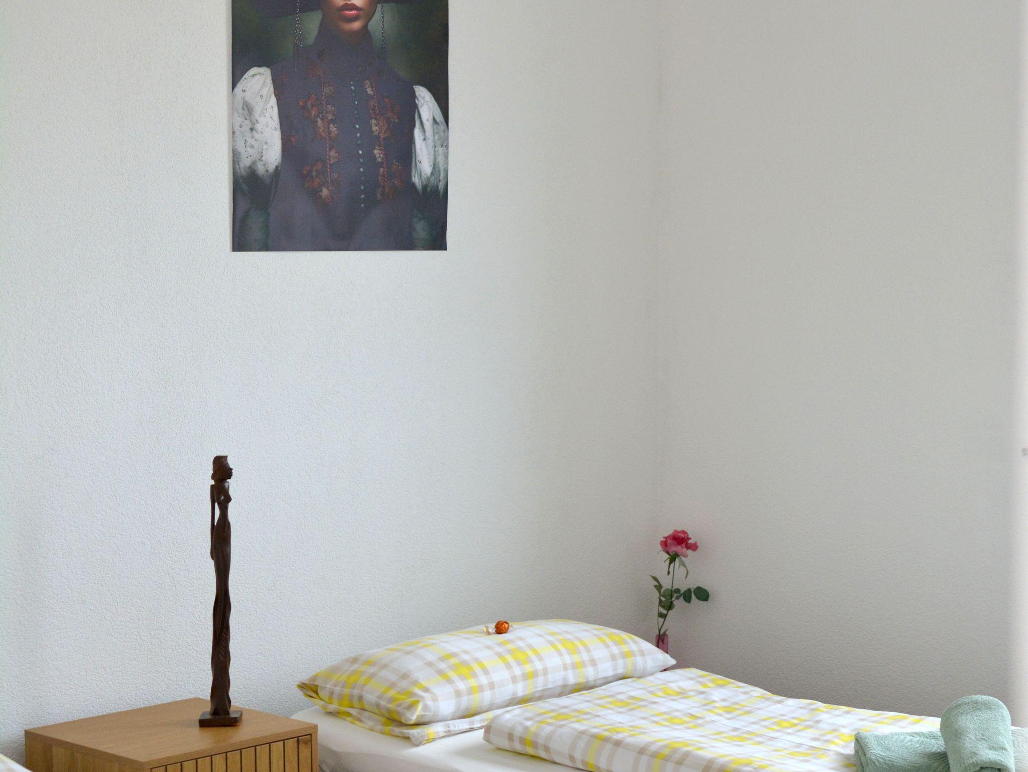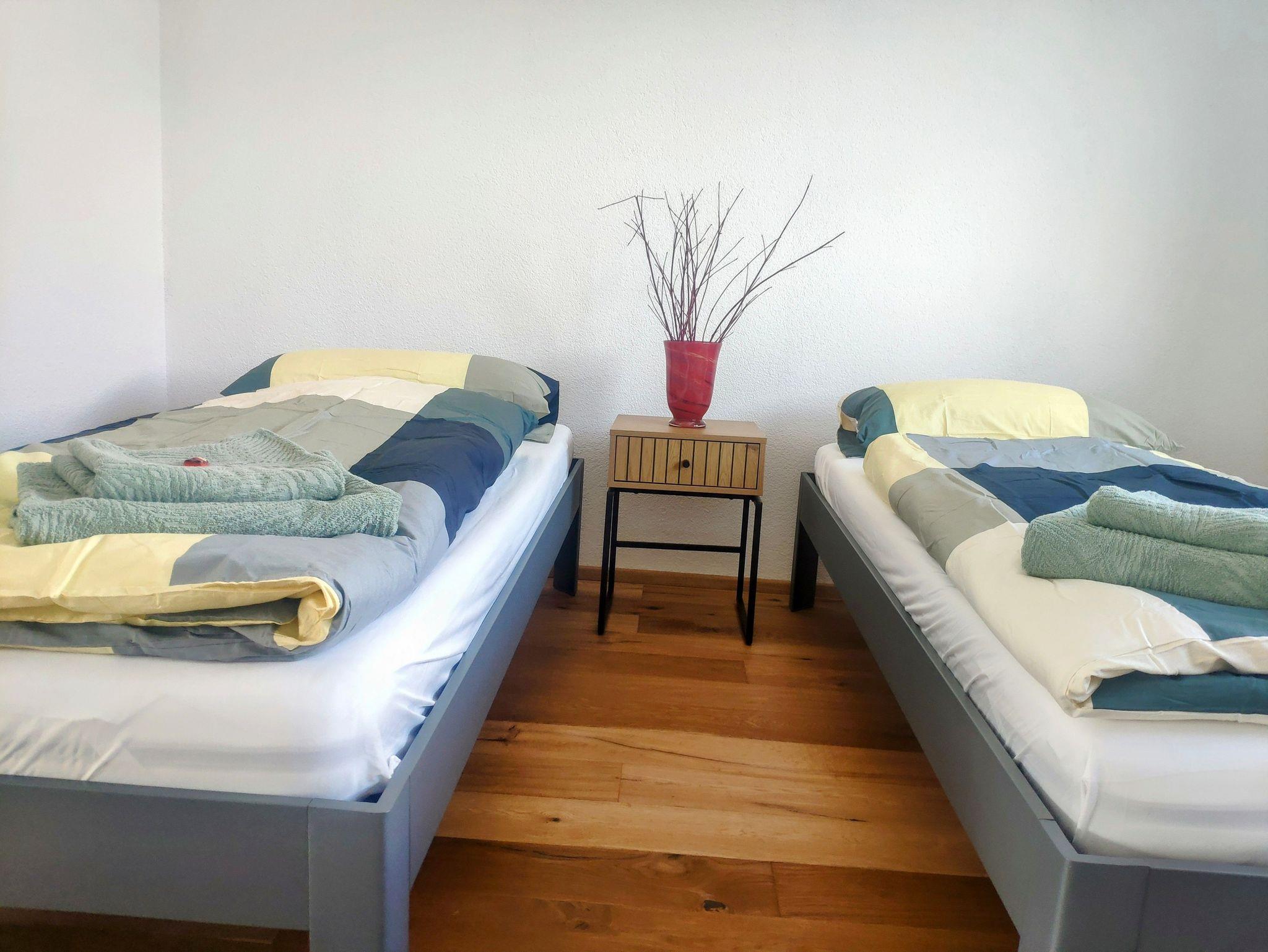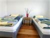 Schlafzimmer: 2 Einzelbetten, können nebeneinander gestellt werden, ein Nachttisch mit Lampe, auch hier elektrische Jalousien , ein Kleiderschrank mit Kleiderbügeln, Bügelbrett und Bügeleisen.