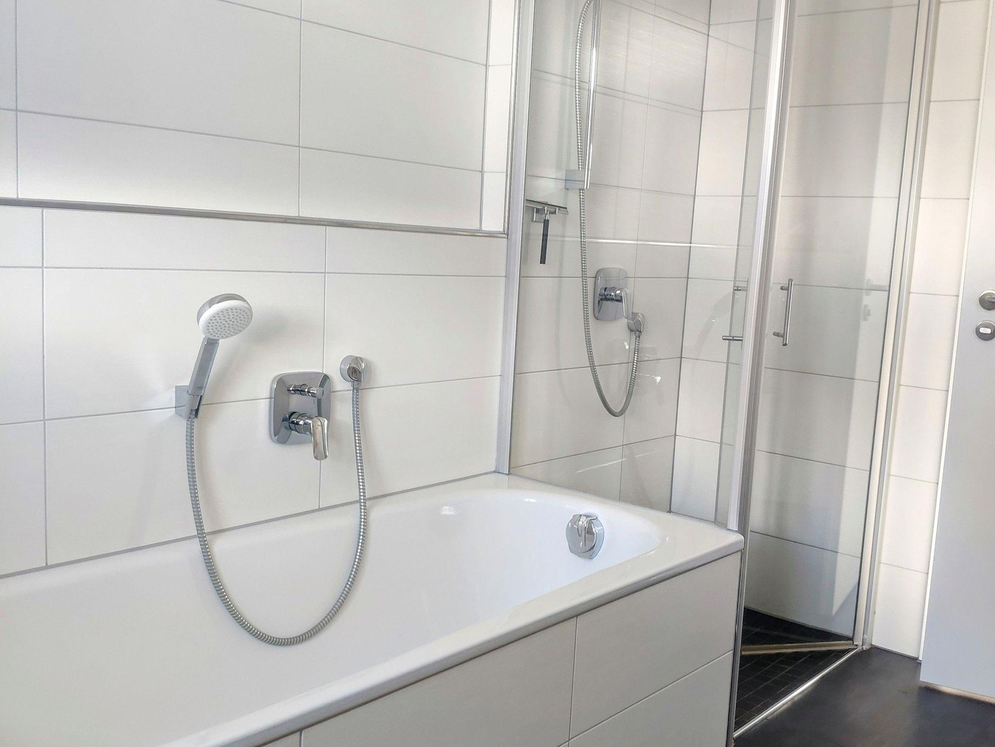 Bad: 2 getrennte Waschbecken, Badewanne und Dusche im Bad vorhanden, Handtuchwärmer, Fliesen im Bad, Spiegelschrank, Föhn, Fenster im Bad, Waschmaschine