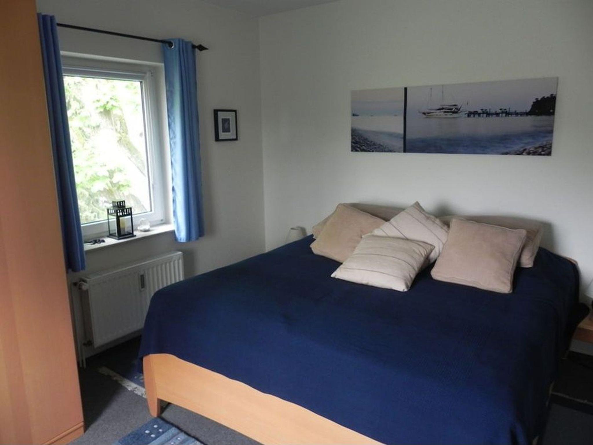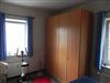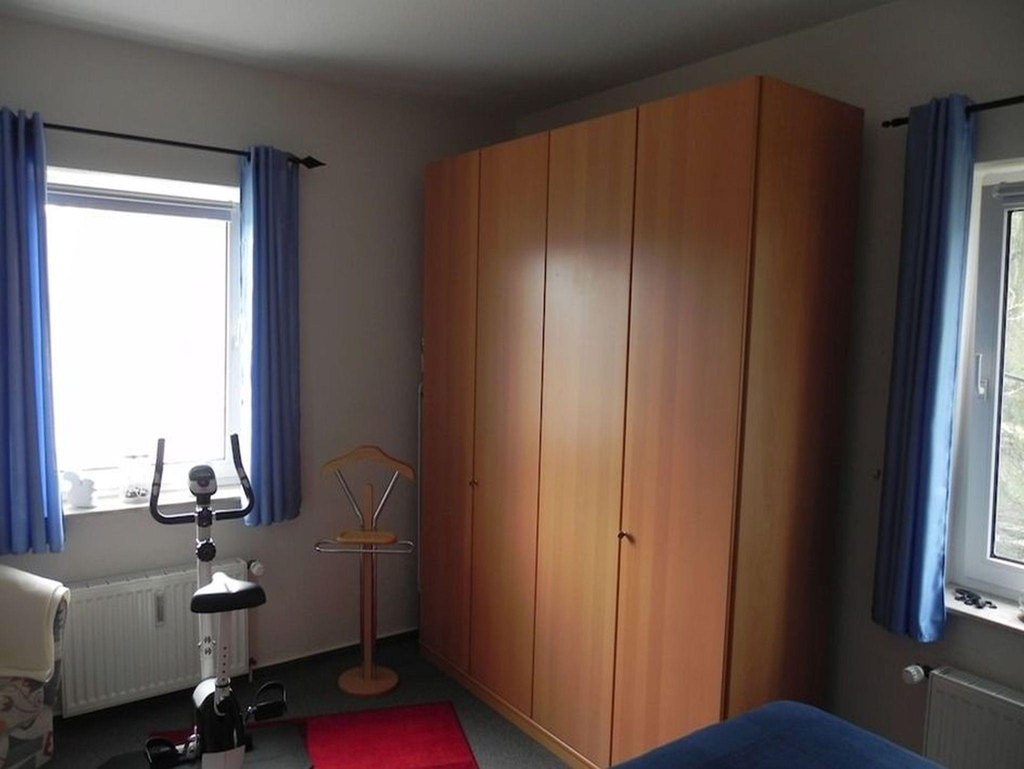 Das Schlafzimmer ist mit einem Doppelbett, großem Schrank und einem Sessel eingerichtet.