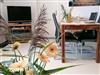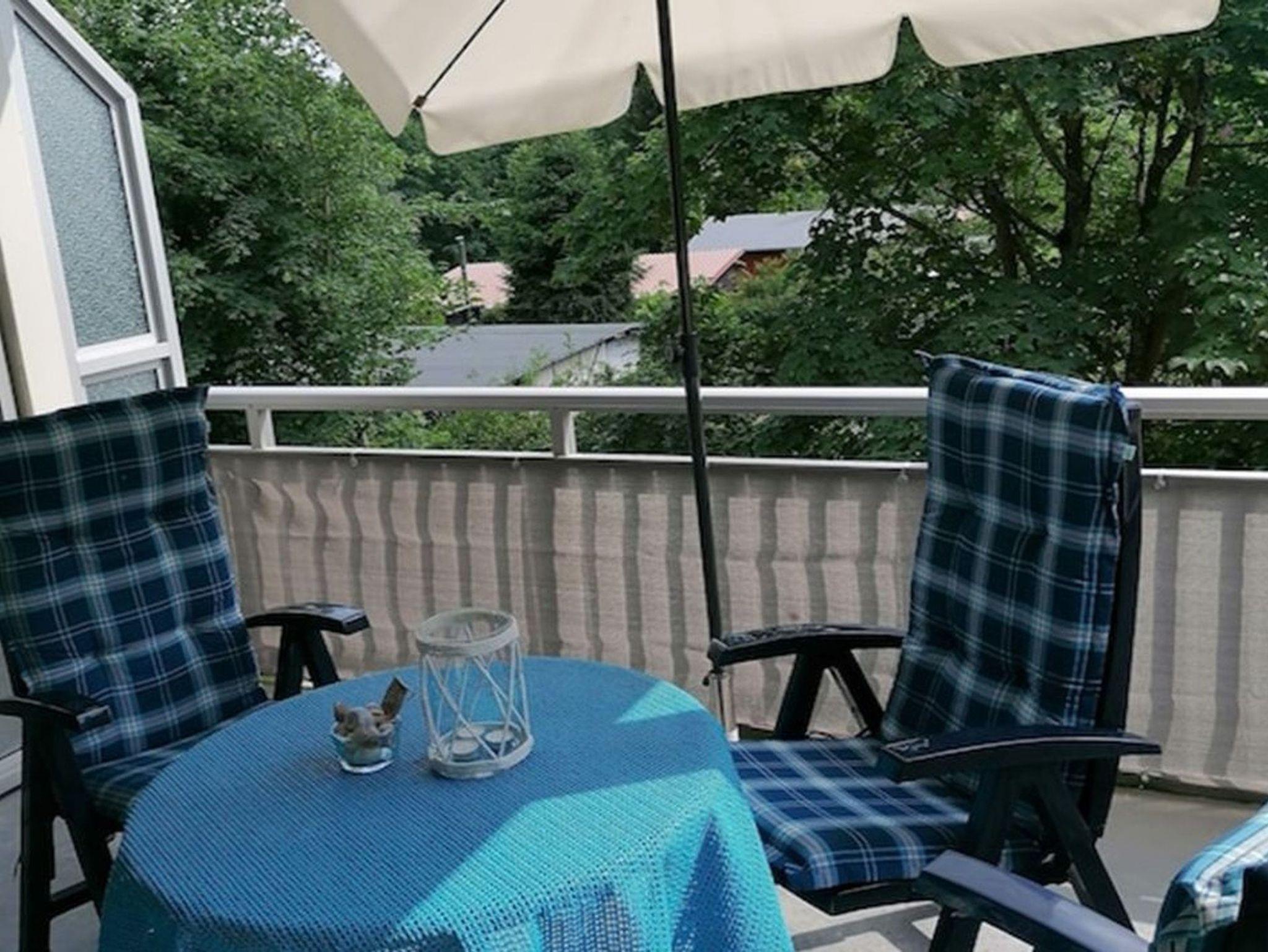 Über das Wohnzimmer gelangt man auf den überdachten, mit Gartenmöbel und Sonnenschirm ausgestatteten, Südbalkon.