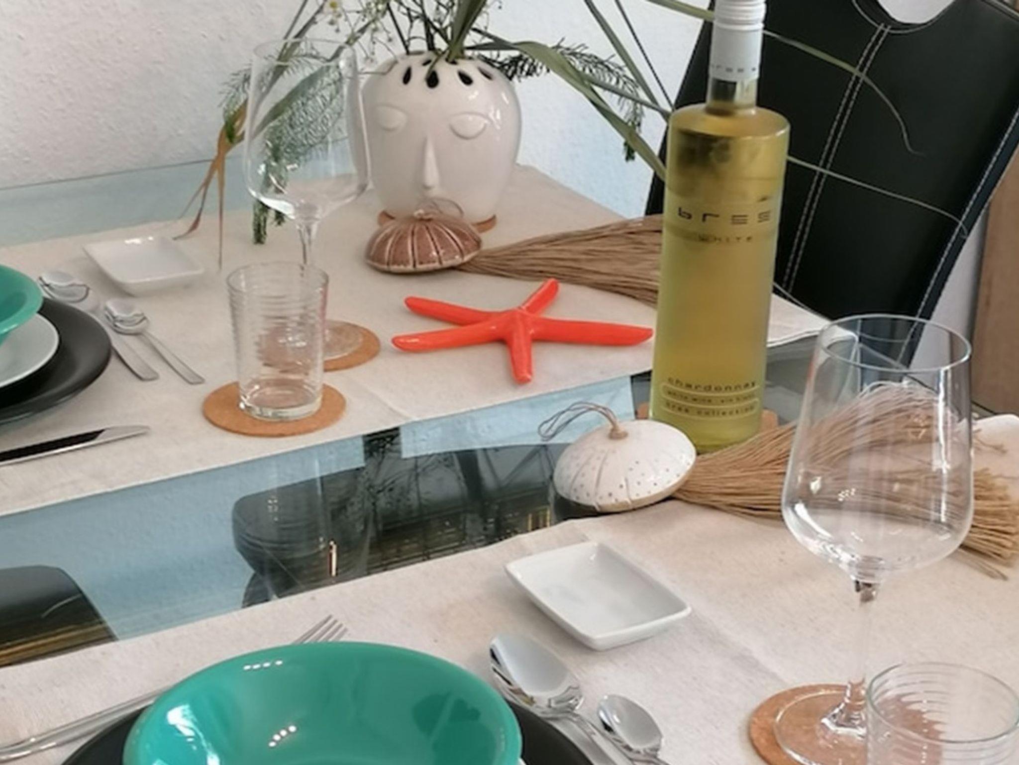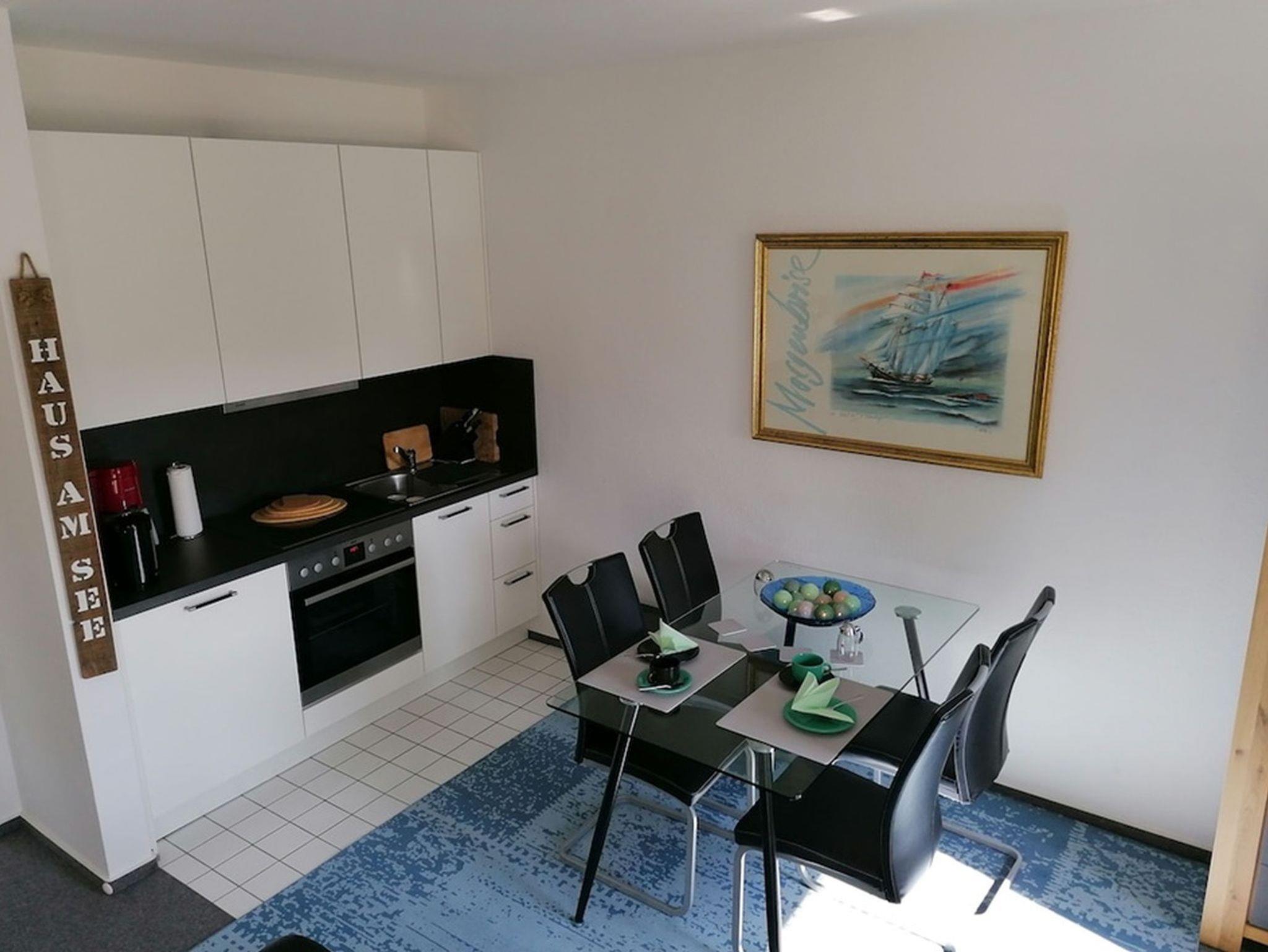 Die Ferienwohnung verfügt über einen exklusiven Wohn- und Essbereich mit integrierter voll ausgestatteter Küchenzeile (Backofen, Ceranfeld, Kühlschrank, Kaffeemaschine, Wasser- und Eierkocher, Toaster, etc.).