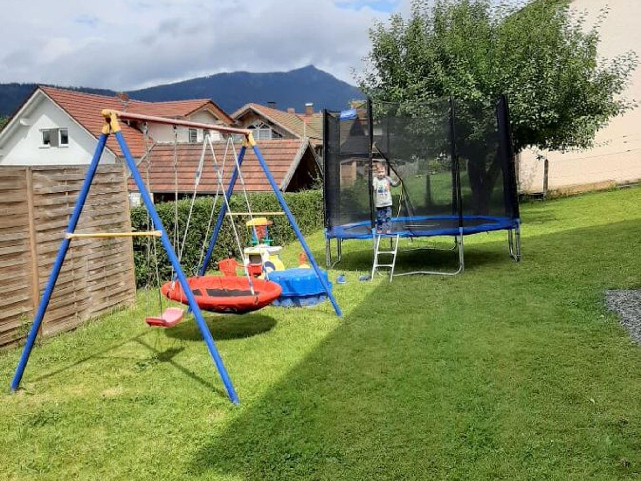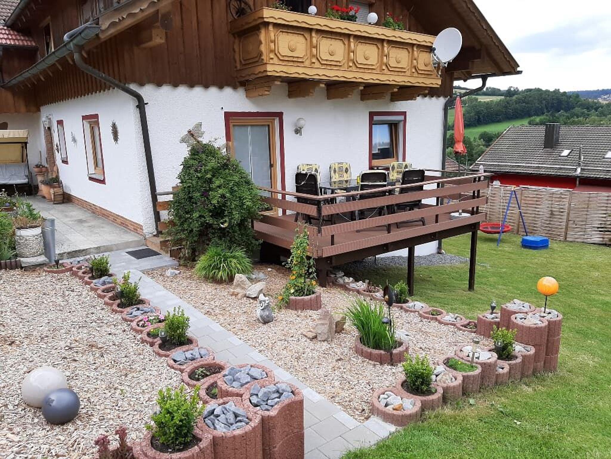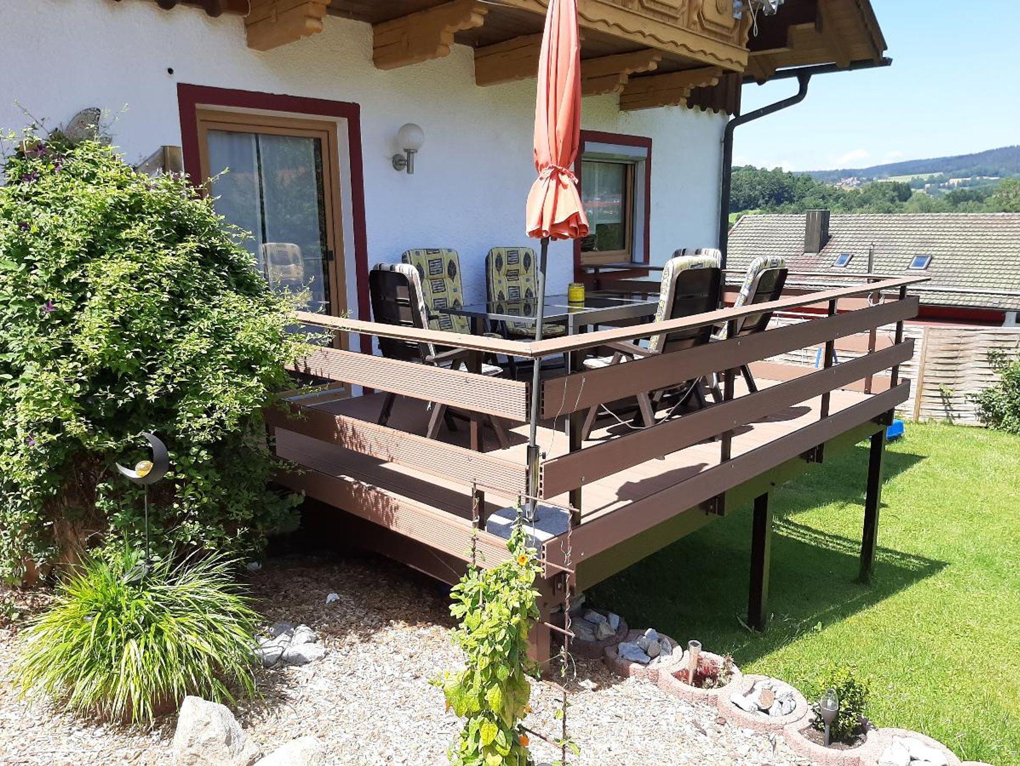 Küche mit Spülmaschine und vieles mehr. Mit Balkonterrasse, Wohnzimmer mit kleinen Balkon und mit Sat-TV -Radio, DVD Spieler , drei Schlafzimmer ( ein Schlafzimmer davon mit extra abgetrennten Raum mit Dusche -Toilette und Waschbecken und extra TV-Sat )belegbar bis 7 Personen siebte Person Zustellbett) Garten mit Spiel- und Liegewiese , Schaukel , Kinderrutsche, großes Trampolin und Gartenmöbel. Unsere Ferienwohnungen liegen in Waldnähe . Der Rad- und Wanderweg sowie das Osserbad sind in unmittelbarer Nähe.