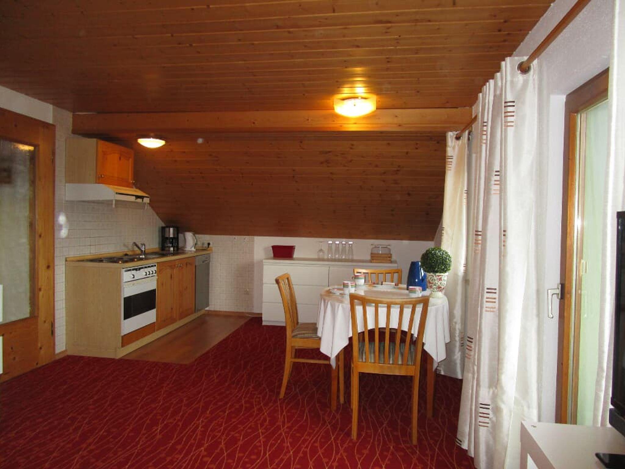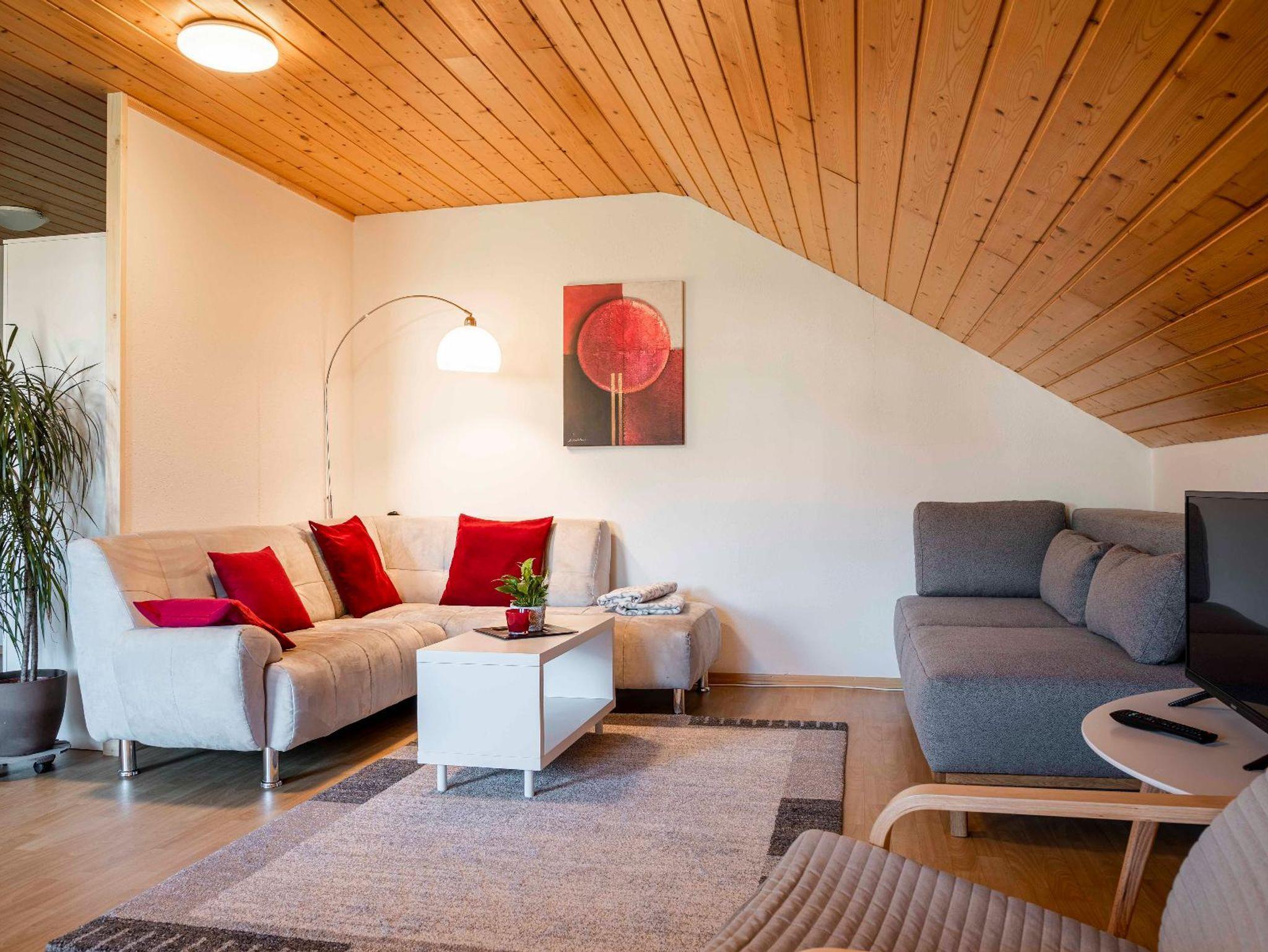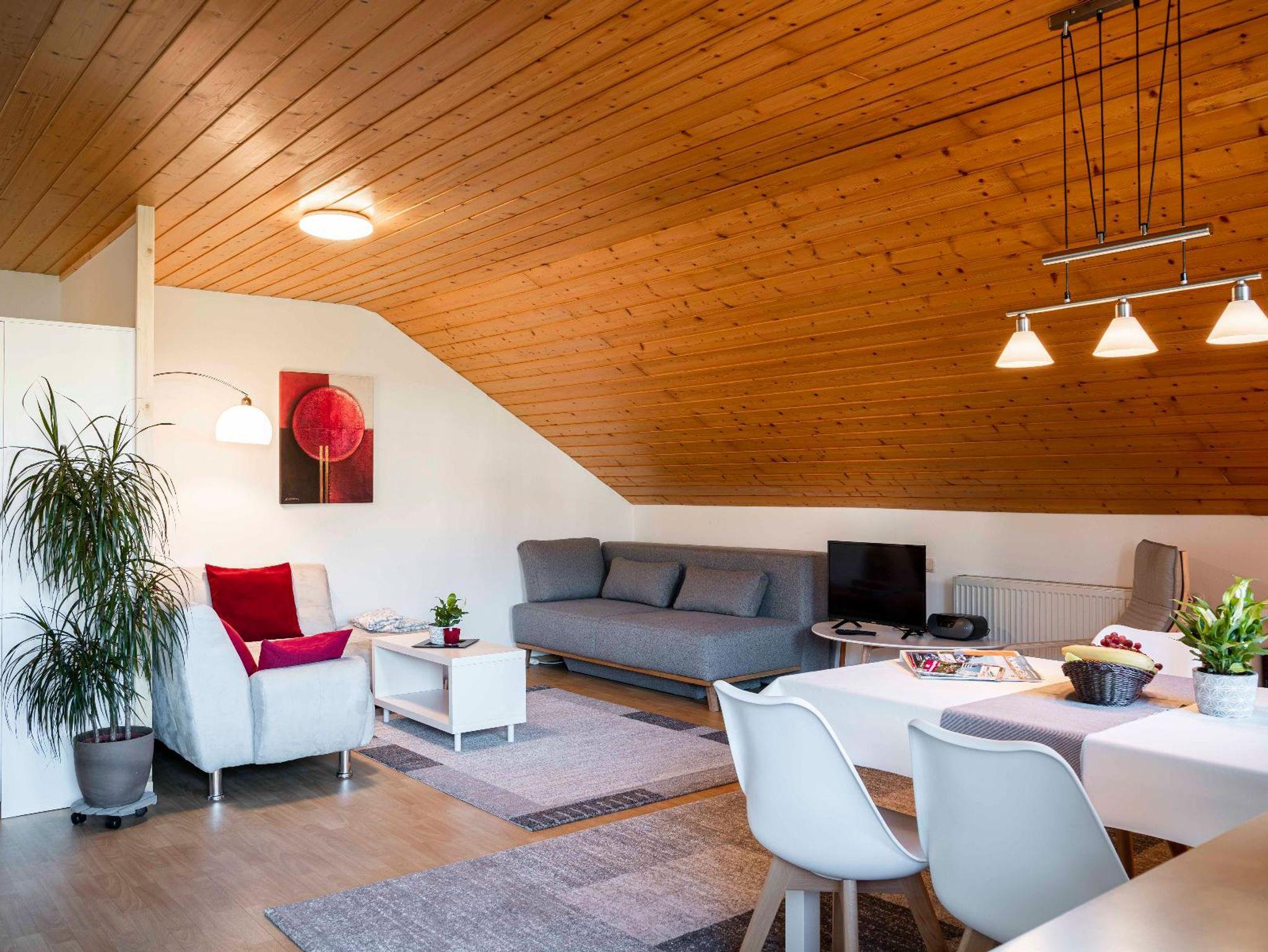 Im Dachgeschoß, mit Blick zum Obstgarten, befindet sich die großzügige Ferienwohnung für 4 Personen. Modern und doch gemütlich, so lädt die gerade neu renovierte Ferienwohnung zum Wohlfühlen und Erholen ein. Die Wohnung besteht aus 1 Doppel-Schlafzimmer, sehr großem Wohnbereich mit einer zusätzlichen gemütlichen Schlafcouch,r, gemütlicher Couchgarnitur, SAT-TV, W-LAN, Radio, Essecke und Küchenzeile mit Spülmaschine, Mikrowelle, Kaffeemaschine, Wasserkocher, Toaster, großem Balkon und Dusche/WC. Auf Wunsch - Brötchenservice! In der Wohnung bitte nicht rauchen!