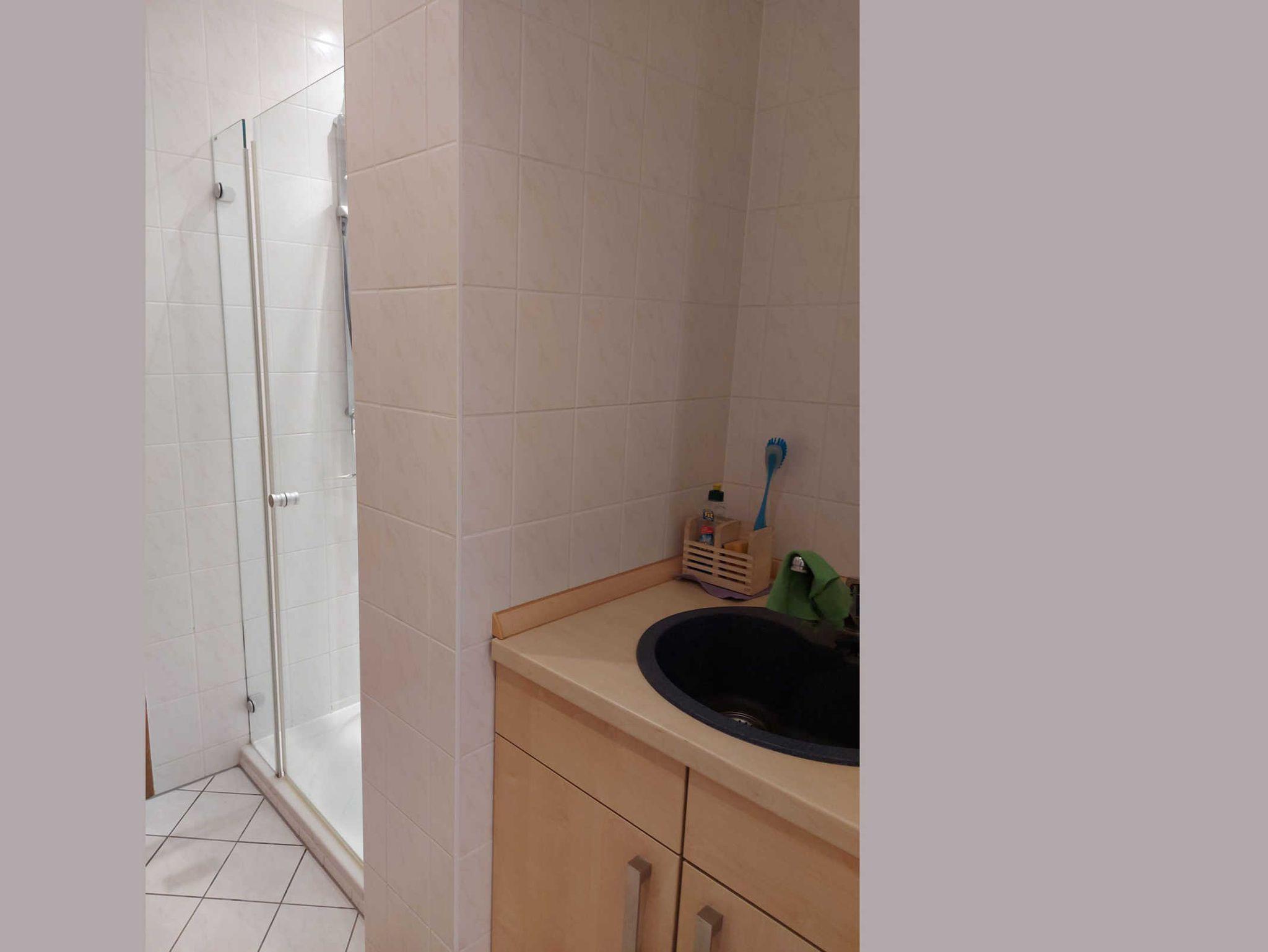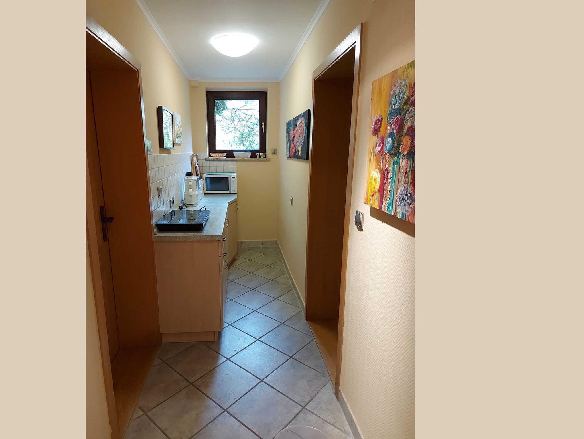Küchenzeile mit Induktionskochplatten, Kaffeemaschine, Mikrowelle, Wasserkocher, Toaster und Kühlschrank im Flur. Im Bad Handtuchtrockner und Spülbecken für Geschirr.