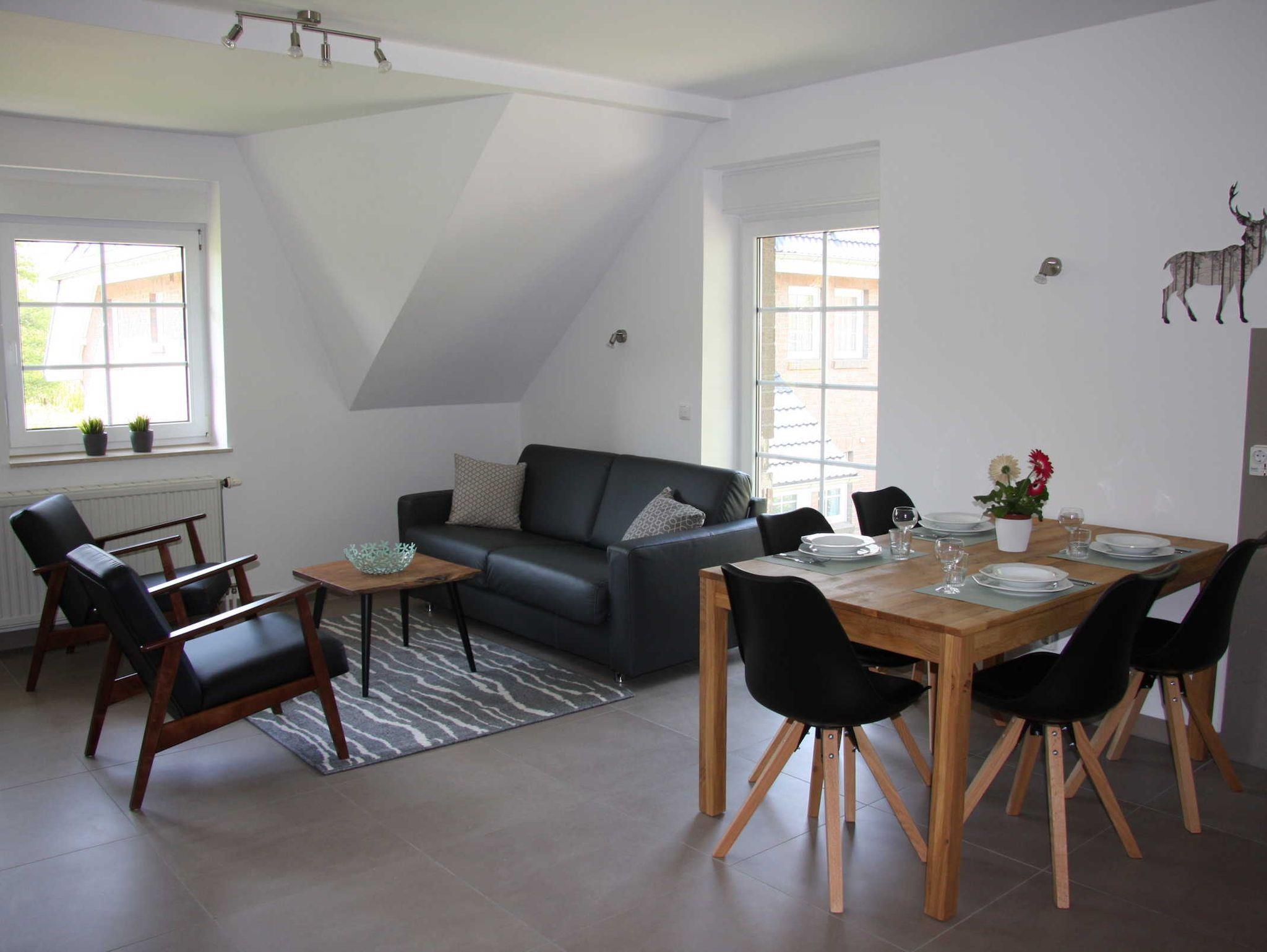 Die 3-Zimmer Maisonettewohnungen (70 m²) für Familien befinden sich im 1. OG und bieten einen wunderschönen Blick in die Natur. Die Maisonettewohnungen haben 2 Schlafzimmer mit Boxspringbetten, 2 Badezimmer, einen großen Wohnraum mit Couchgarnitur (Schlafsofa), eine integrierte Einbauküche mit Essbereich und einen Balkon. Die Küche ist in den großen Wohnraum integriert.