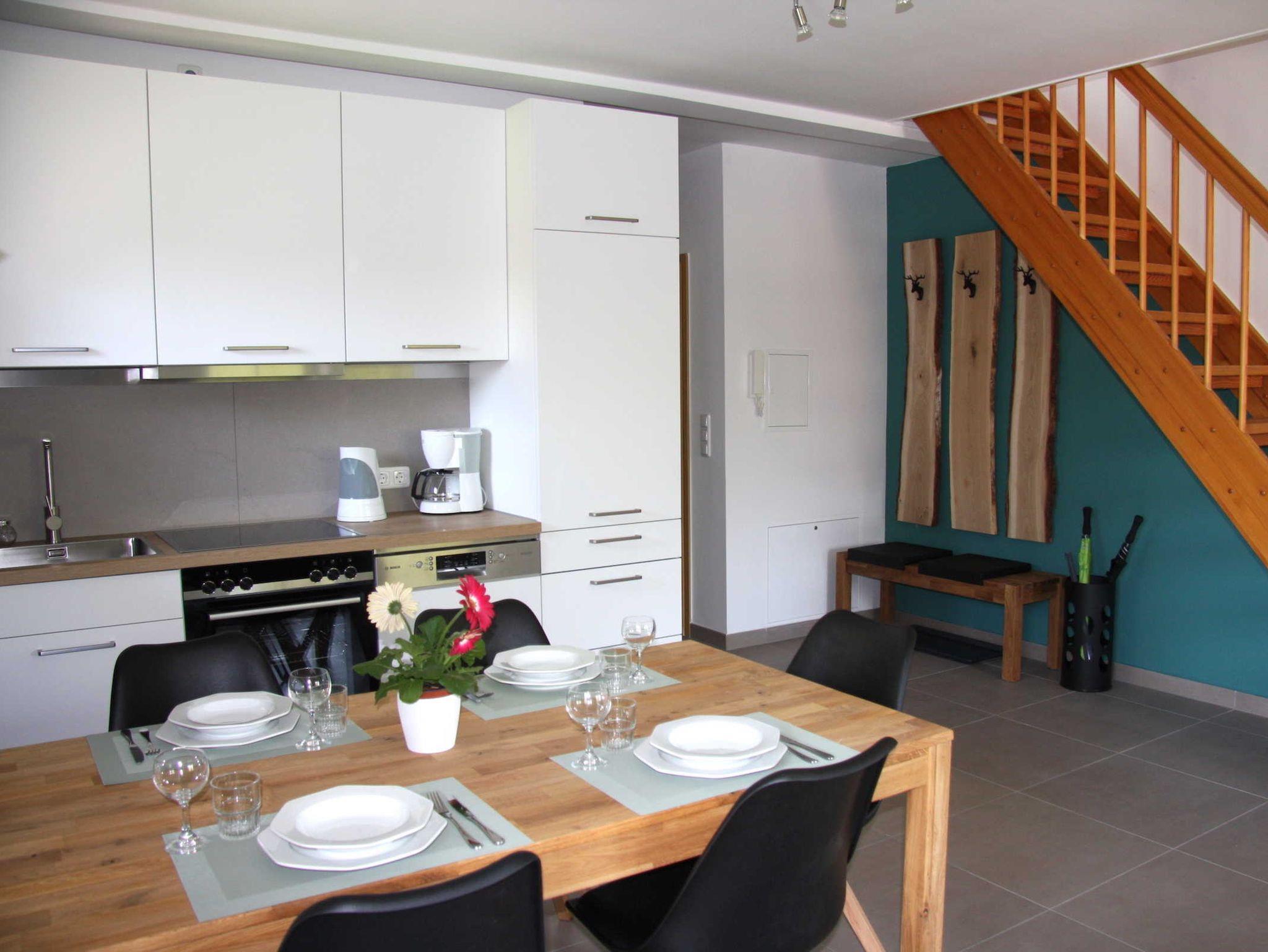 Die 3-Zimmer Maisonettewohnungen (70 m²) für Familien befinden sich im 1. OG und bieten einen wunderschönen Blick in die Natur. Die Maisonettewohnungen haben 2 Schlafzimmer mit Boxspringbetten, 2 Badezimmer, einen großen Wohnraum mit Couchgarnitur (Schlafsofa), eine integrierte Einbauküche mit Essbereich und einen Balkon. Die Küche ist in den großen Wohnraum integriert.