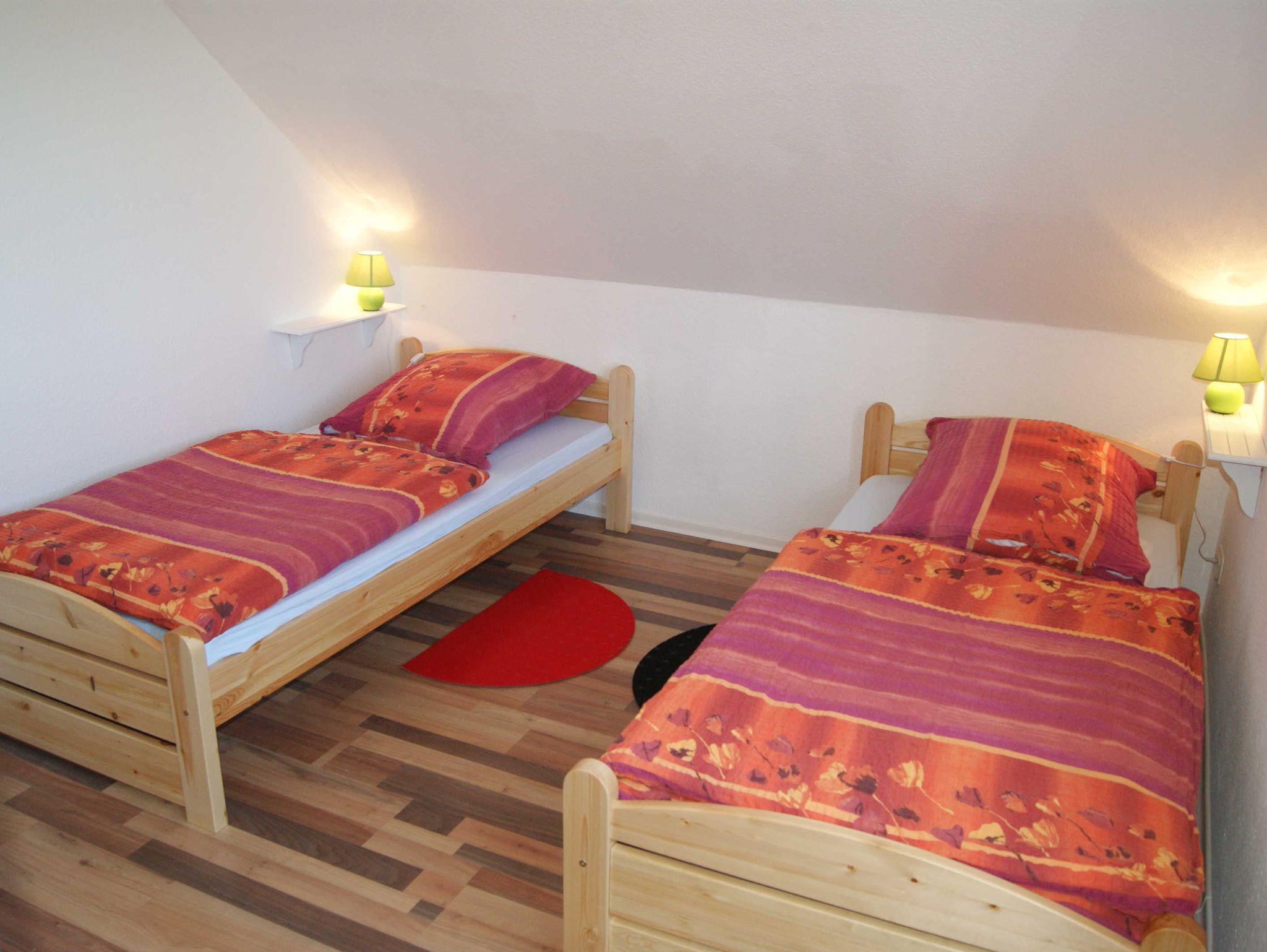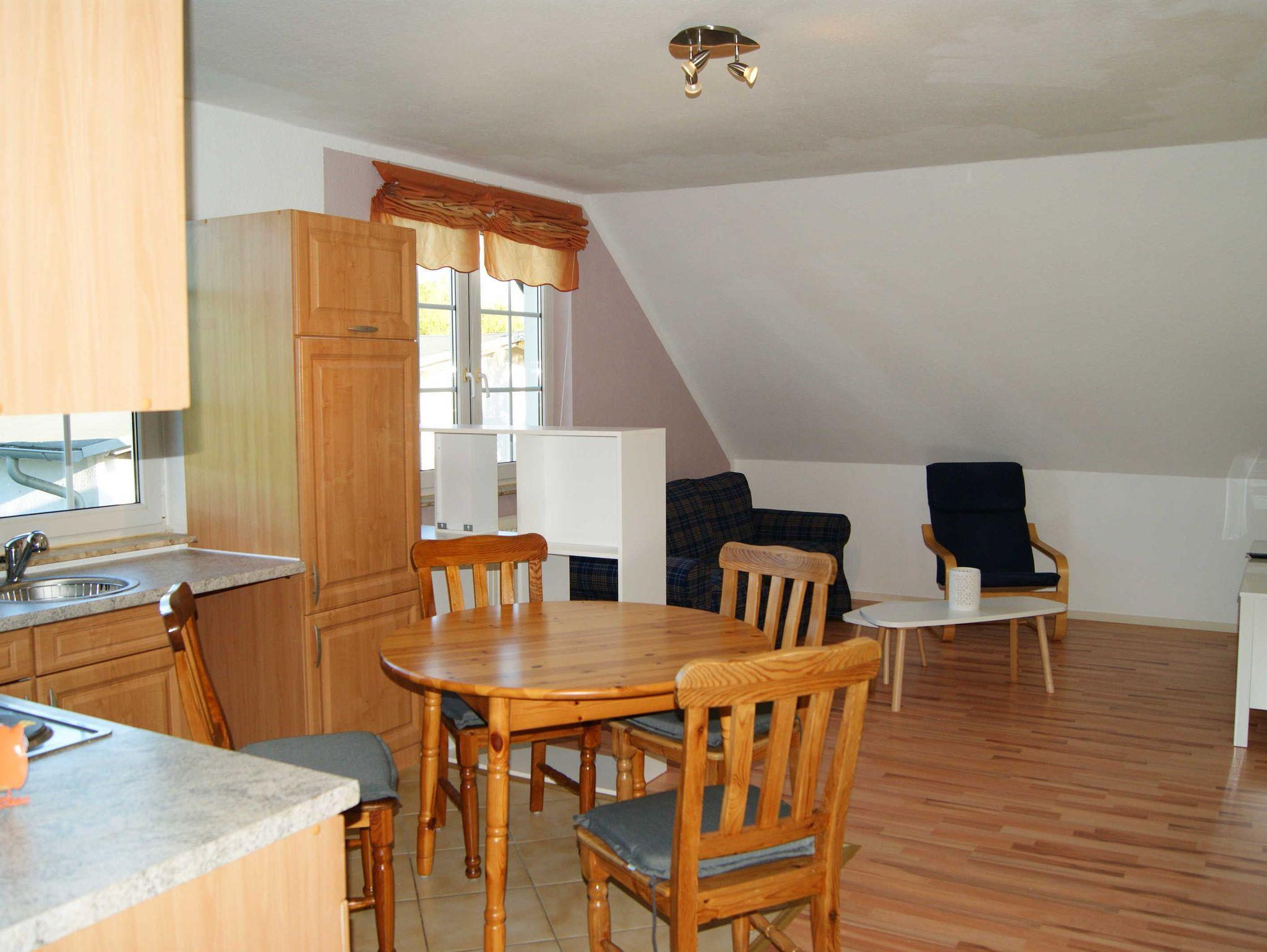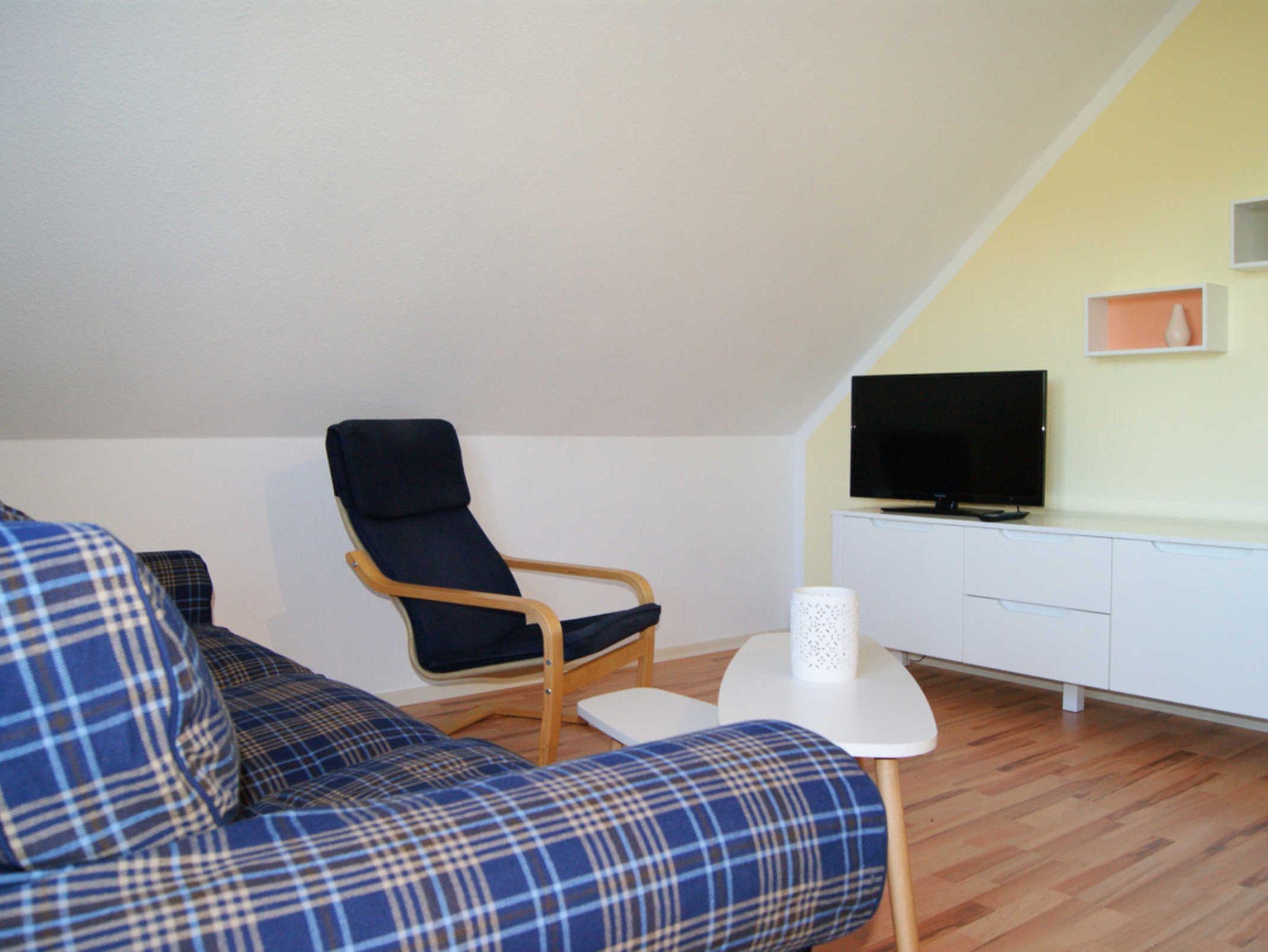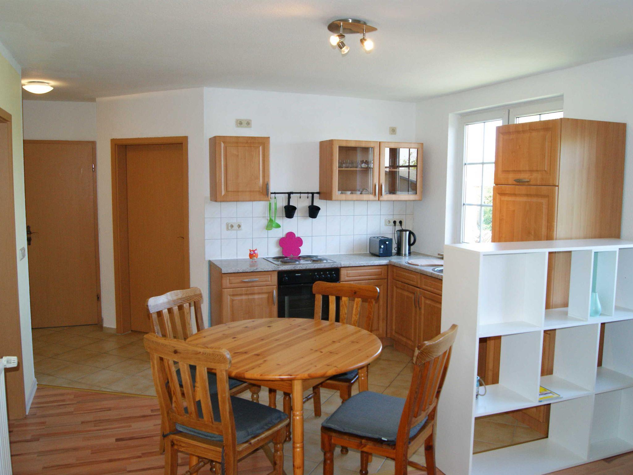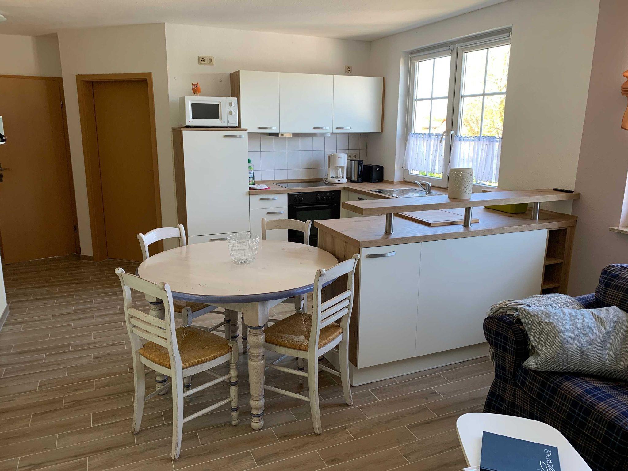 Die Ferienwohnung verfügt neben dem großen Wohnzimmer mit offener Küche und Esstisch über zwei Schlafzimmer je mit Doppel- bzw. Einzelbetten.