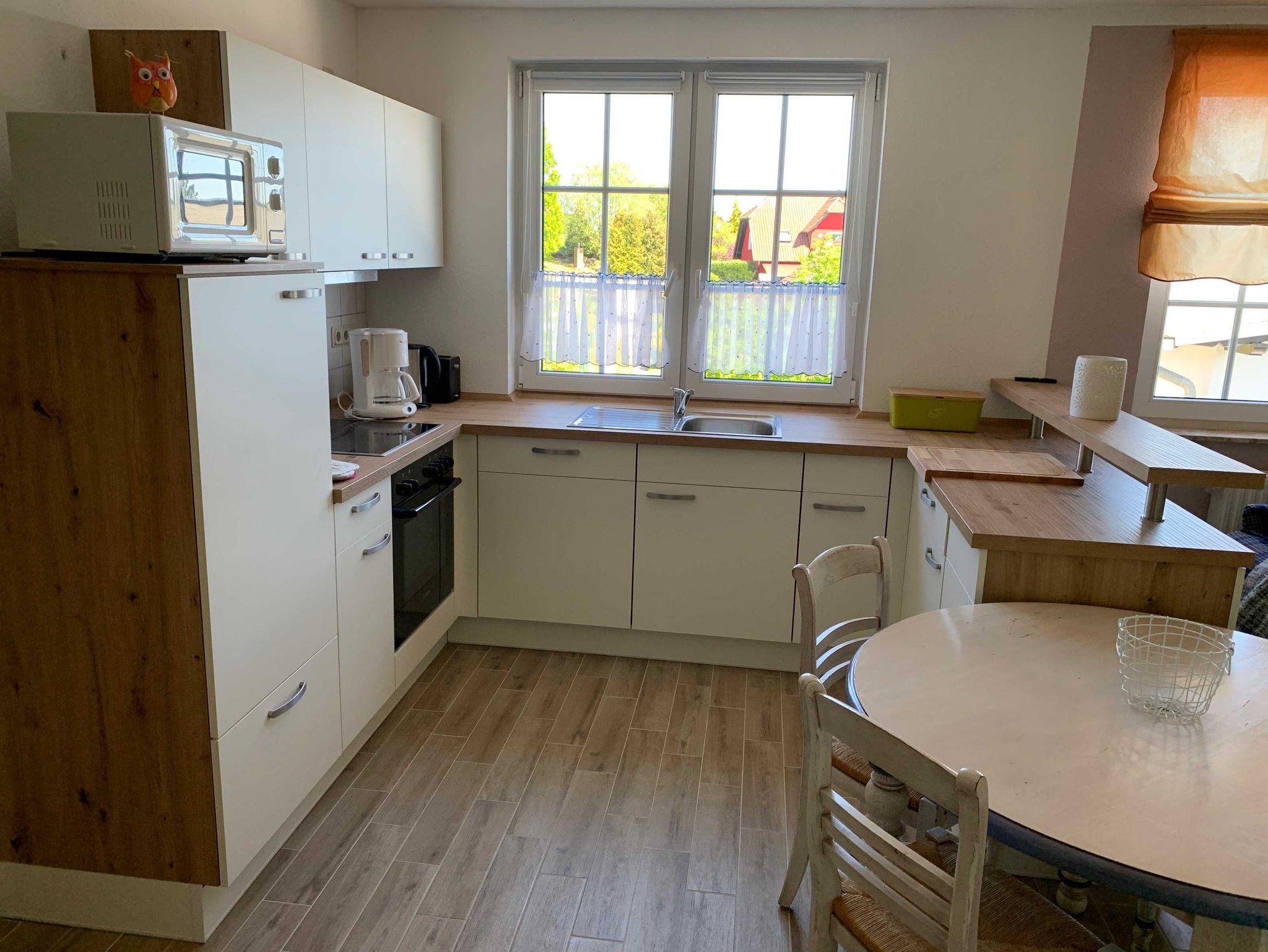 Die Küchenzeile beinhaltet Herd mit Backofen, Kühlschrank mit Tiefkühlfach, Mikrowelle, Kaffeemaschine, Toaster und einen Wasserkocher.
