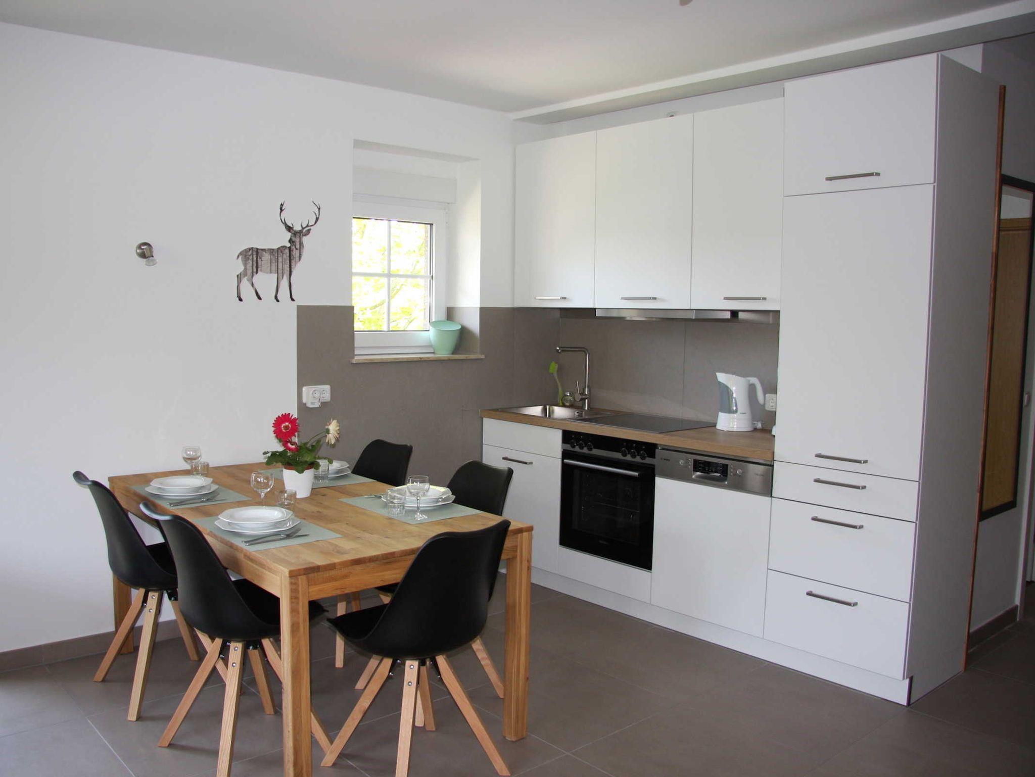 Die 3-Zimmer Maisonettewohnungen (70 m²) für Familien befinden sich im 1. OG und bieten einen wunderschönen Blick in die Natur. Die Maisonettewohnungen haben 2 Schlafzimmer mit Boxspringbetten, 2 Badezimmer, einen großen Wohnraum mit Couchgarnitur (Schlafsofa), eine integrierte Einbauküche mit Essbereich und einen Balkon. Die Küche ist in den großen Wohnraum integriert.