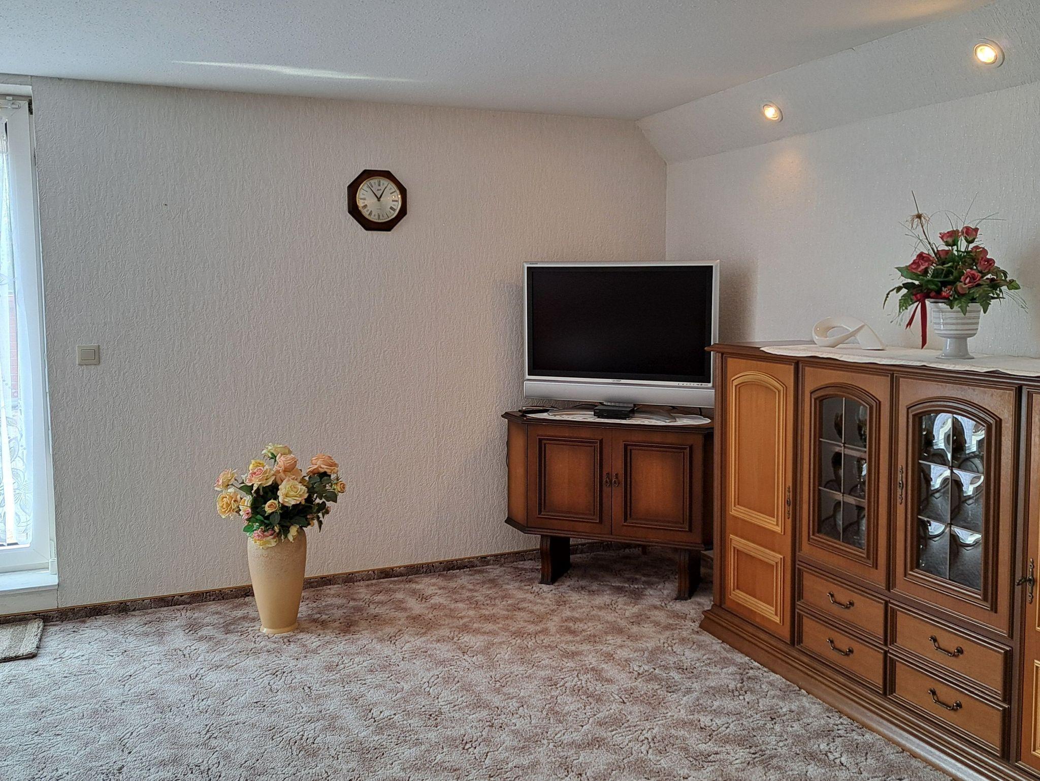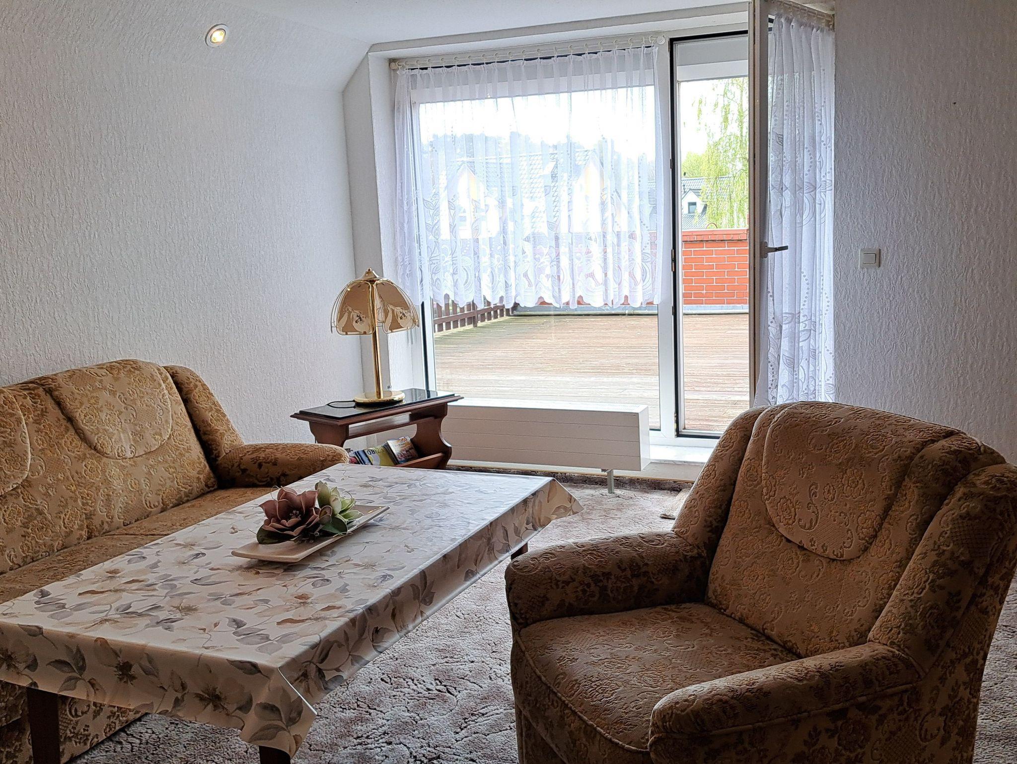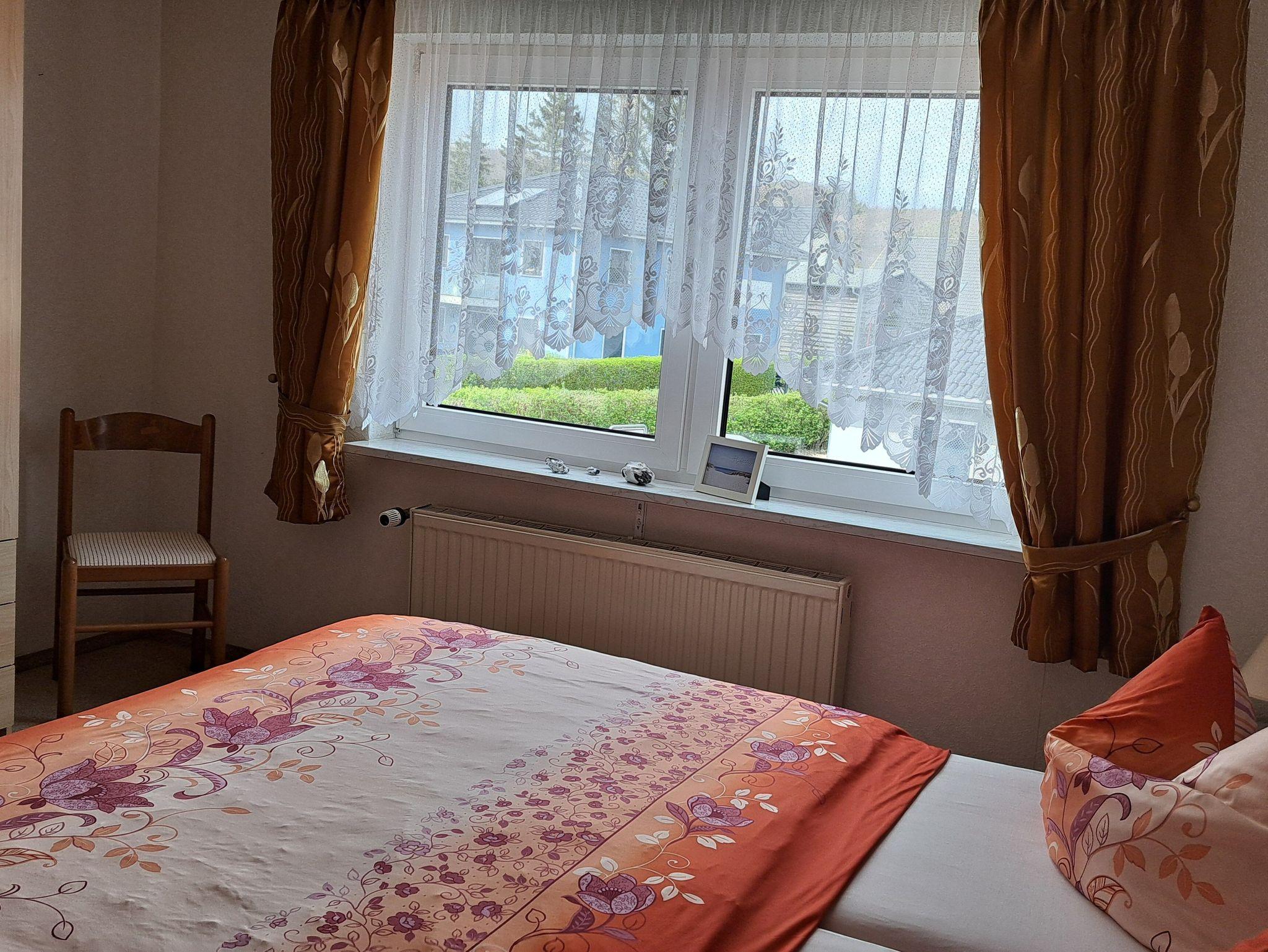 Die gemütlich 75qm große Ferienwohnung befindet sich in der ersten Etage eines Doppelhauses. Sie verfügt über einen Wohnraum mit Radio und TV, zwei separate Schlafräume, eine modern ausgestattete Küche, sowie Dusche/WC. Eine Terrasse in Süd/Westlage mit Gartenmöbeln lädt bei Sonnenschein zum Verweilen ein. Die Erstausstattung der Bettwäsche stellt der Vermieter Ihnen kostenlos zur Verfügung, bitte bringen Sie die Handtücher mit, ein PKW-Stellplatz ist auf dem Grundstück . Bitte erst ab 15.00 Uhr anreisen.