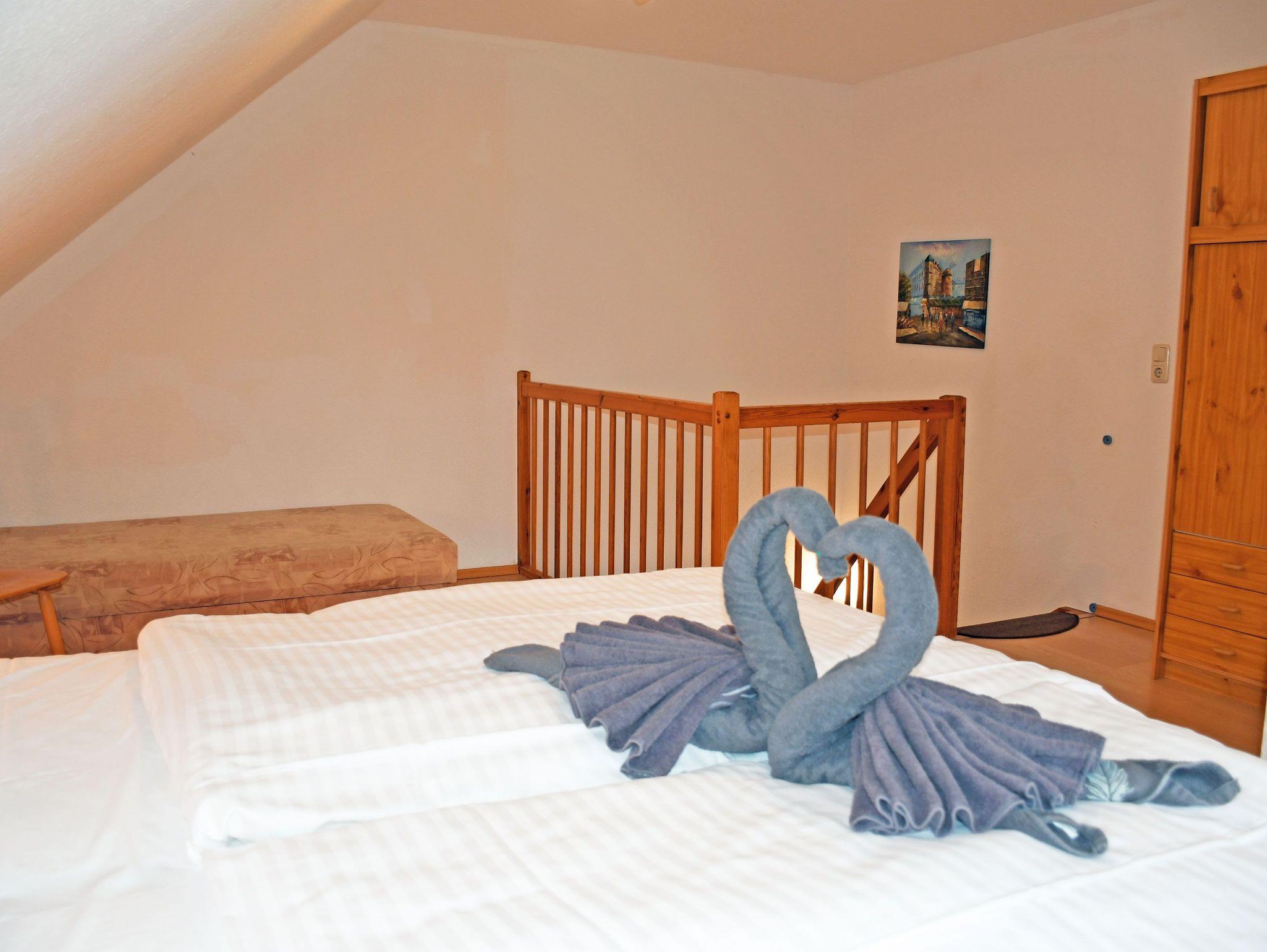 Über eine Holztreppe gelangt man in das Obergeschoss. Das Schlafzimmer verfügt über ein bequemes Doppelbett und ein Einzelbett mit Nachttischen und Leselampen sowie Ablageschränken. Bei Ihrer Anreise sind die Betten selbstverständlich bereits mit Bettwäsche bezogen und frische Handtücher liegen bereit.