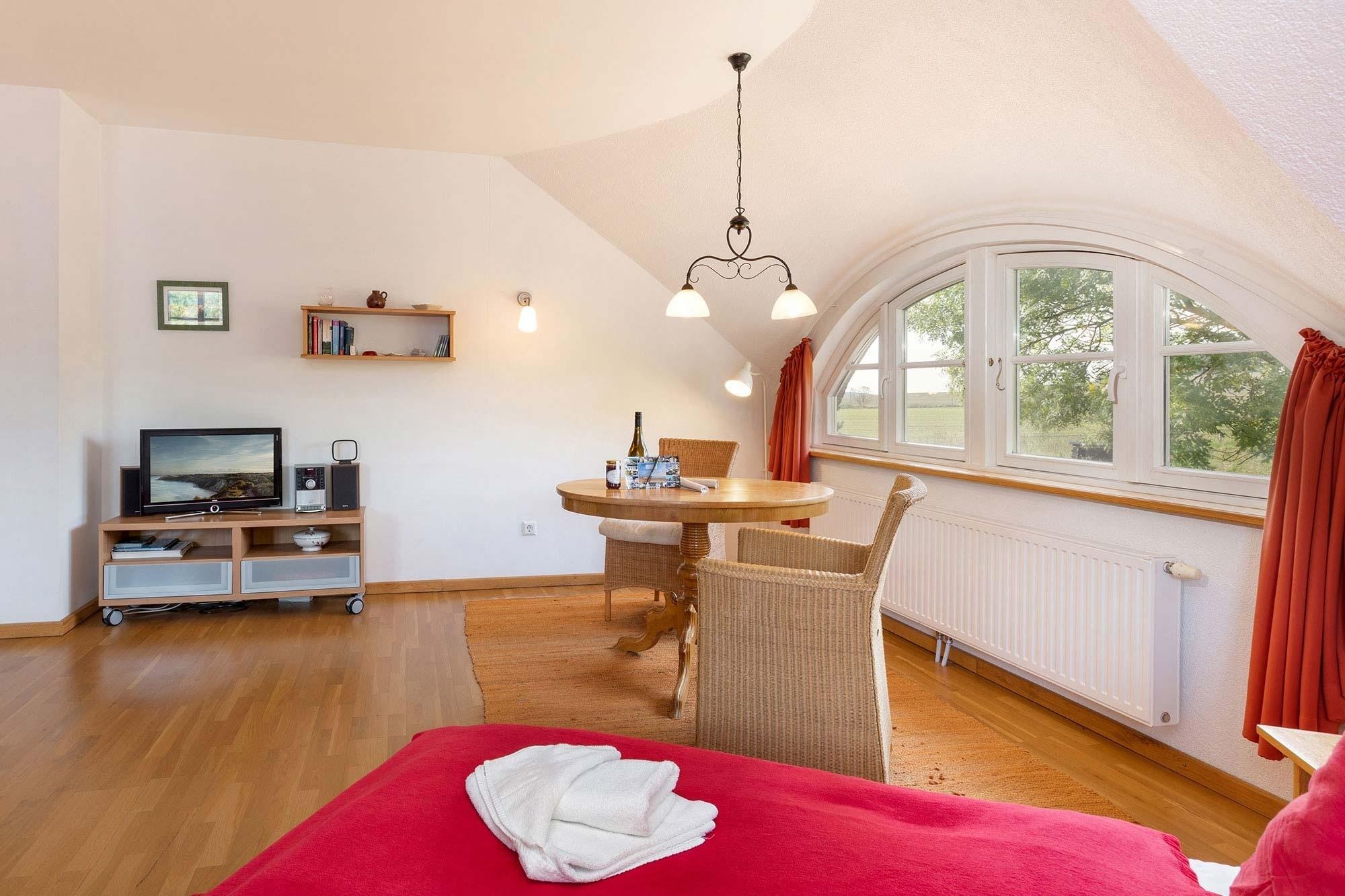 „Die kleine Rote“ ist die ideale Ferienwohnung für ruhesuchende Alleinreisende, aber auch für frisch Verliebte und Paare, die inmitten herrlicher Natur Harmonie und Zweisamkeit genießen möchten. Romantische Dachschrägen, angenehme Naturtöne und das traumhafte Gaubenfenster lassen Ihr Urlaubsdomizil in einladendem Licht erstrahlen. Und damit Sie sich hier auch außerhalb der sommerlichen Badesaison so richtig wohlfühlen können, haben Ihre freundlichen Gastgeber an alles gedacht: Auf den rund 40 liebevoll eingerichteten Quadratmetern Wohnfläche erwarten Sie neben einem kuschligen Doppelbett (140x200cm), einer komplett ausgestattete Küchenzeile und einem schönen Wannenbad auch ein moderner Flachbild-TV, Radio/CD-Player und kostenfreies W-LAN.
