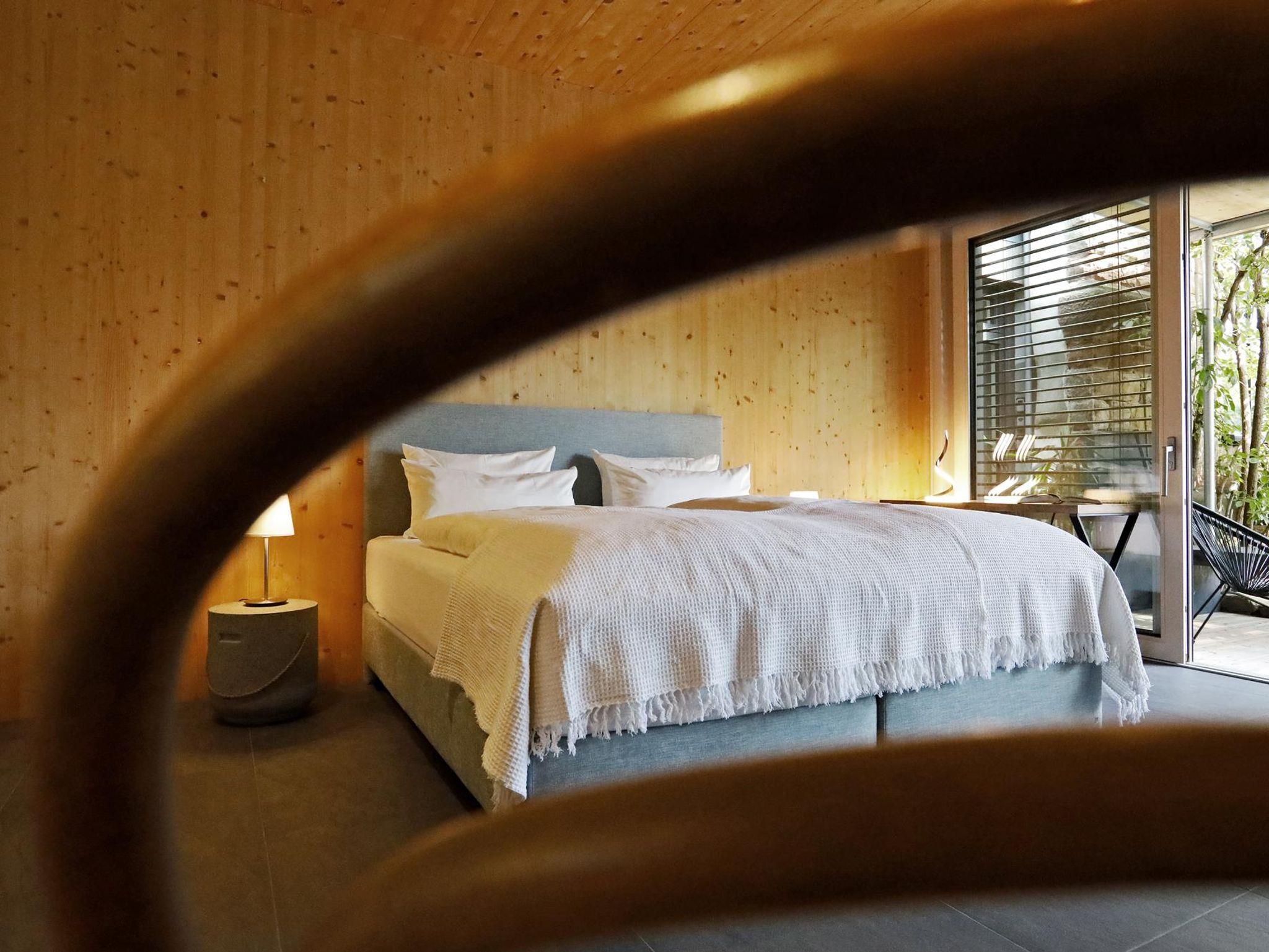 Sie liegen zentral an einem ruhigen Stadtplatz und sind Teil eines Ensembles aus historischem Wassertürmchen und Neubau. Dieser neue Holzbau ist in ökologischer Massivholzbauweise erstellt. Besonderes Augenmerk haben wir auf die Verwendung baubiologisch einwandfreier Baustoffe gelegt. Das begrünte Flachdach wirkt klimatisierend, so dass wir bislang auf eine aufwendige Klimatechnik verzichten konnten. Die gewählte Baukonstruktion schirmt das Gebäude gegen gesundheitsschädliche Strahlungen wie Radon und elektromagnetische Wellen ab. Nach ausgedehnten Wanderungen im Pfälzer Wald finden unsere Gäste in den naturbelassenen Holzinnenräumen eine wohlige Atmosphäre. Die barrierefreie, schwellenlose Gestaltung der Ferienanlage machen den Aufenthalt für Senioren genauso interessant wie für sportlich aktive junge Feriengäste.