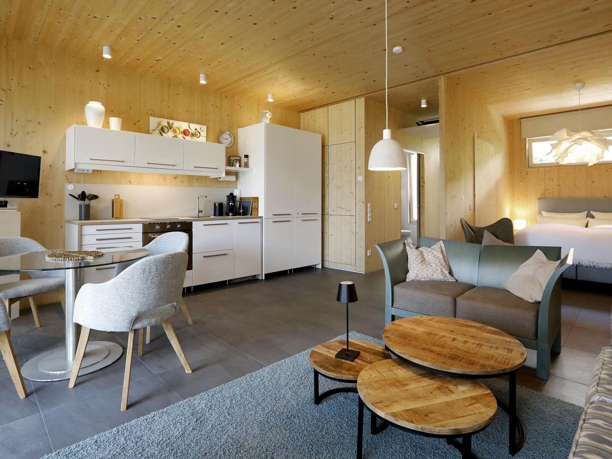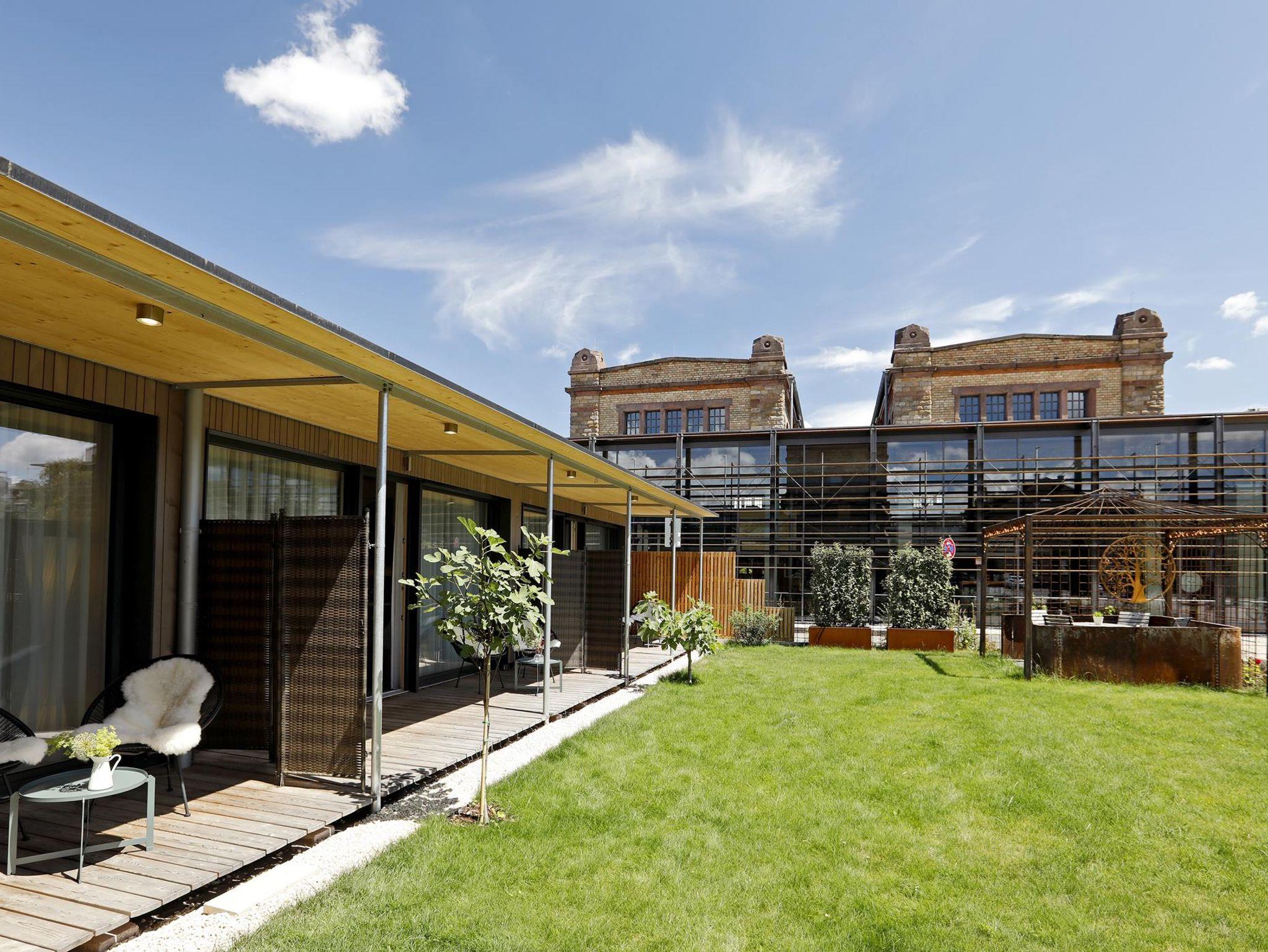 Sie liegen zentral an einem ruhigen Stadtplatz und sind Teil eines Ensembles aus historischem Wassertürmchen und Neubau. Dieser neue Holzbau ist in ökologischer Massivholzbauweise erstellt. Besonderes Augenmerk haben wir auf die Verwendung baubiologisch einwandfreier Baustoffe gelegt. Das begrünte Flachdach wirkt klimatisierend, so dass wir bislang auf eine aufwendige Klimatechnik verzichten konnten. Die gewählte Baukonstruktion schirmt das Gebäude gegen gesundheitsschädliche Strahlungen wie Radon und elektromagnetische Wellen ab. Nach ausgedehnten Wanderungen im Pfälzer Wald finden unsere Gäste in den naturbelassenen Holzinnenräumen eine wohlige Atmosphäre. Die barrierefreie, schwellenlose Gestaltung der Ferienanlage machen den Aufenthalt für Senioren genauso interessant wie für sportlich aktive junge Feriengäste.