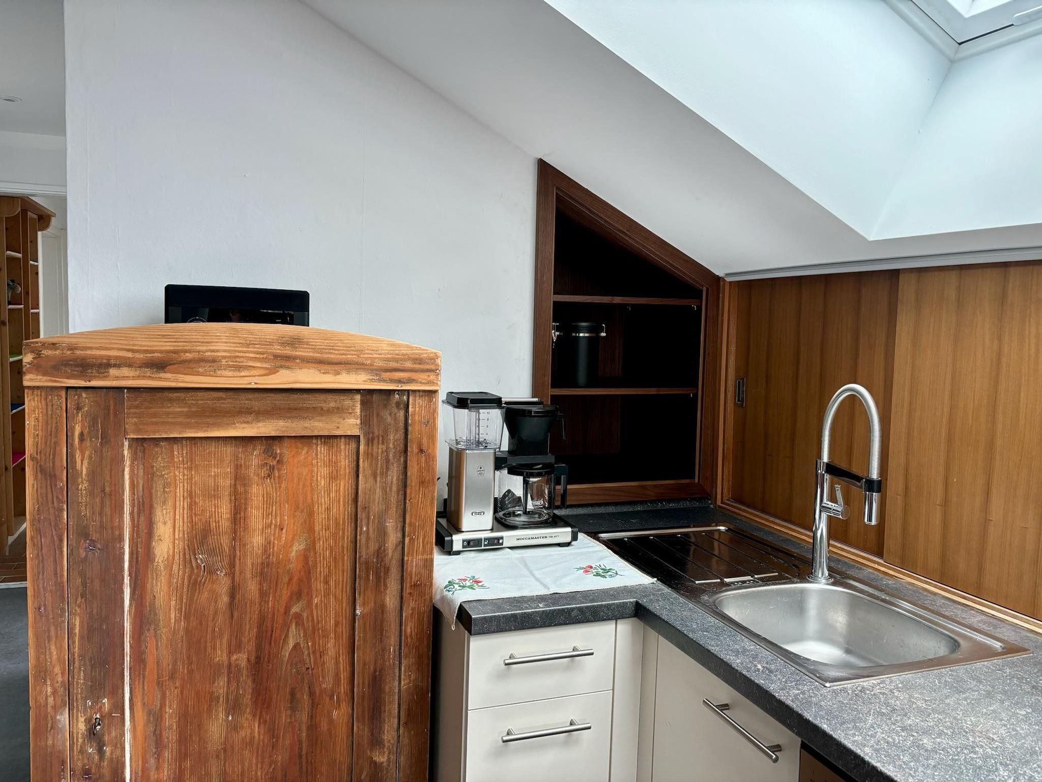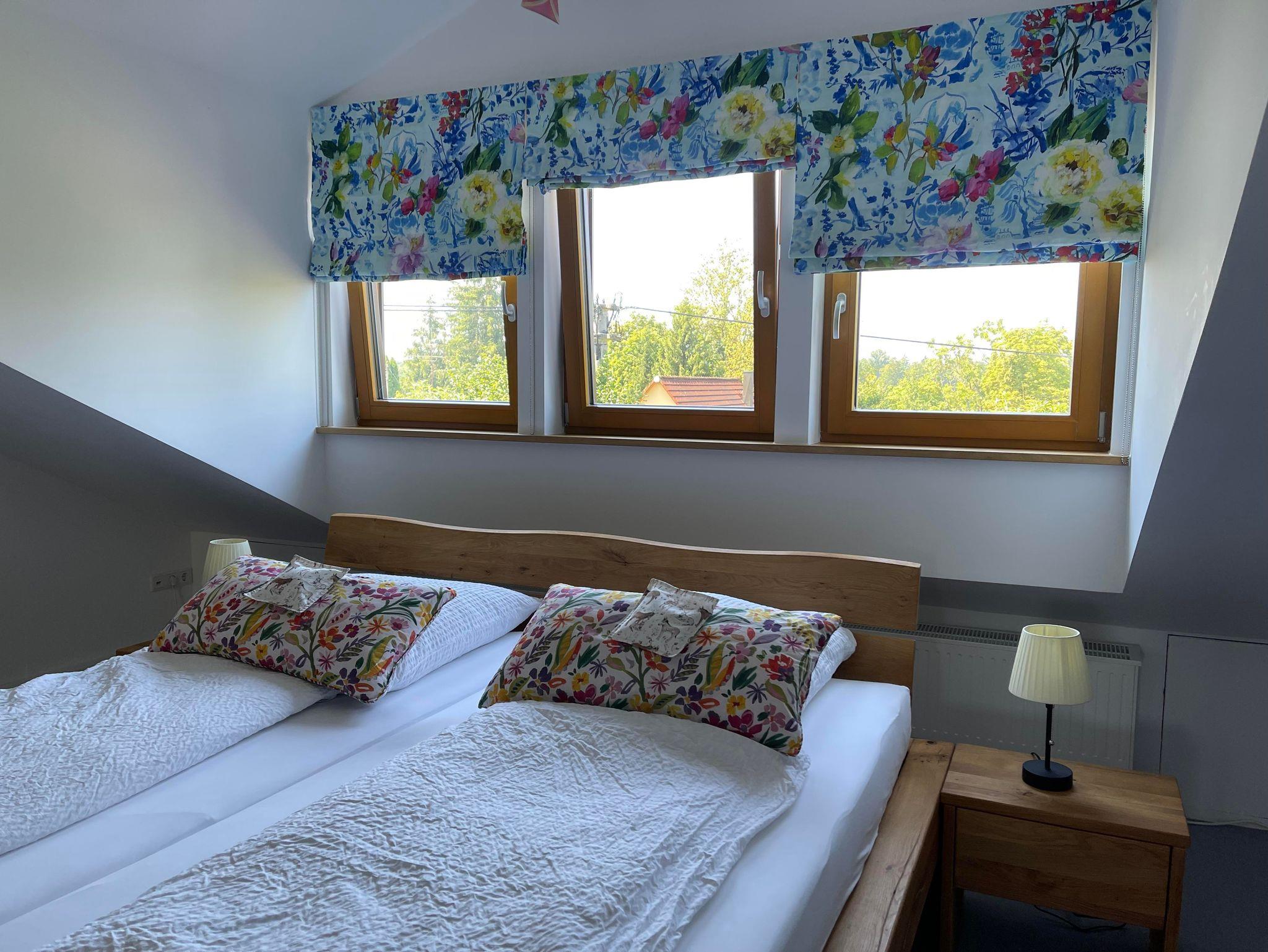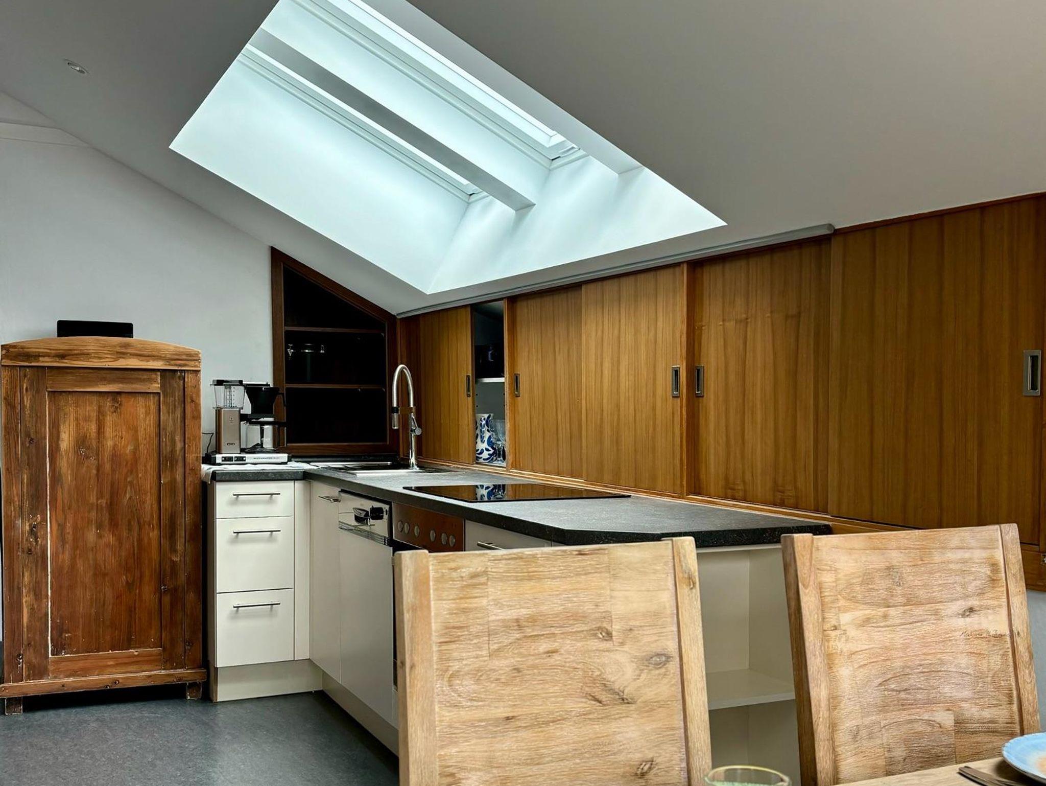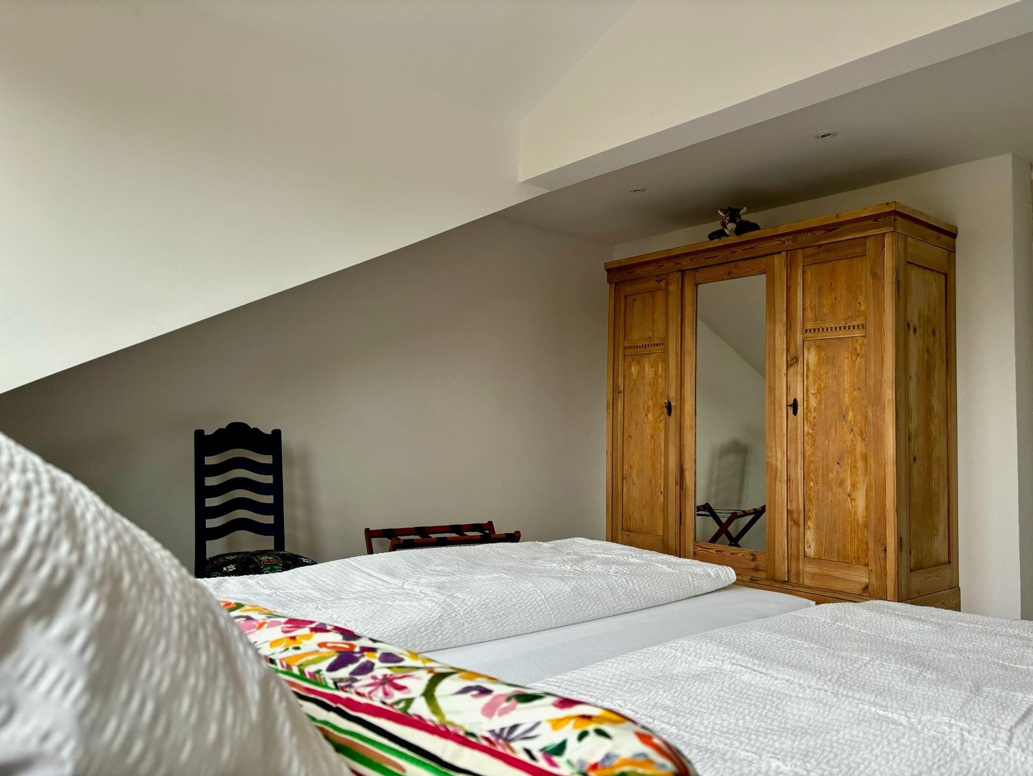Wir vermieten eine Ferienwohnung, die 2024 saniert wurde. Dabei wurde durch die Dämmung des Daches die Balkenlage sichtbar gemacht. Die Wohnung ist nicht barrierefrei. Sie verfügt über drei Zimmer und ist ca. 72 qm groß. Ein Schlafzimmer ist etwas größer, ideal für zwei Personen. Das andere Schlafzimmer ist ein Einzelzimmer. Der große Ess- und Wohnbereich ist nach Süden ausgerichtet. Er bietet Platz für fünf Personen. Die Küche ist ebenfalls neu und mit allen notwendigen Utensilien eingerichtet. Zu guter Letzt gibt es noch zwei Dusche/WC mit Waschmaschine.