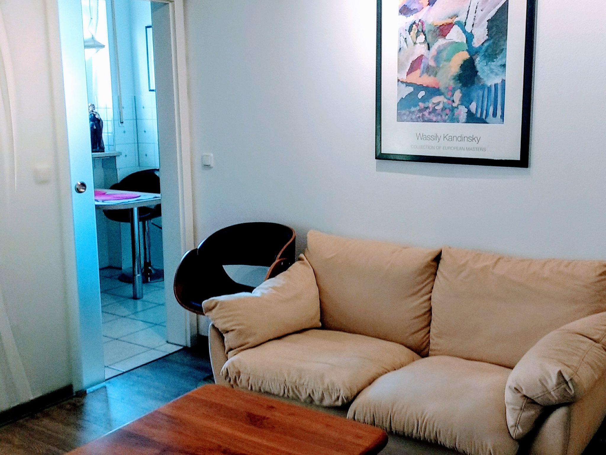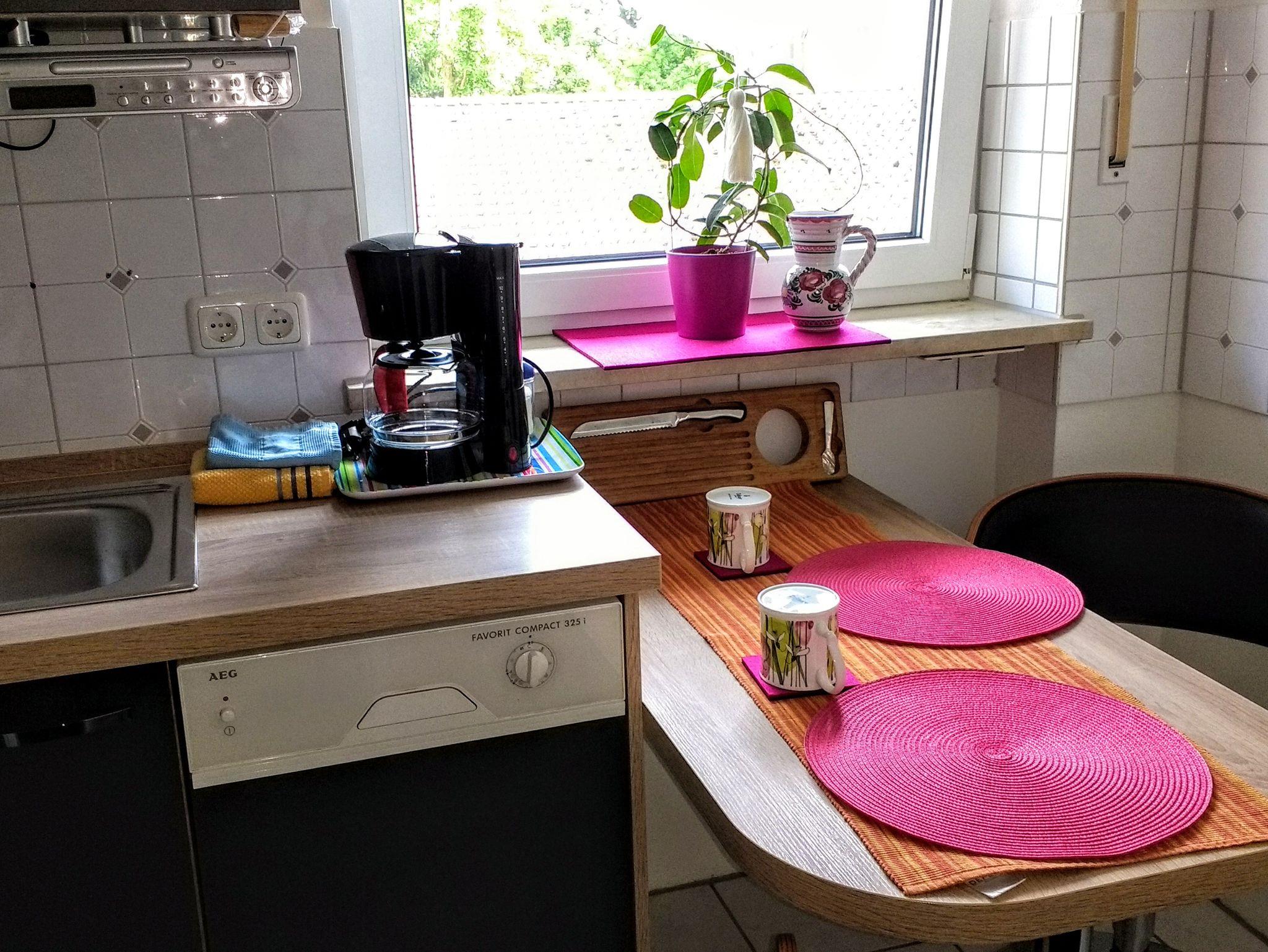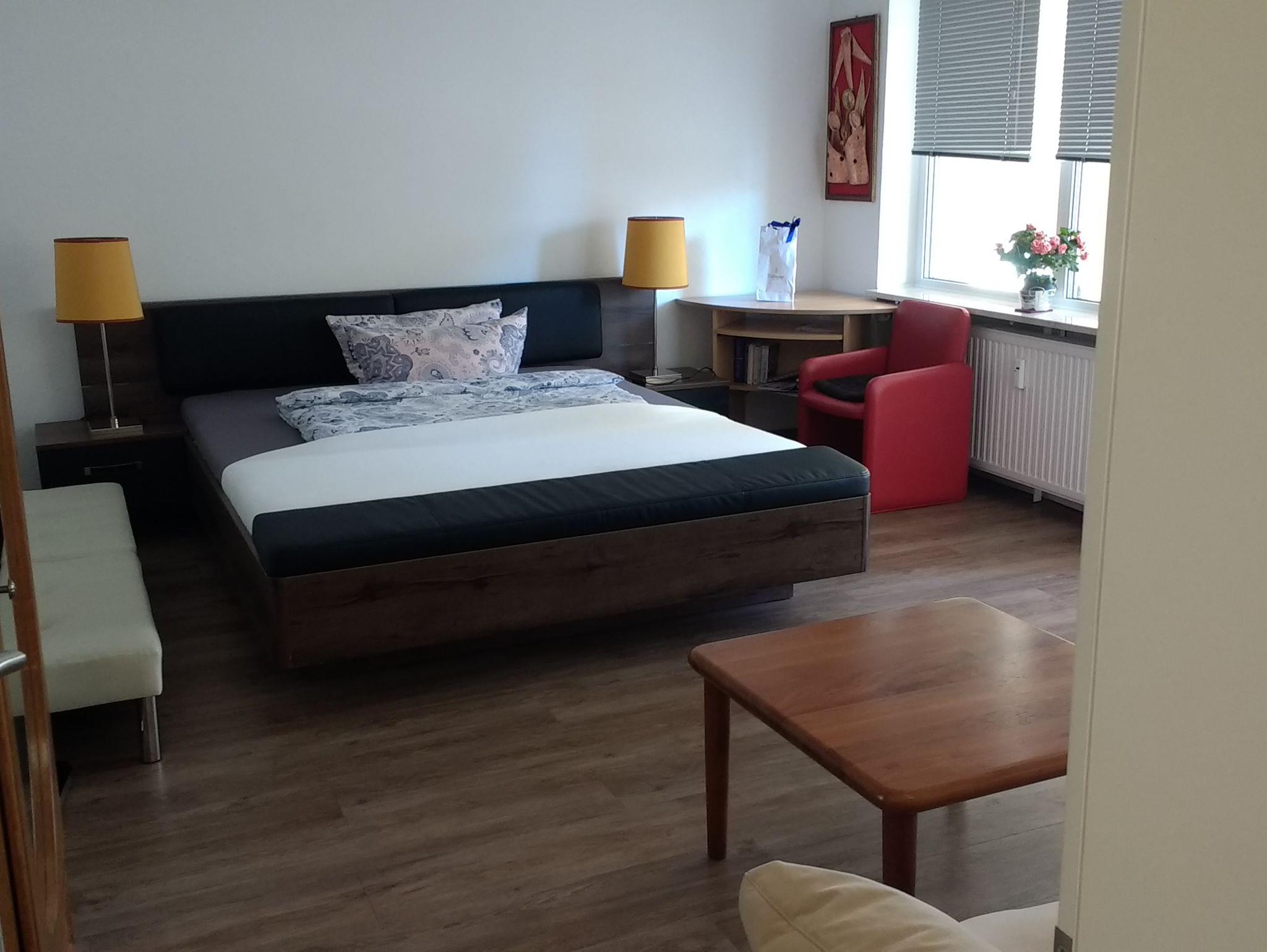 Die Wohnung ist möbliert mit einem modernen Doppelbett (1,80m x 2,00m) mit Fußbank, gemütlicher Doppelsitzer-Couch vollausgestatteter Küche mit Essbereich, Spülmaschine, Tee-, Kaffeemaschine, Wasserkocher, Kühl-Gefrierschrank mit 3 Sterne-Fach, außerdem Mikrowelle sowie Radio-CD-Player. In der Garderobe befinden sich zwei weitere Schränke. Während Ihres Aufenthaltes stellen wir kostenfrei Espresso, Kaffee (Kapselmaschine) und Tee für Sie bereit. Nach Absprache befüllen wir auch ihren Kühlschrank bereits vor Ihrer Ankunft.