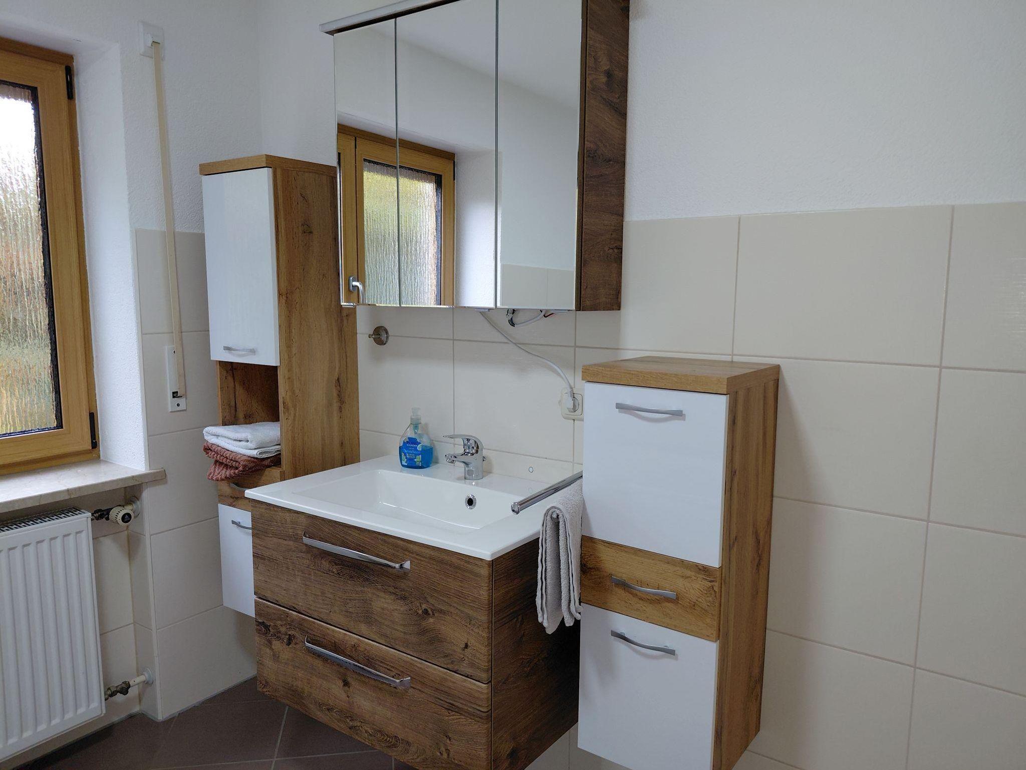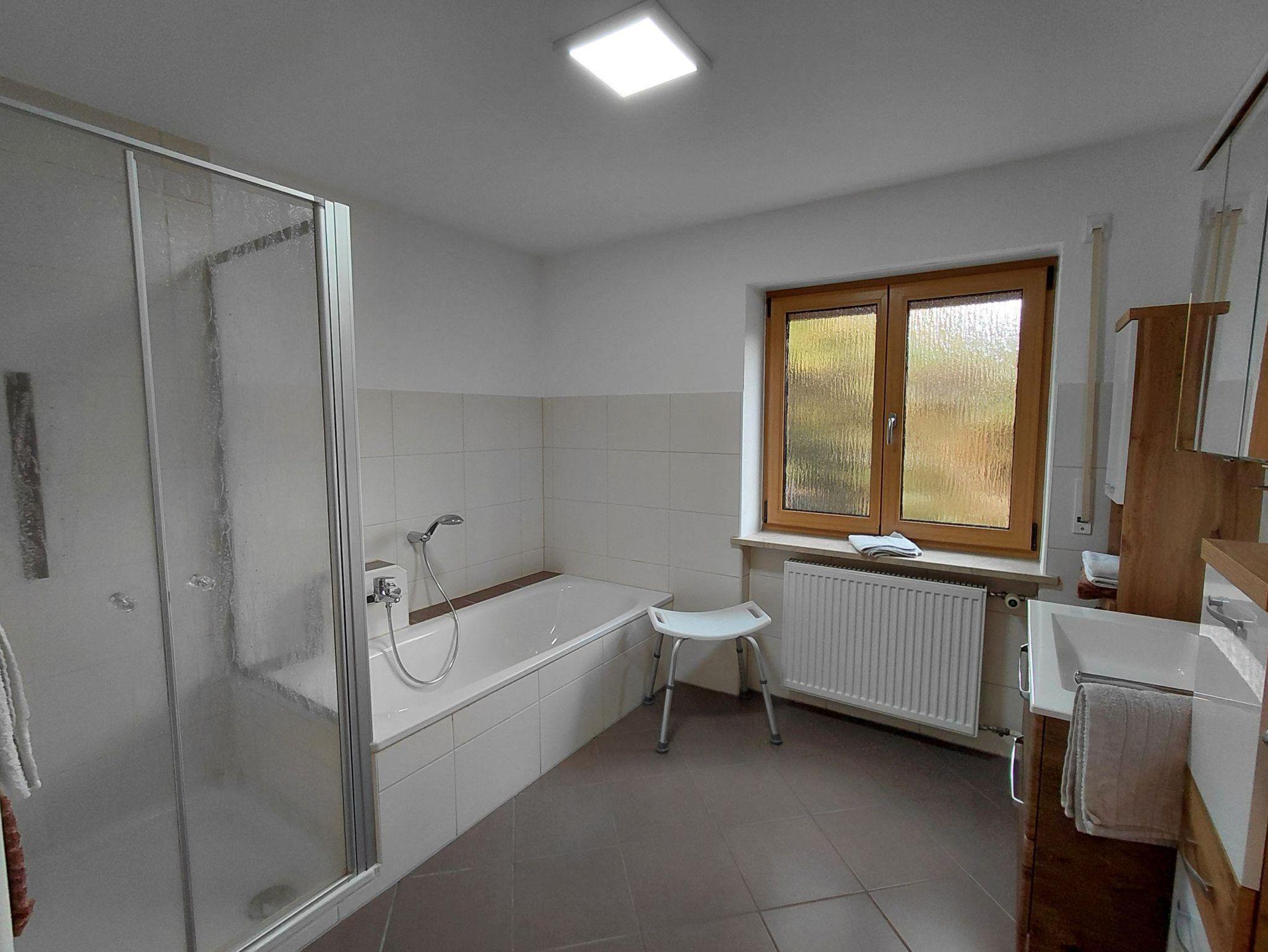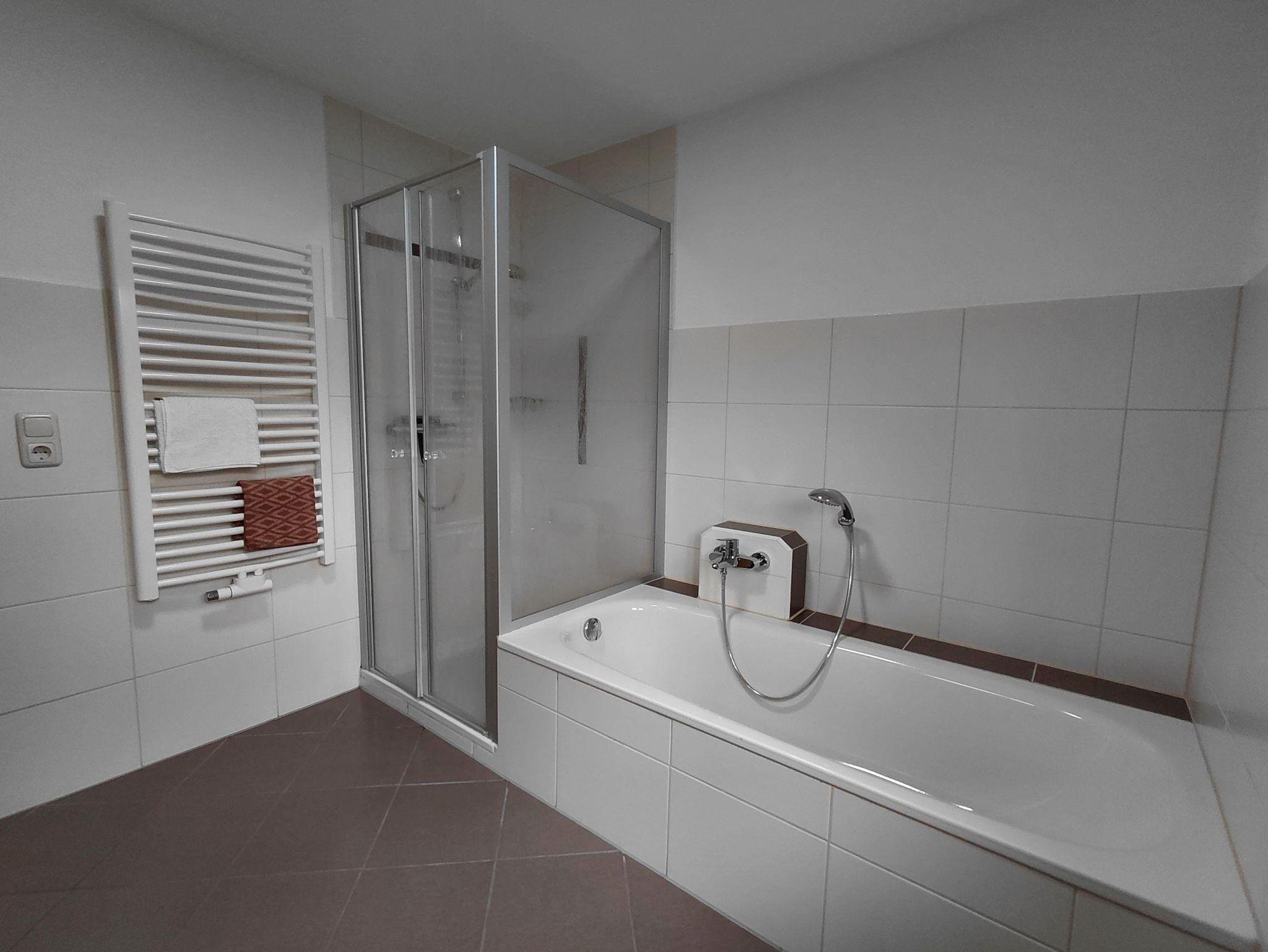 Das Bad ist ausgestattet mit einer Dusche mit moderatem Einstieg und einer Badewanne. Das WC ist seperat vom Badezimmer.