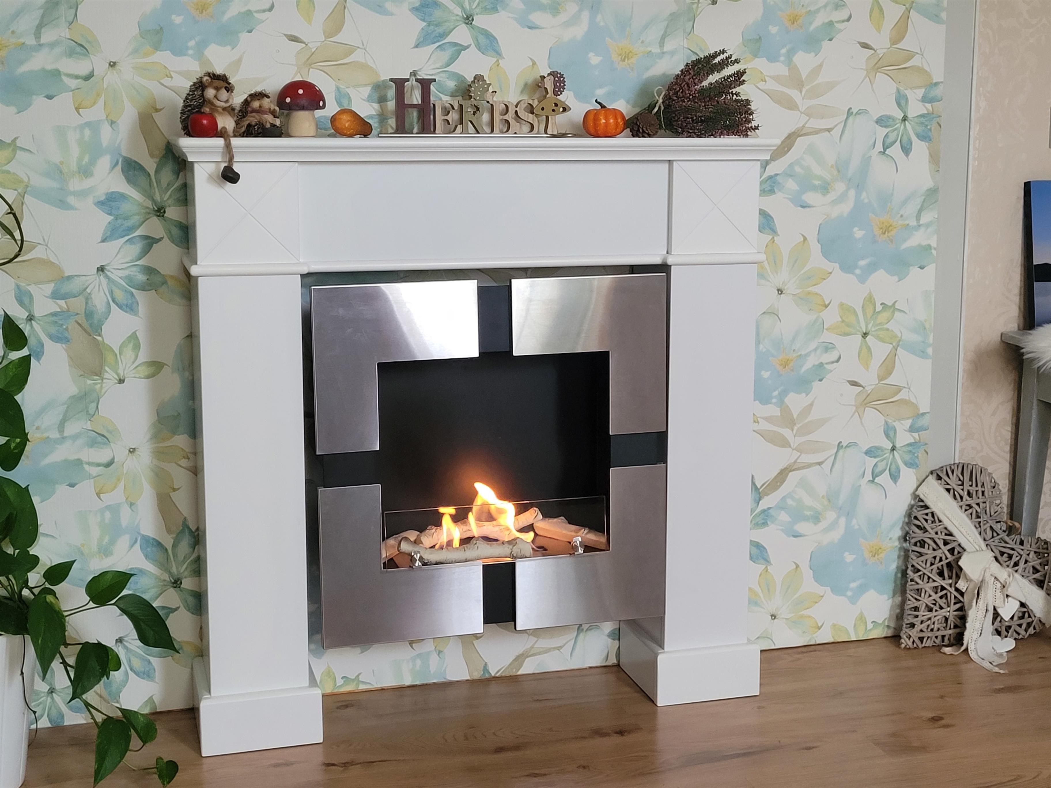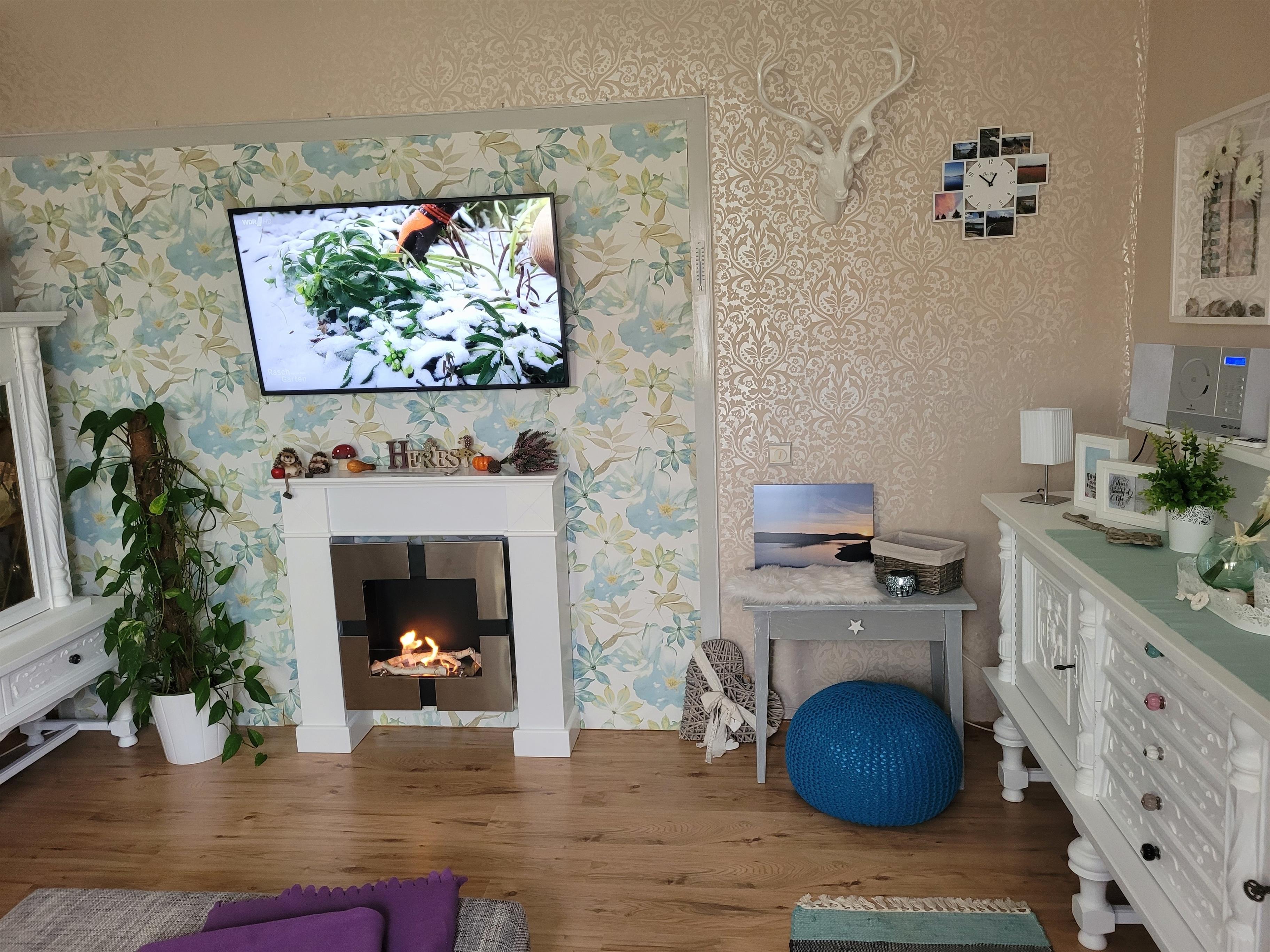 Schlafzimmer 1 mit Boxspringbett (180x200cm), Schlafzimmer 2 mit zwei einzelnen Boxspringbetten (je 80x200cm). Das helle Wohnzimmer ist mit Smart-TV, moderner Eckcouch und Ethanolkamin ausgestattet.