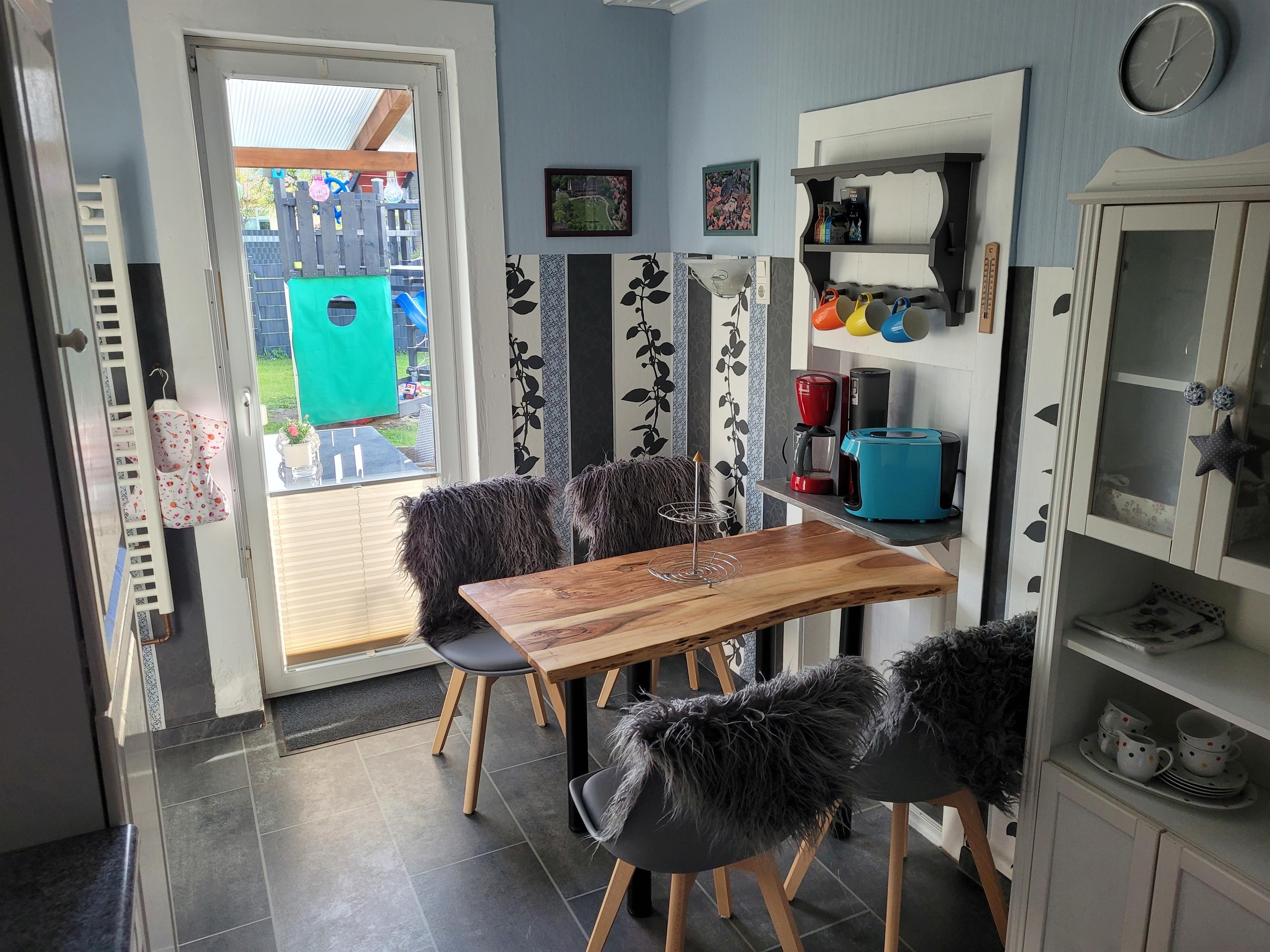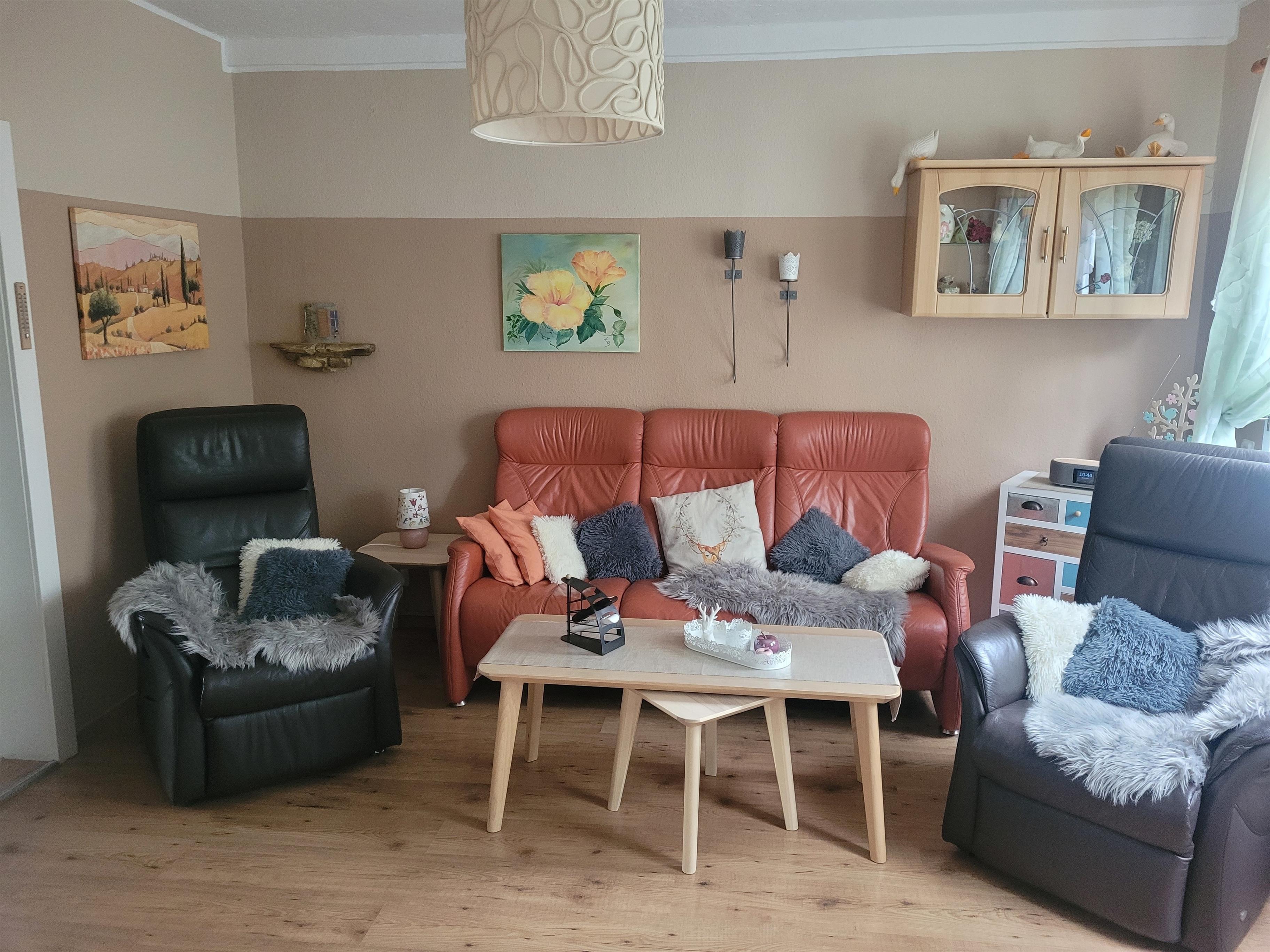 89 qm große 4ZKB-Nichtraucher-Fewo mit Kaminofen, 3 Schlafräumen, überdachter Terrasse und Gartennutzung mit Spielturm. Sie eignet sich für Familien (kinderfreundlich)