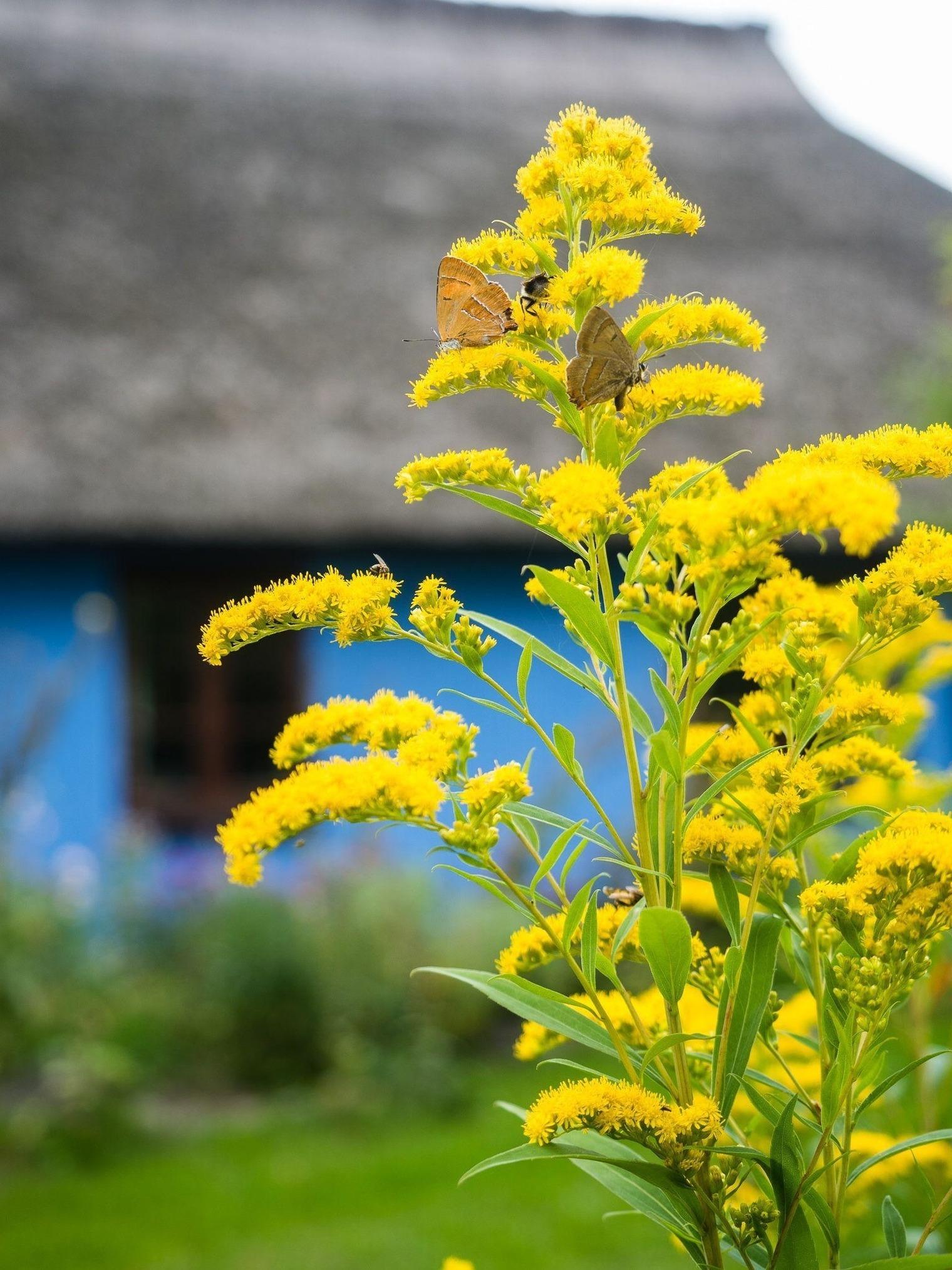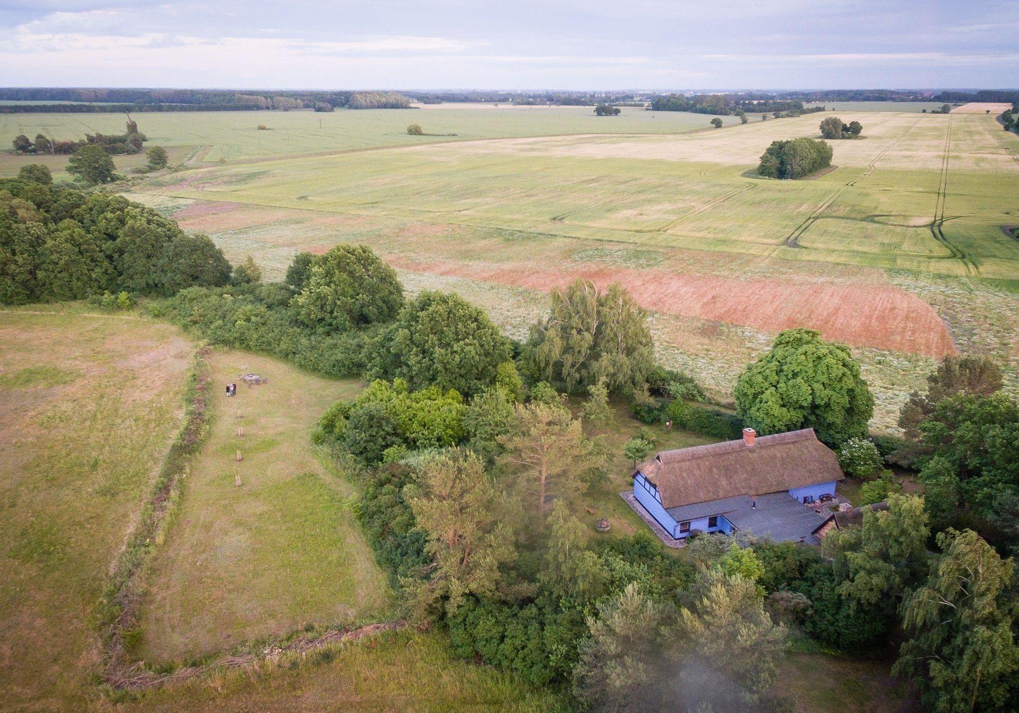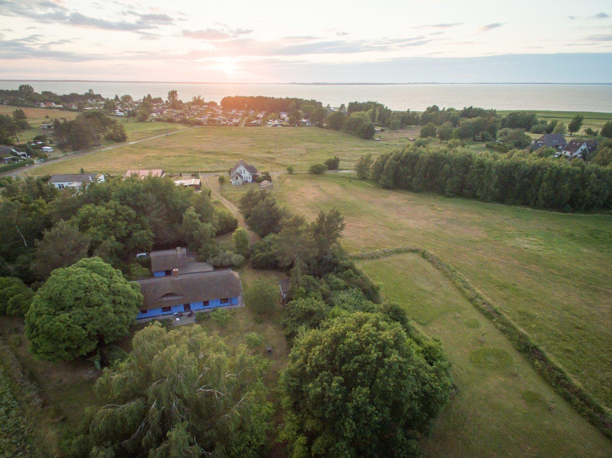 Das reetgedeckte blaue Haus und der Kastanienhof liegen in einem kleinem (staatlich anerkannten) Erholungsort am Saaler Bodden am Rande des Natonalparks Pommersche Boddenlandschaft.