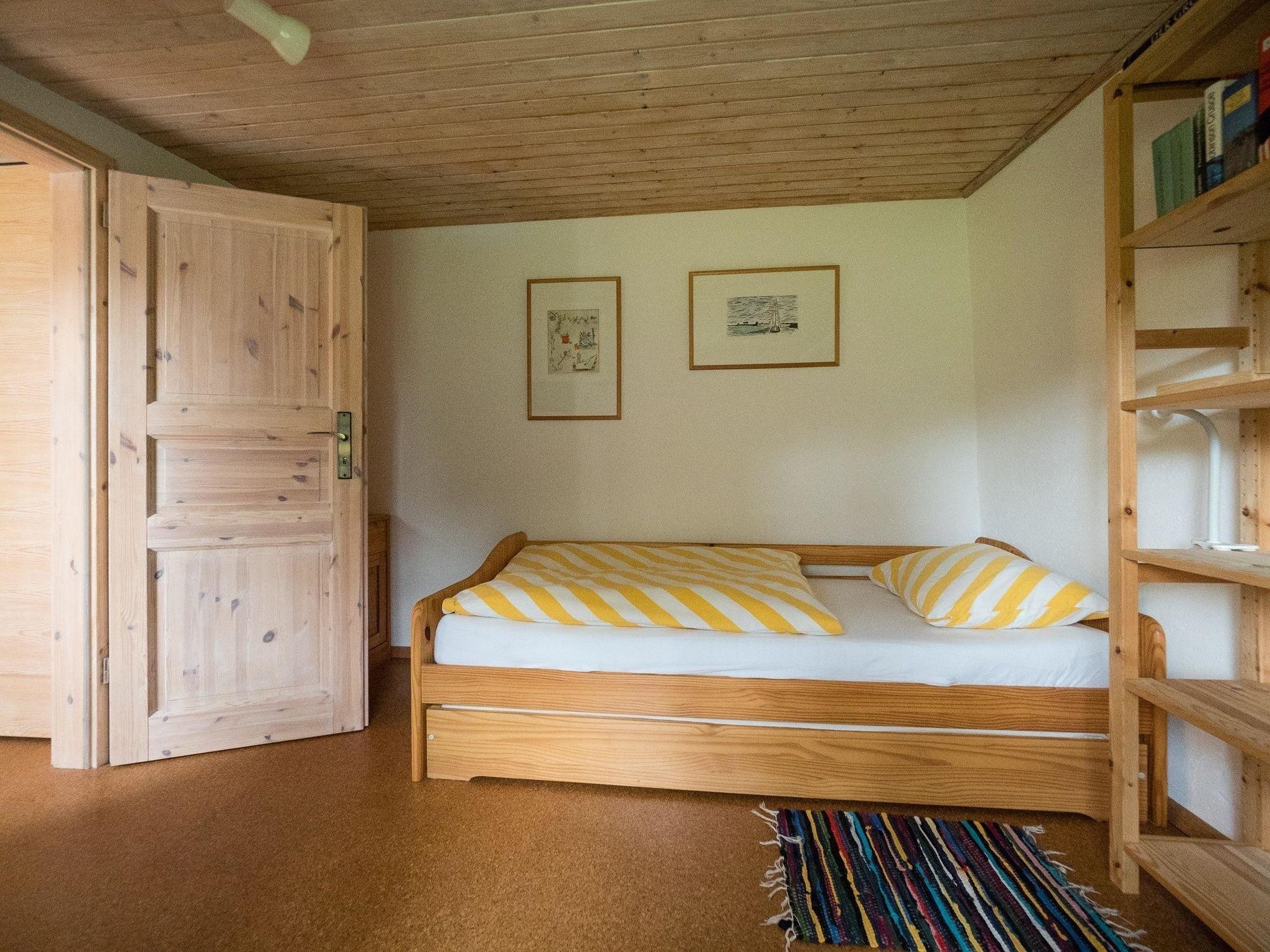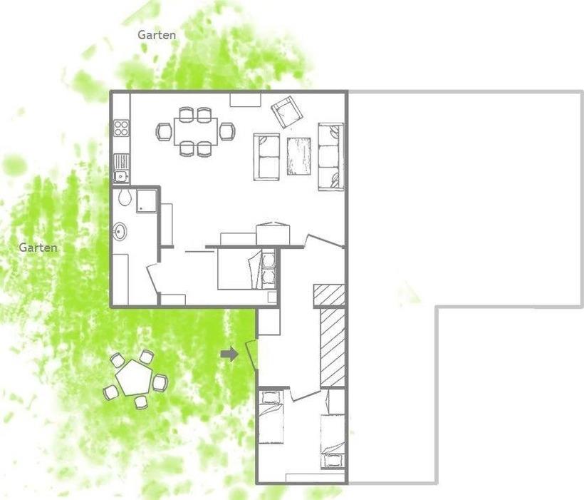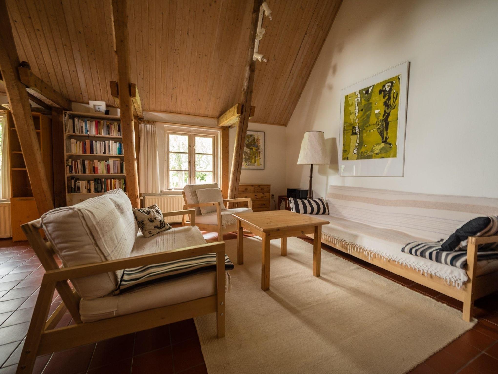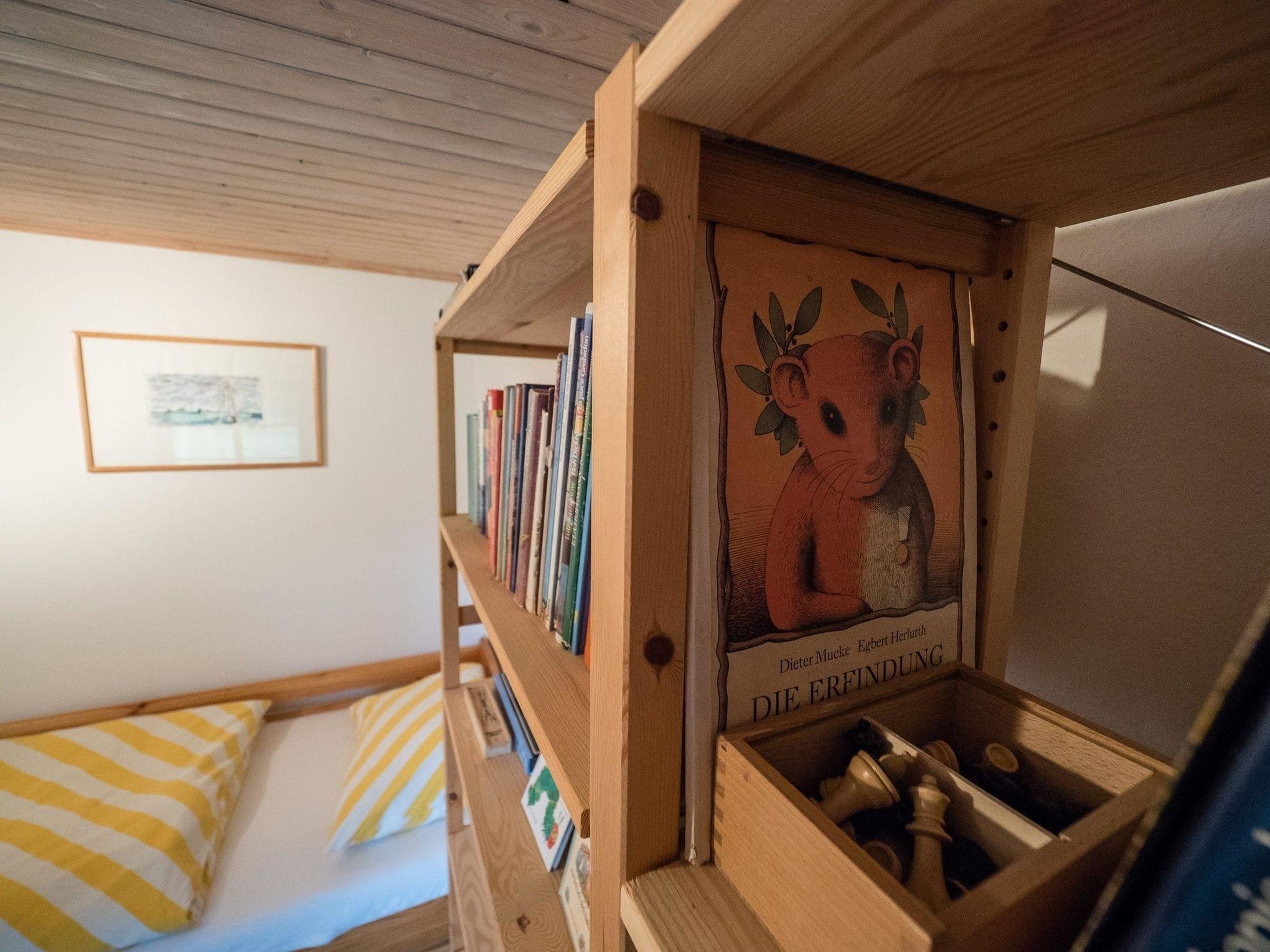 Der große Wohnloft ist teilweise bis in die Dachspitze offen. Im kleinem Schlafraum mit direktem Zugang zum Bad befindet sich ein Doppelbett. Ein zweites separat liegendes kleineres Zimmer neben dem Eingangsflur hat zwei Schlafmöglichkeiten und ein Regal voller Anregung für große und kleine Kinder. Das Appartement ist für Erwachsene und für Familien mit zwei Kindern ideal. Erwachsene sollten bedenken, dass der Zugang zu Bad/WC durch das Elternschlafzimmer verläuft.