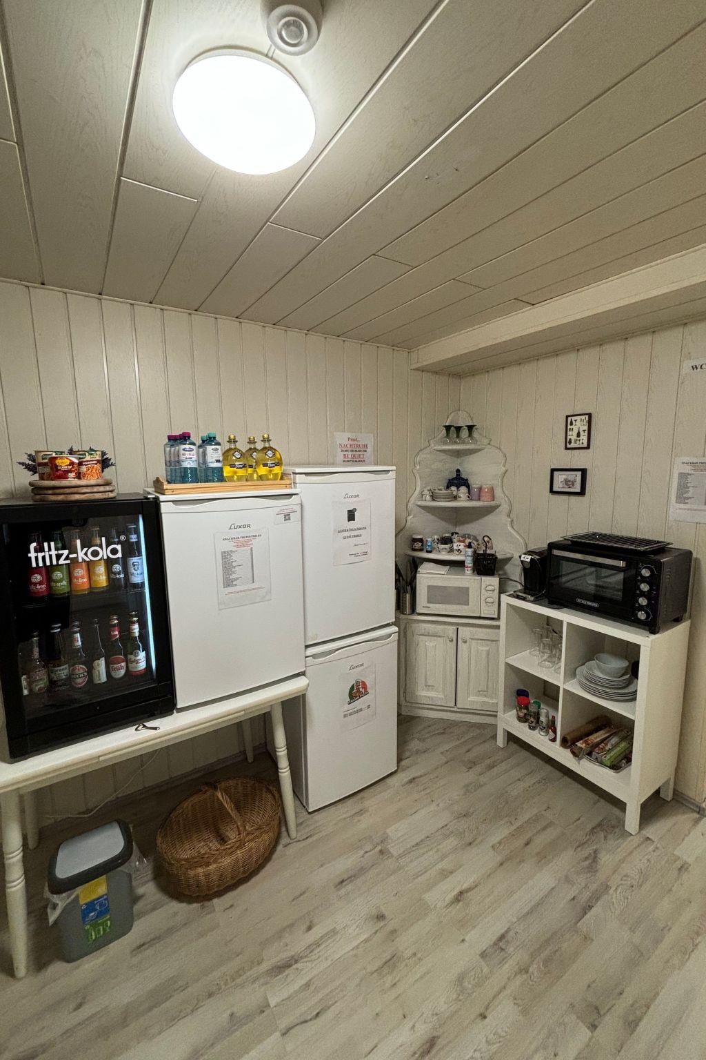 Your physical well-being is also taken care of - a coffee snack bar with fridges and a freezer is at your disposal. Here you can stock up on hot and cold drinks or satisfy your hunger with snacks and pizza, which you can bake in the pizza oven. Two bathrooms including a toilet, which may be shared with other guests, ensure that your morning starts without a rush.