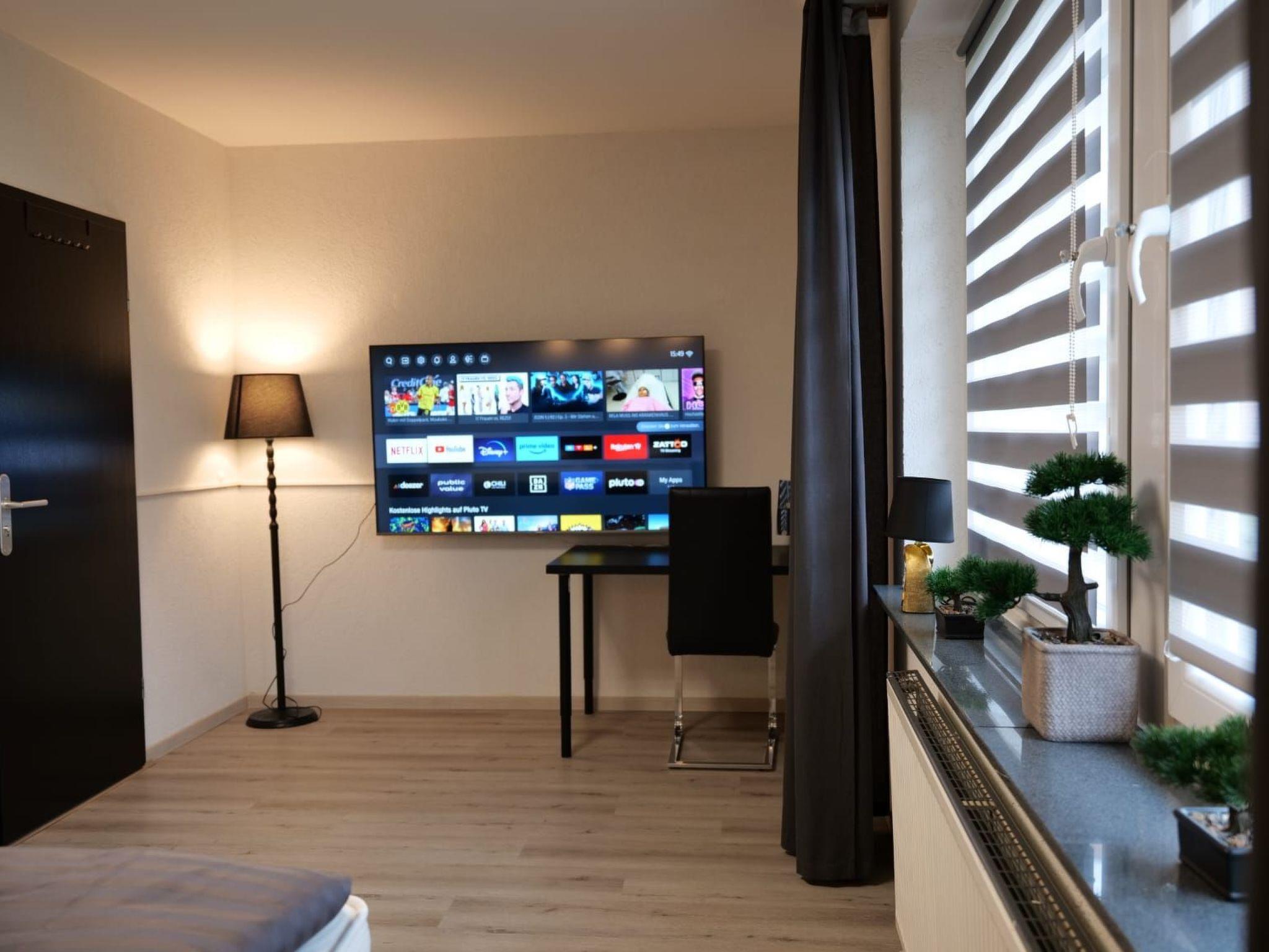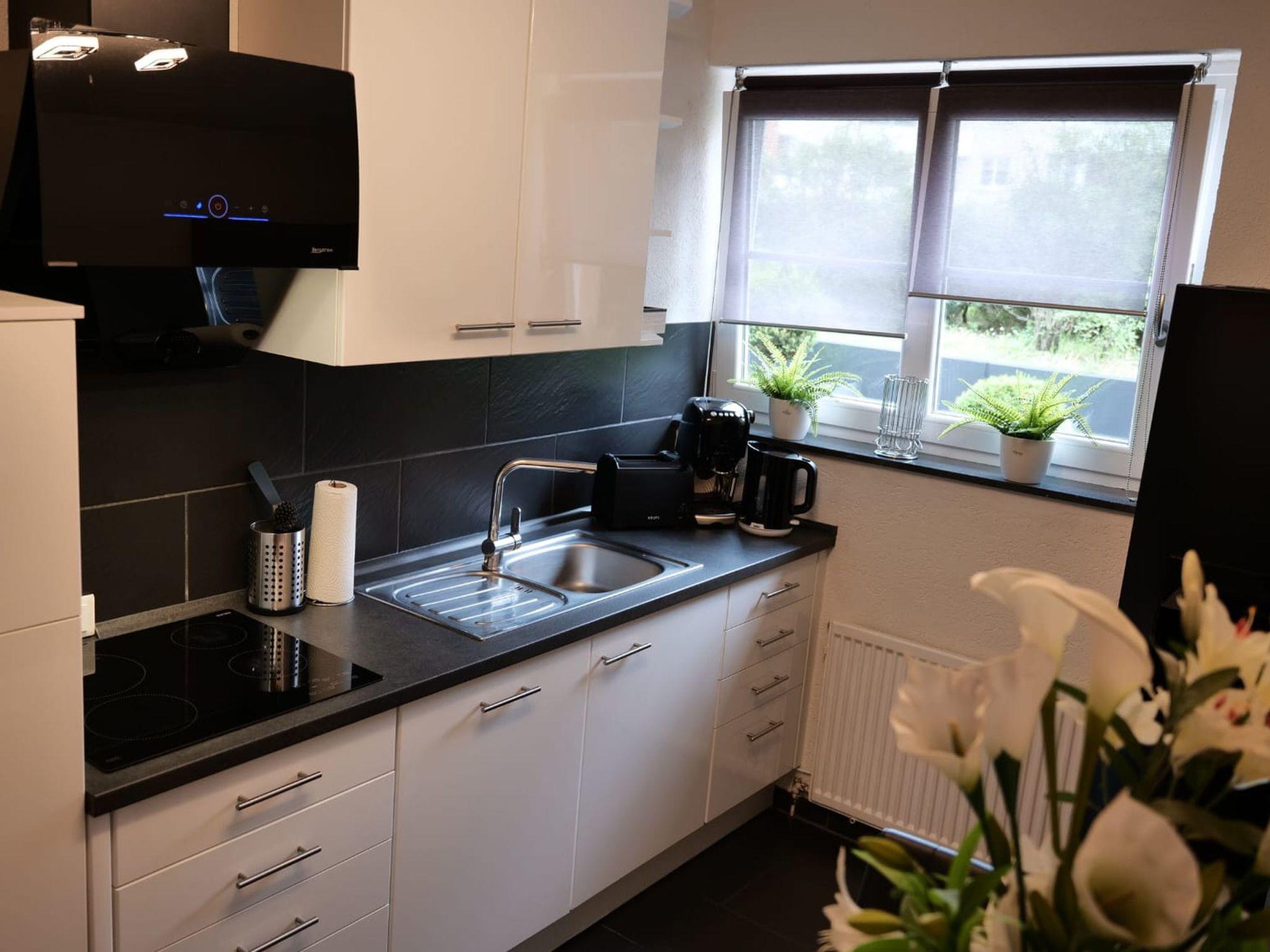 In the living room, you can make yourself comfortable on the large sofa area and either enjoy the peace and quiet with a view of the fireplace or be entertained by the 75-inch Smart TV. Connected to the living room is the high-quality designer kitchen with brand-name appliances and a side-by-side fridge with freezer, as well as a guest WC.