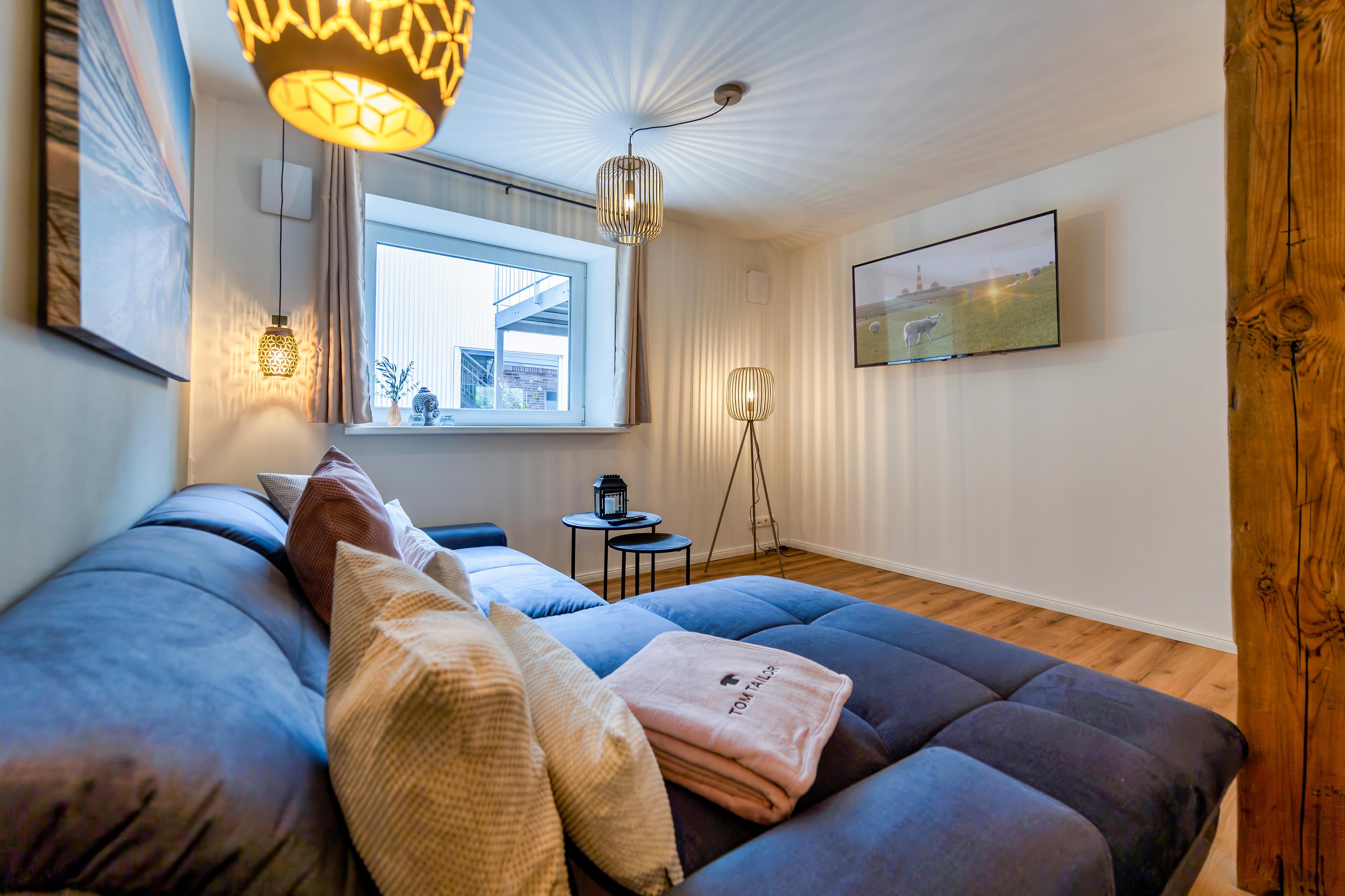 Eine Fußbodenheizung sorgt im ganzen Haus für wohlige Wärme und eine Klimaanlage rundet das ganze ab. In den stilvollen Bädern finden Sie bodengleiche Duschen und Infrarotkabinen, die nach einem erfrischenden Tag an der Nordsee zum Aufwärmen einladen. Genießen Sie ein Glas Wein bei Kerzenschein im großen Whirlpool und entspannen Sie anschließend im bequemen Boxspringbett, vielleicht mit einem Film auf dem großen Flachbildfernseher.